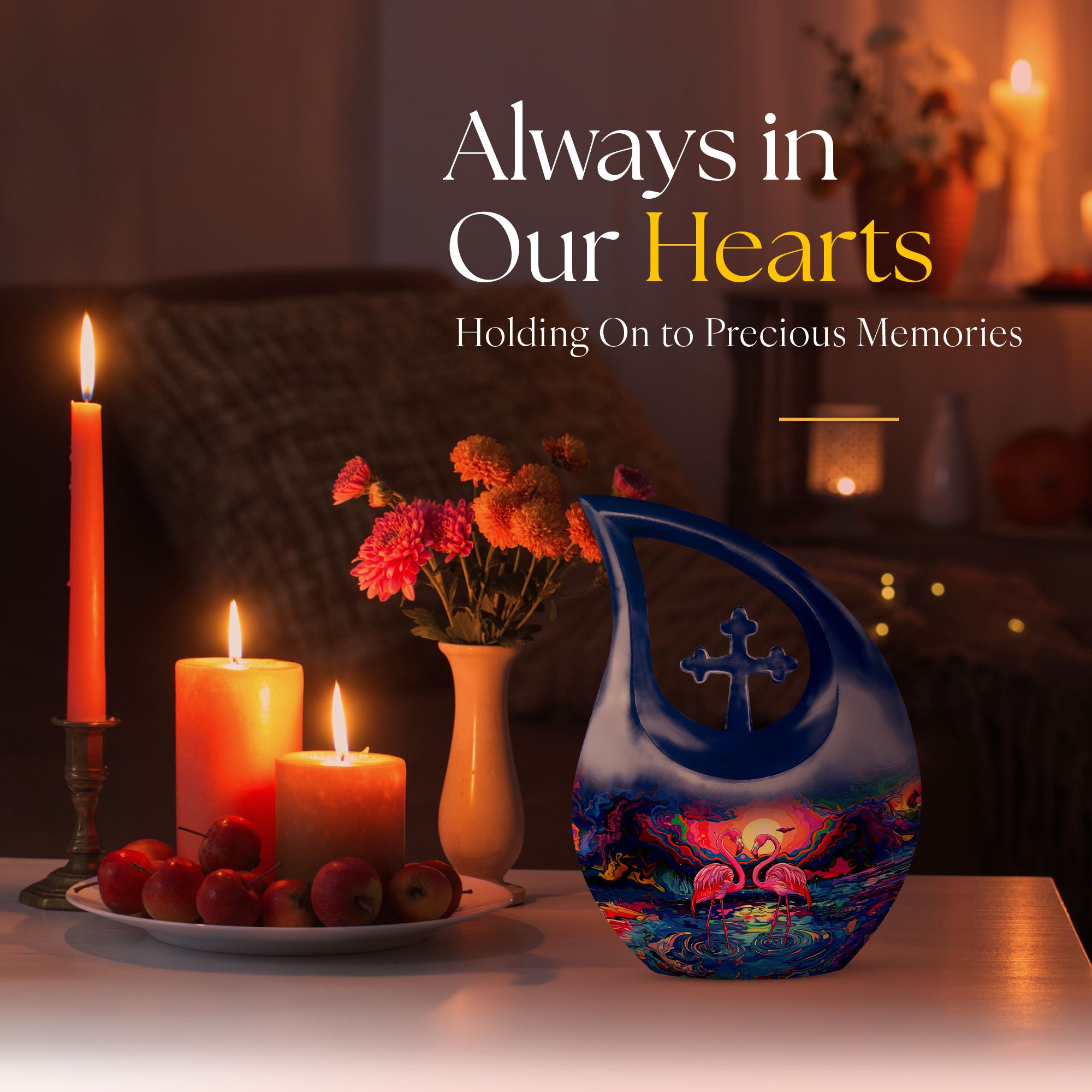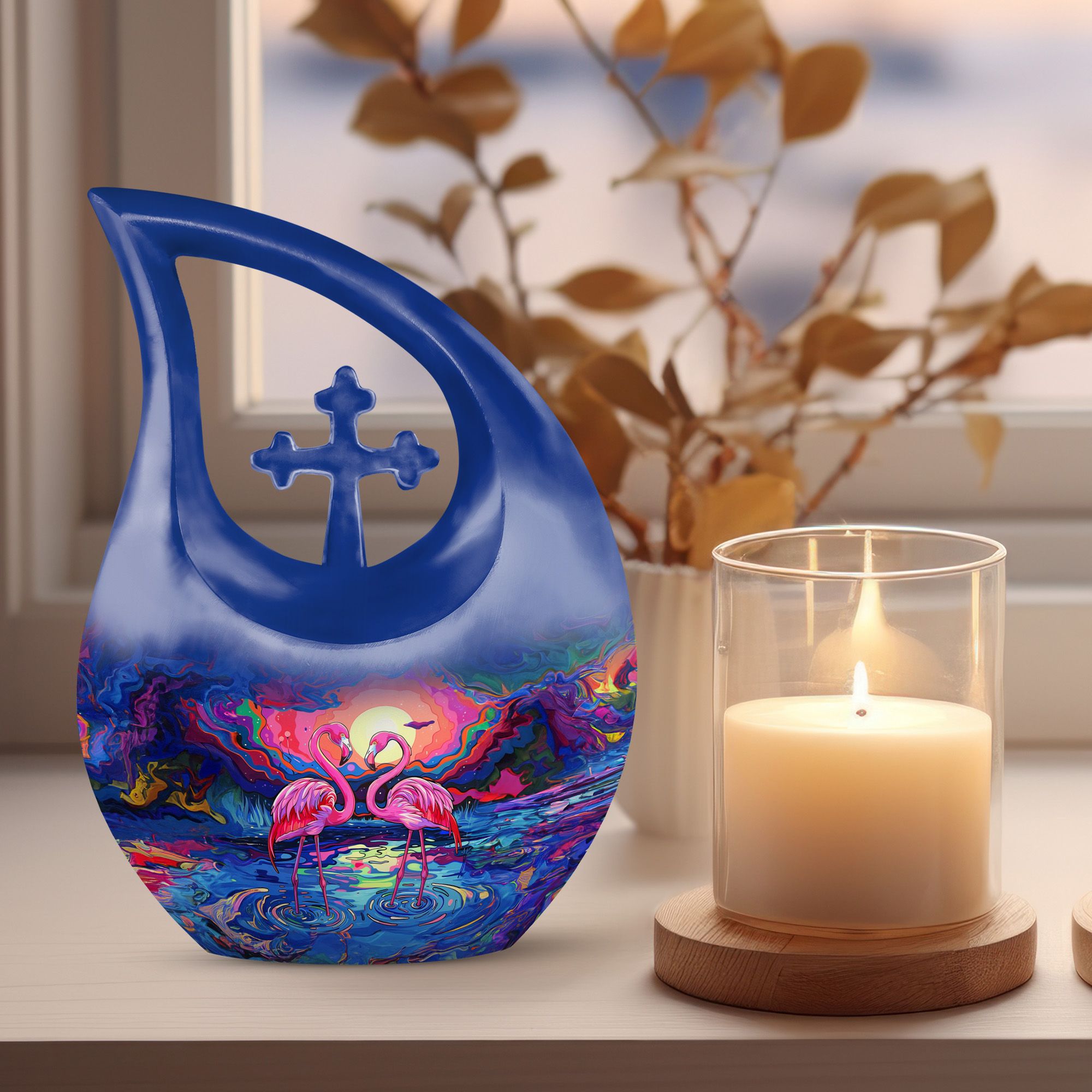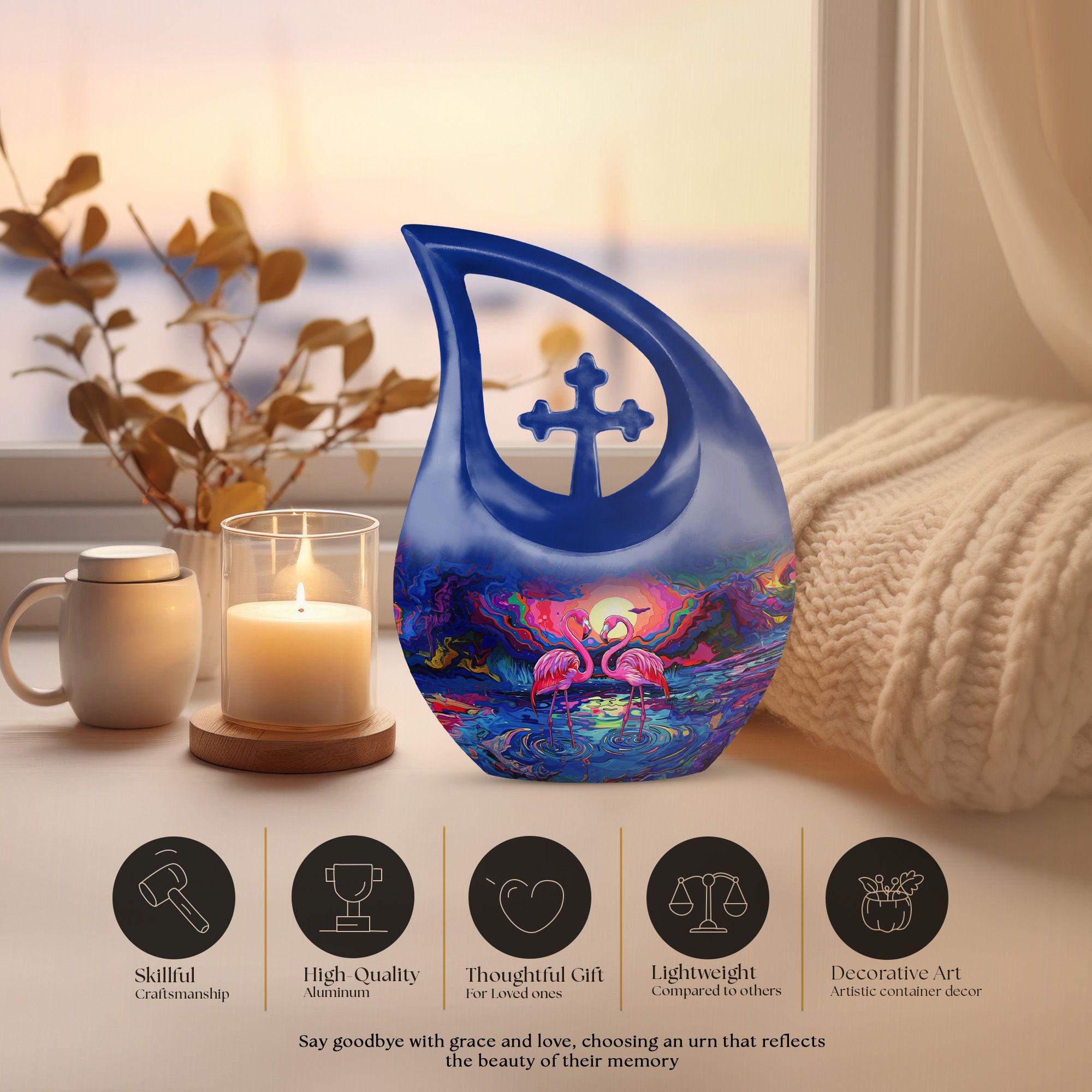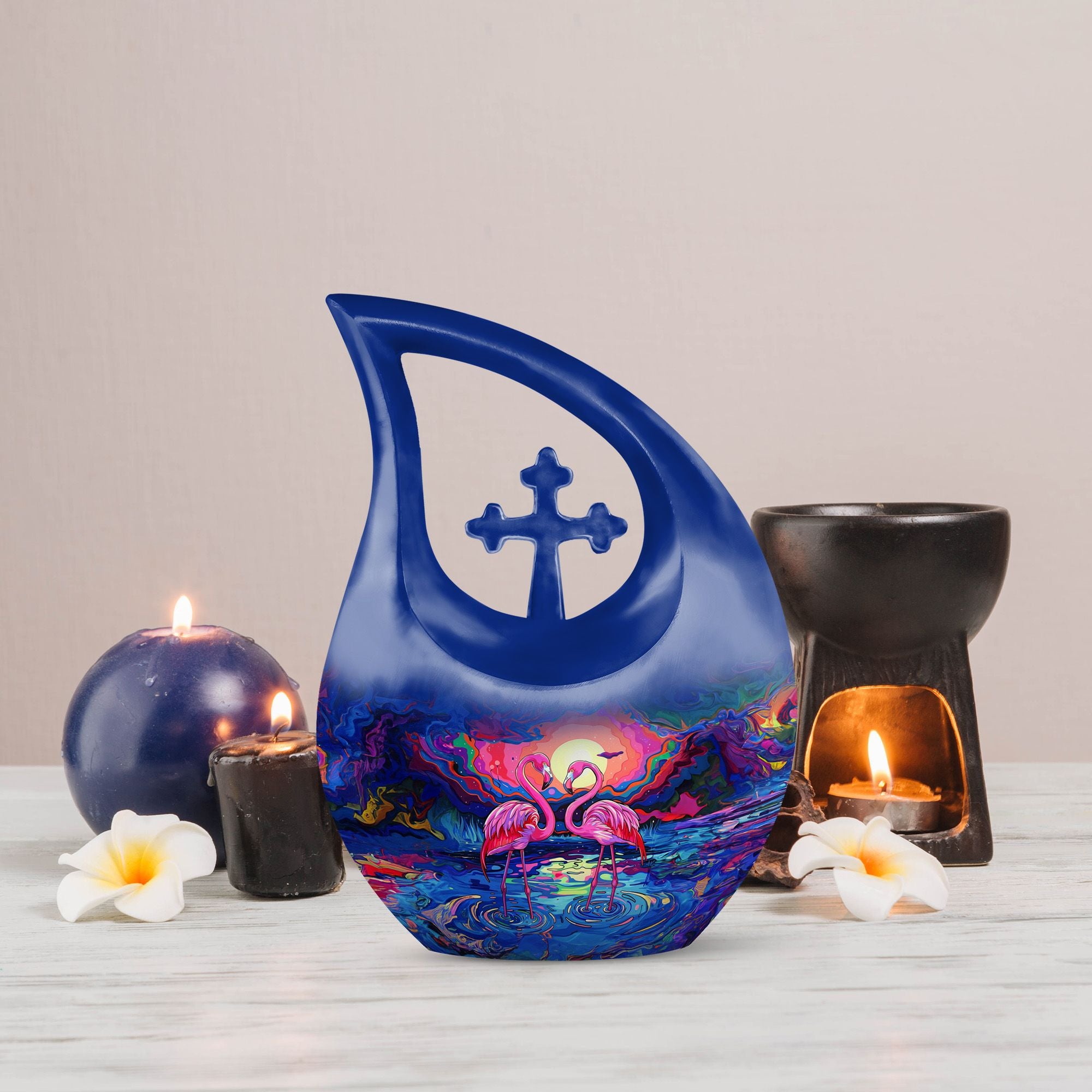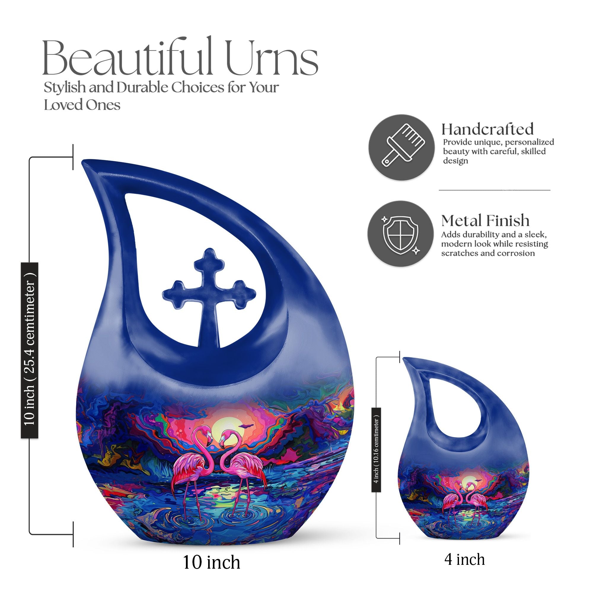 Experience an exceptional tribute to your loved ones with our Vibrant Flamingo Fantasy Urn, widely acknowledged as one of the most popular cremation urns that combine beauty and durability. Constructed from high-quality aluminium, this 10-inch Urn exudes a Cross Drop design, portraying a serene and respectful solemnity. Its size is ideal, boasting a capacity of 200 cubic inches--an equatable size to house remains of two adults comfortably. Weighing just 3.3 pounds, this large urn is both easy to handle and substantial. It comes with a velvet pouch, ensuring careful and dignified containment of ashes. To create a truly unique memorial, it can be customized with engraved names, turning it into a meaningful keepsake. This urn fits exceptionally well with the memorial urns theme, making it an ideal ashes holder. Apart from being a compelling choice for personal use, it also makes an appropriate gift for seniors and adults looking for a respectful way to commemorate their loved ones.
