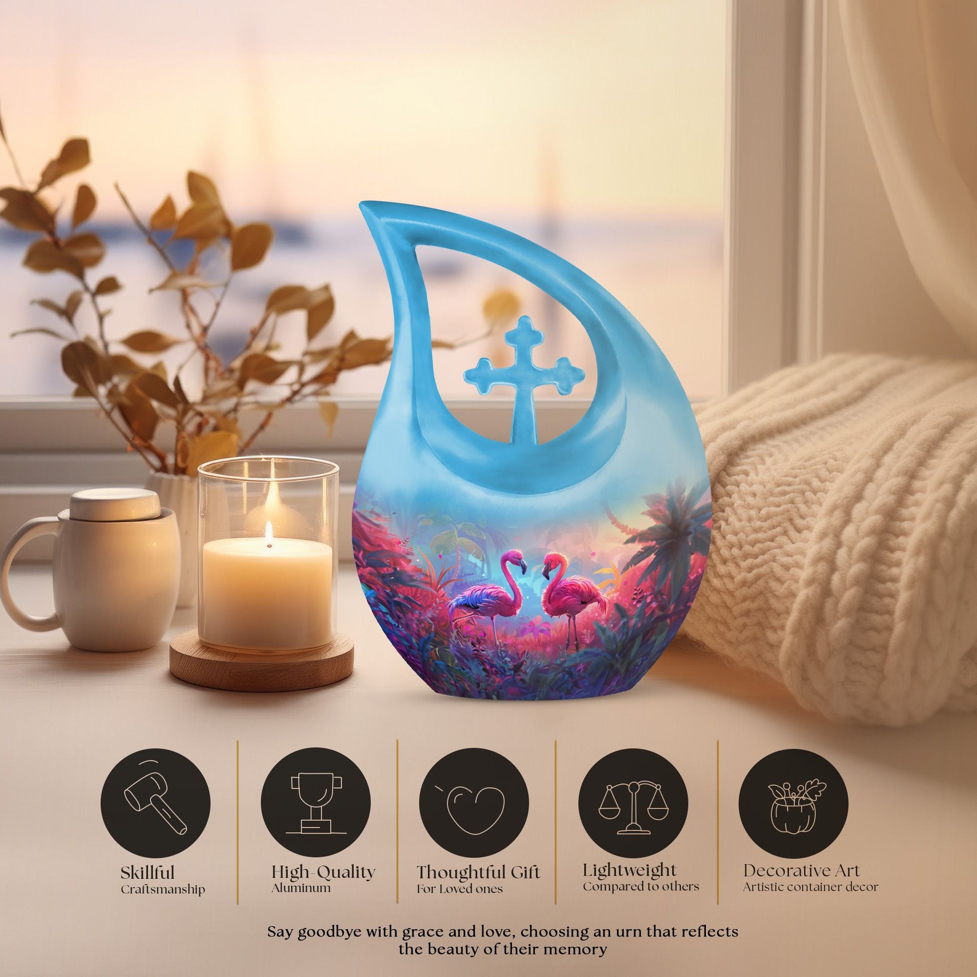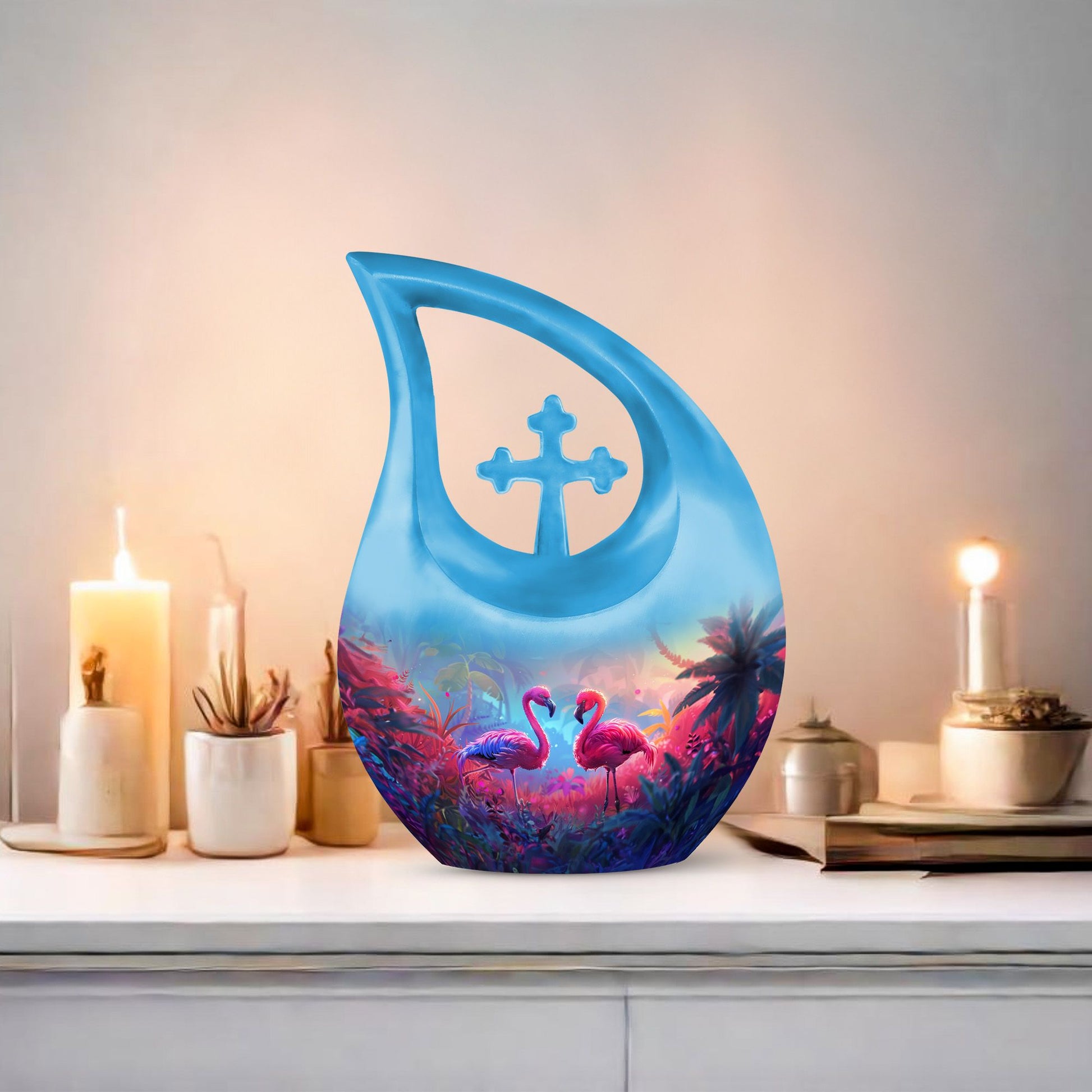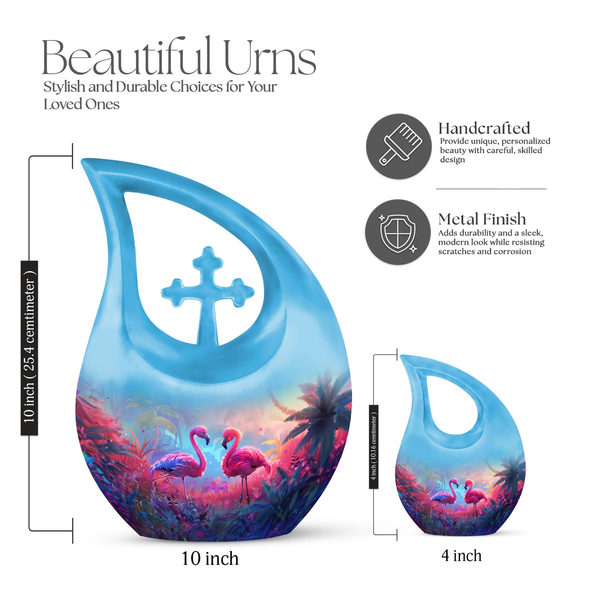 Cherish the memories of your departed loved one with our unique Mystical Flamingo Twilight Urn, the perfect way to pay a lasting tribute. This Large urn, which stands at 10 inches and weighs 3.3 pounds, is simply not an ordinary memorial urn. Secured in a cross drop design, it offers timeless elegance, fashioned from high-quality aluminium for eternal durability. A capacity of 200 cubic inches allows for an ample amount of ashes to be contained, the urn indeed makes for an exceptional decoration of undying love and respect. What is even more touching is the fact that you can personalize it with engraved names, giving it a more intimate and affectionate appeal. The urn comes in a velvet pouch assuring the safe containment of the ashes. This one of a kind urn is perfect for those who wish to honor their cherished ones in a profound manner. Enriched with keywords such as 'Cremation Urns For Adults, Urns For Sale, Urns For Ashes For Mom, Engraved Urns', it's easy to find and ideal for those in search of Keepsakes For Ashes Of Loved Ones. The Mystical Flamingo Twilight Urn resonates with the tranquility and peace, a true testament to the eternal love you hold for your loved ones.
