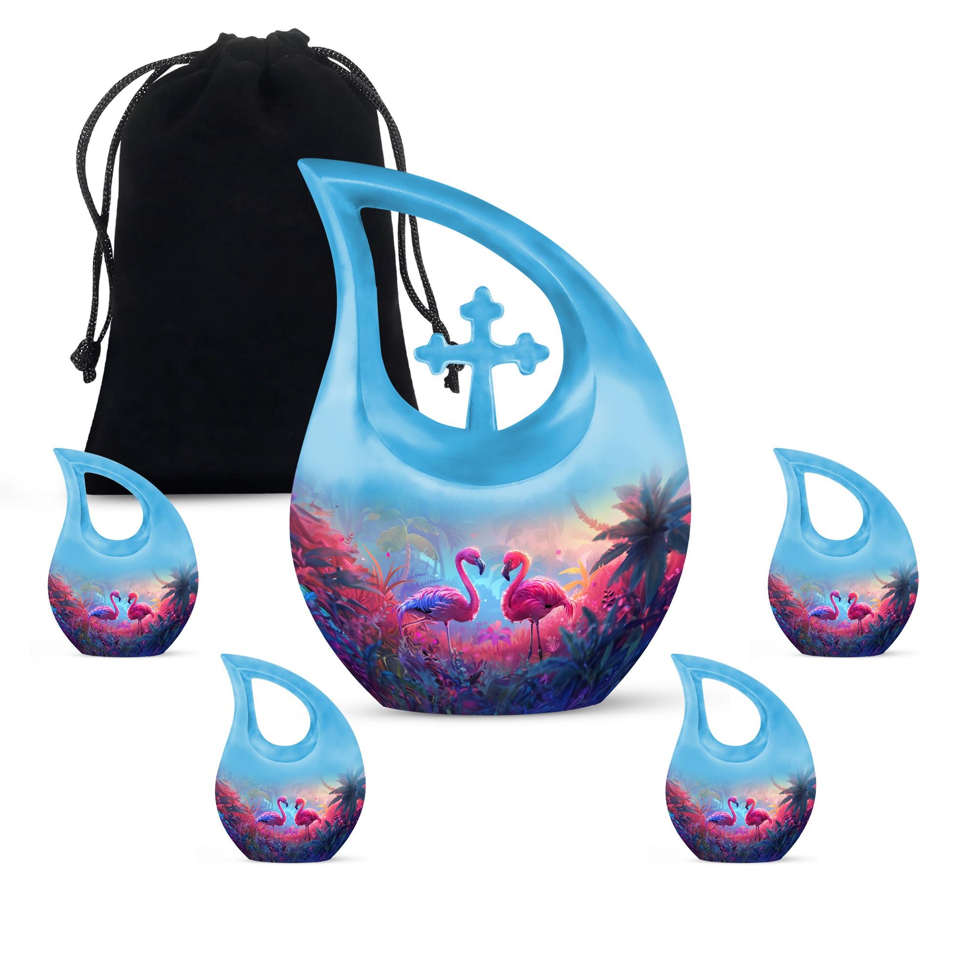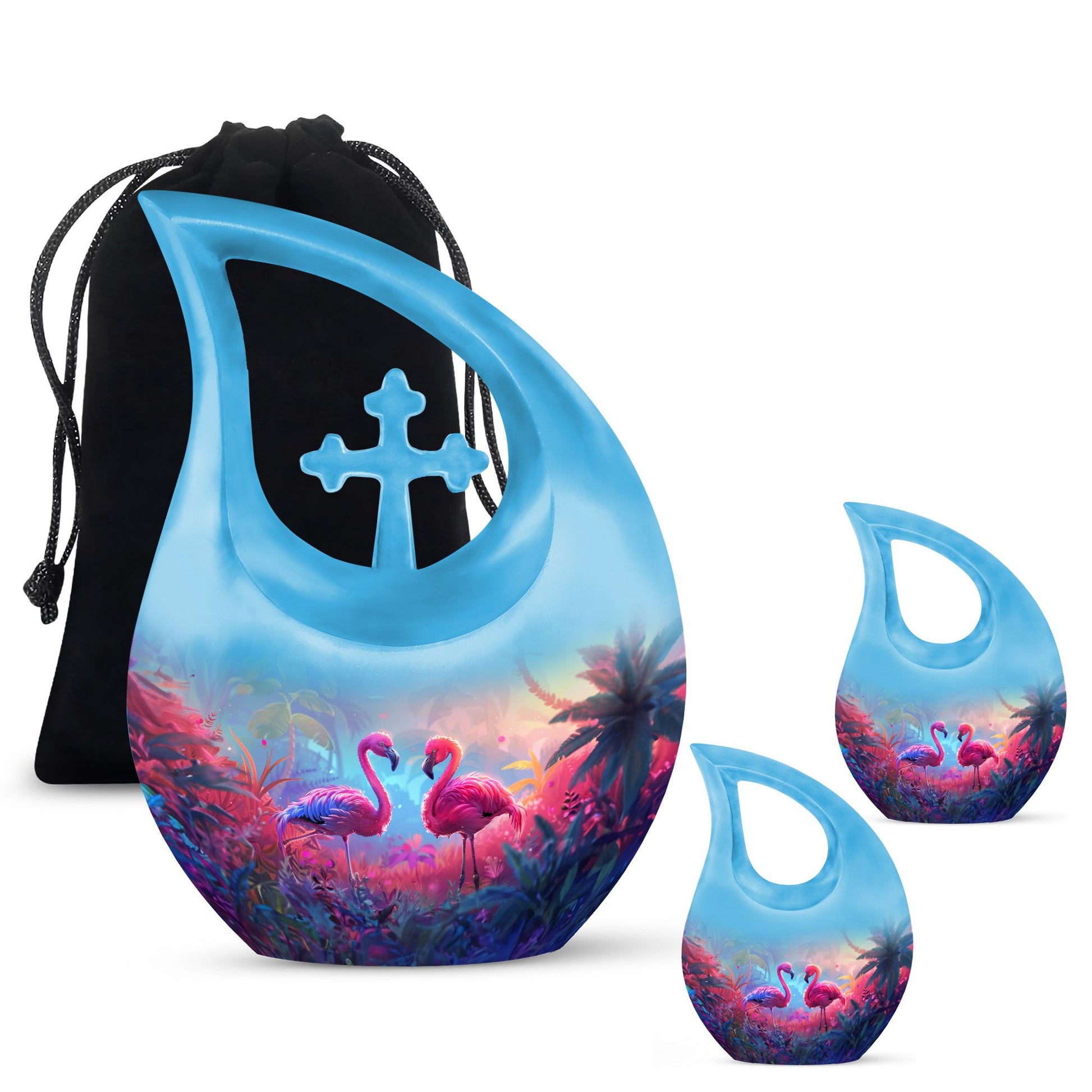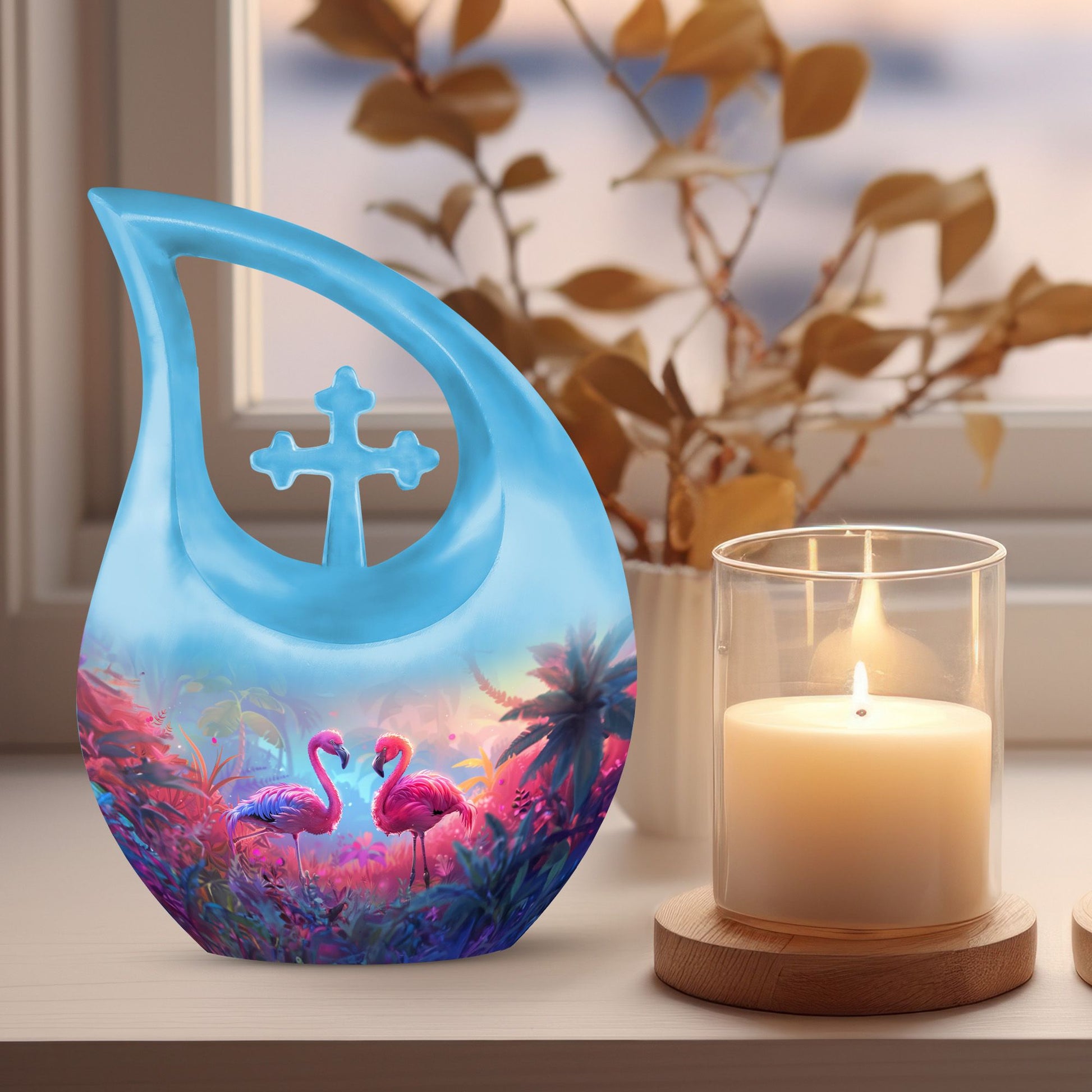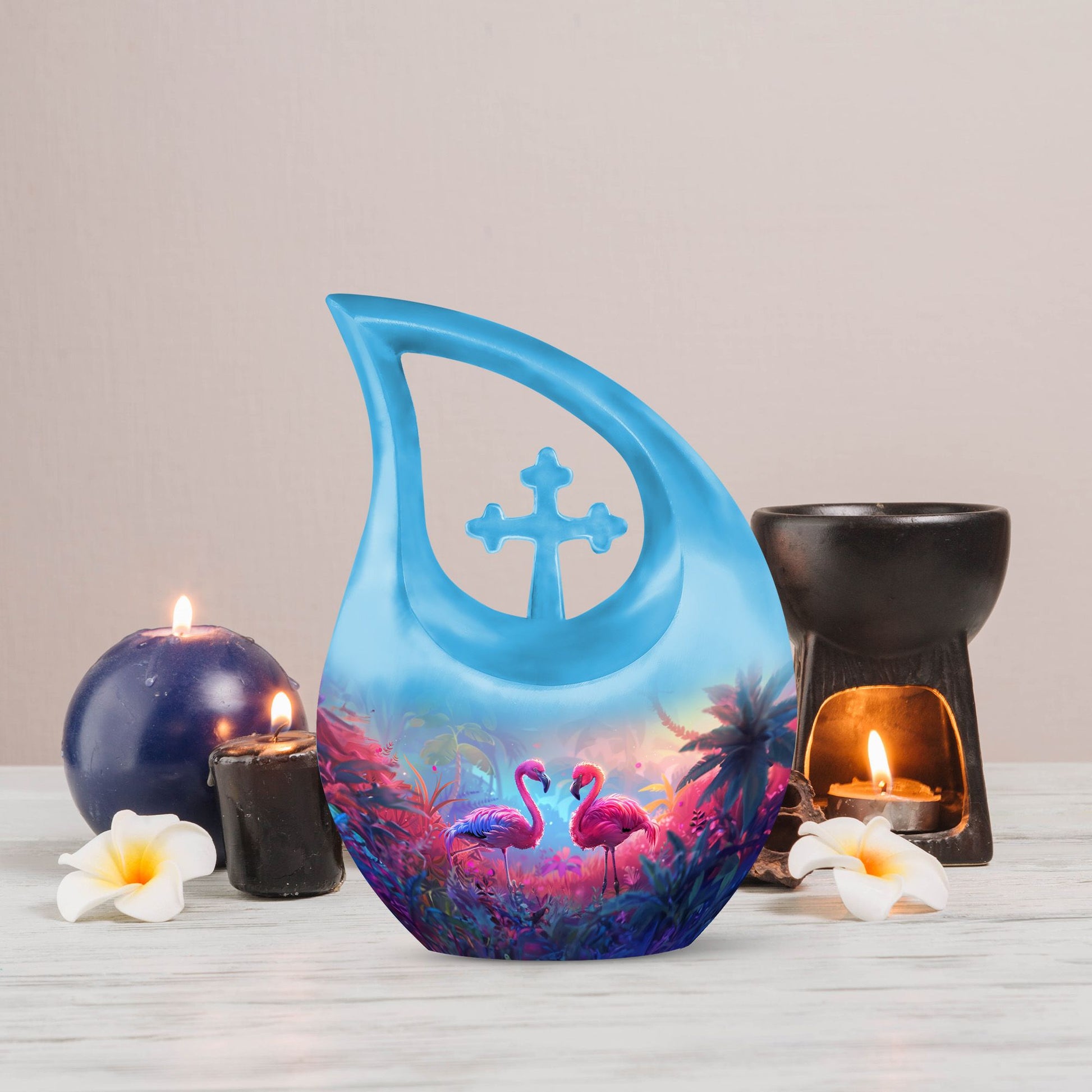 Cherish the memories of your departed loved one with our unique Mystical Flamingo Twilight Urn, the perfect way to pay a lasting tribute. This Large urn, which stands at 10 inches and weighs 3.3 pounds, is simply not an ordinary memorial urn. Secured in a cross drop design, it offers timeless elegance, fashioned from high-quality aluminium for eternal durability. A capacity of 200 cubic inches allows for an ample amount of ashes to be contained, the urn indeed makes for an exceptional decoration of undying love and respect. What is even more touching is the fact that you can personalize it with engraved names, giving it a more intimate and affectionate appeal. The urn comes in a velvet pouch assuring the safe containment of the ashes. This one of a kind urn is perfect for those who wish to honor their cherished ones in a profound manner. Enriched with keywords such as 'Cremation Urns For Adults, Urns For Sale, Urns For Ashes For Mom, Engraved Urns', it's easy to find and ideal for those in search of Keepsakes For Ashes Of Loved Ones. The Mystical Flamingo Twilight Urn resonates with the tranquility and peace, a true testament to the eternal love you hold for your loved ones.