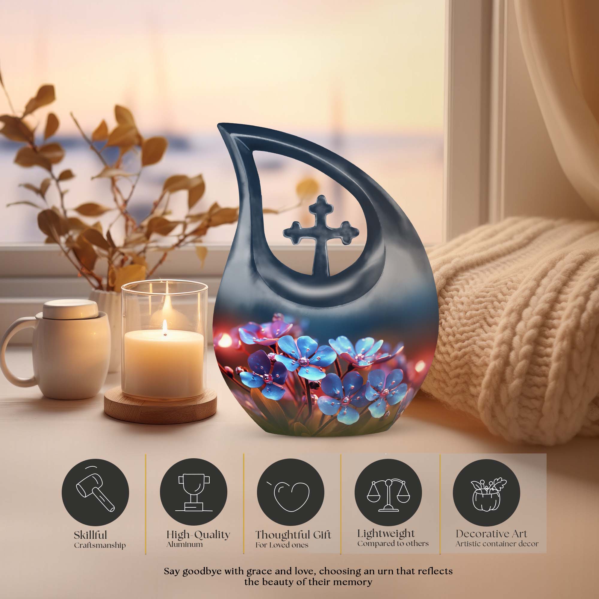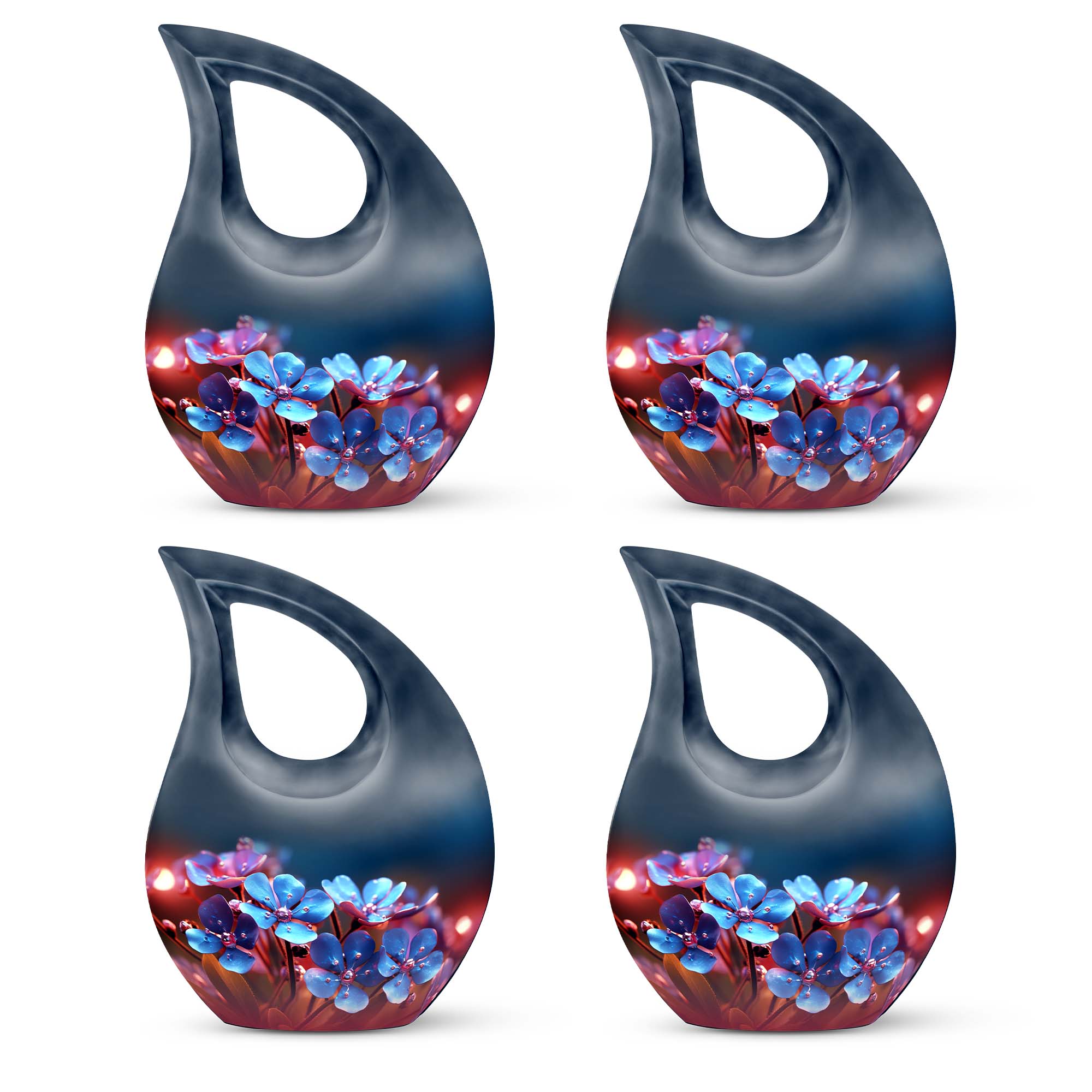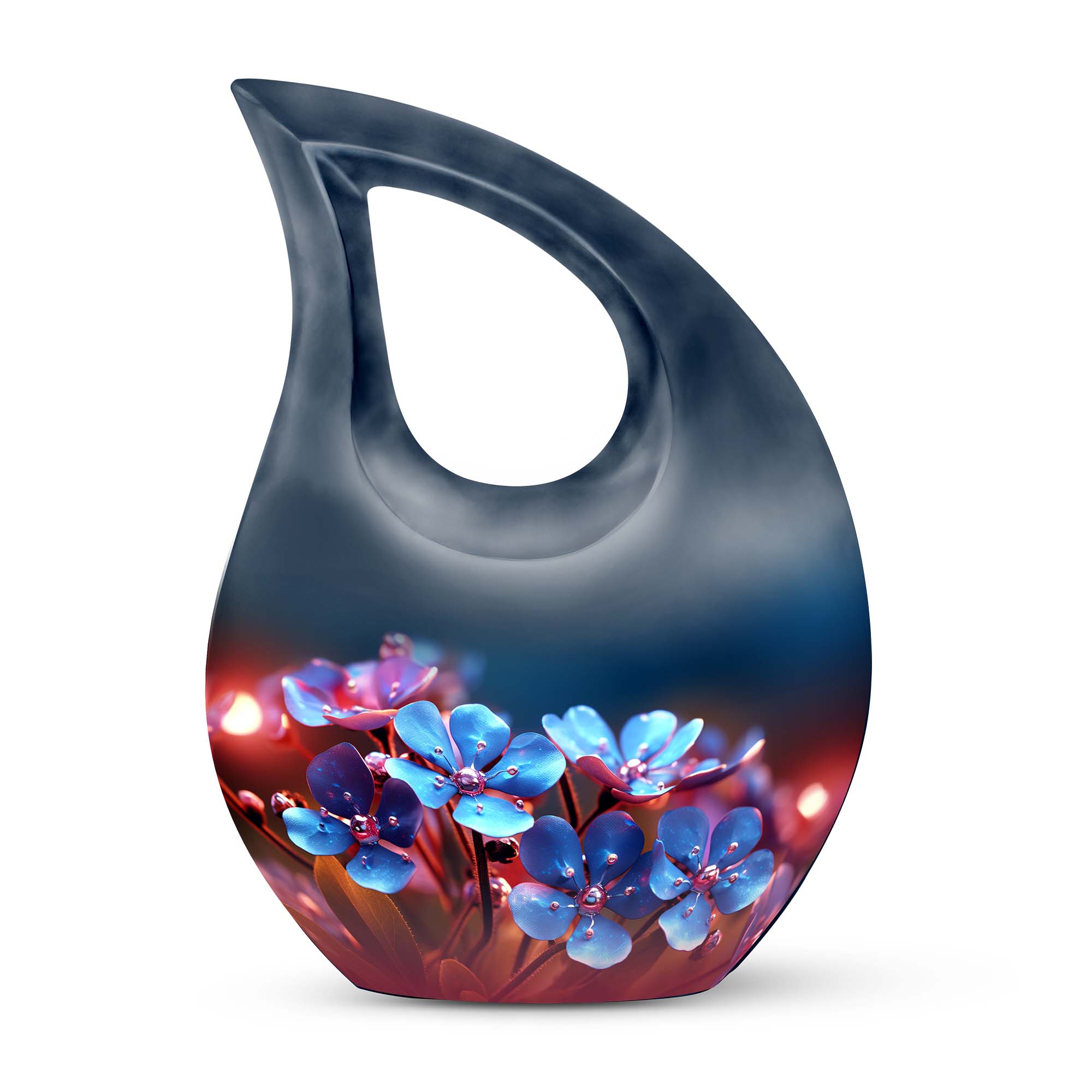 Crafted from premium-grade aluminum, this adult funeral urn features a serene blue floral design inspired by spring blossoms — a timeless reminder of peace and renewal. Its smooth finish, durable construction, and secure lid make it one of the most unique urns for human ashes, ideal for memorial services, display, or urns for burial in ground. The elegant detailing ensures a meaningful tribute for any loved one.