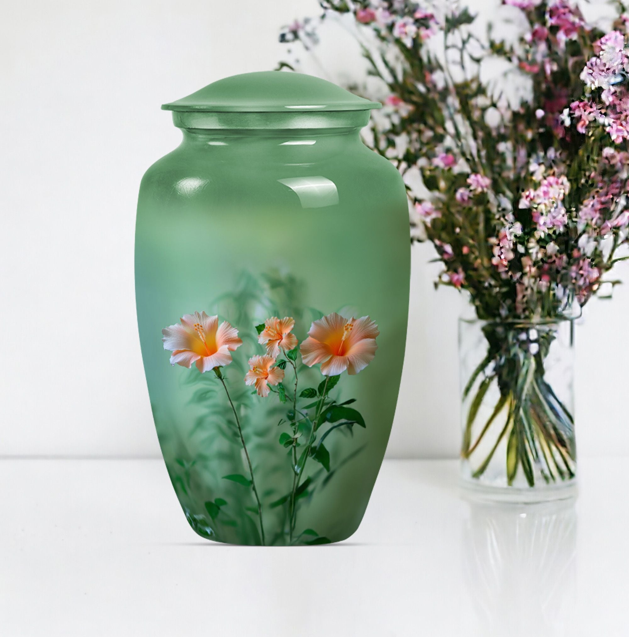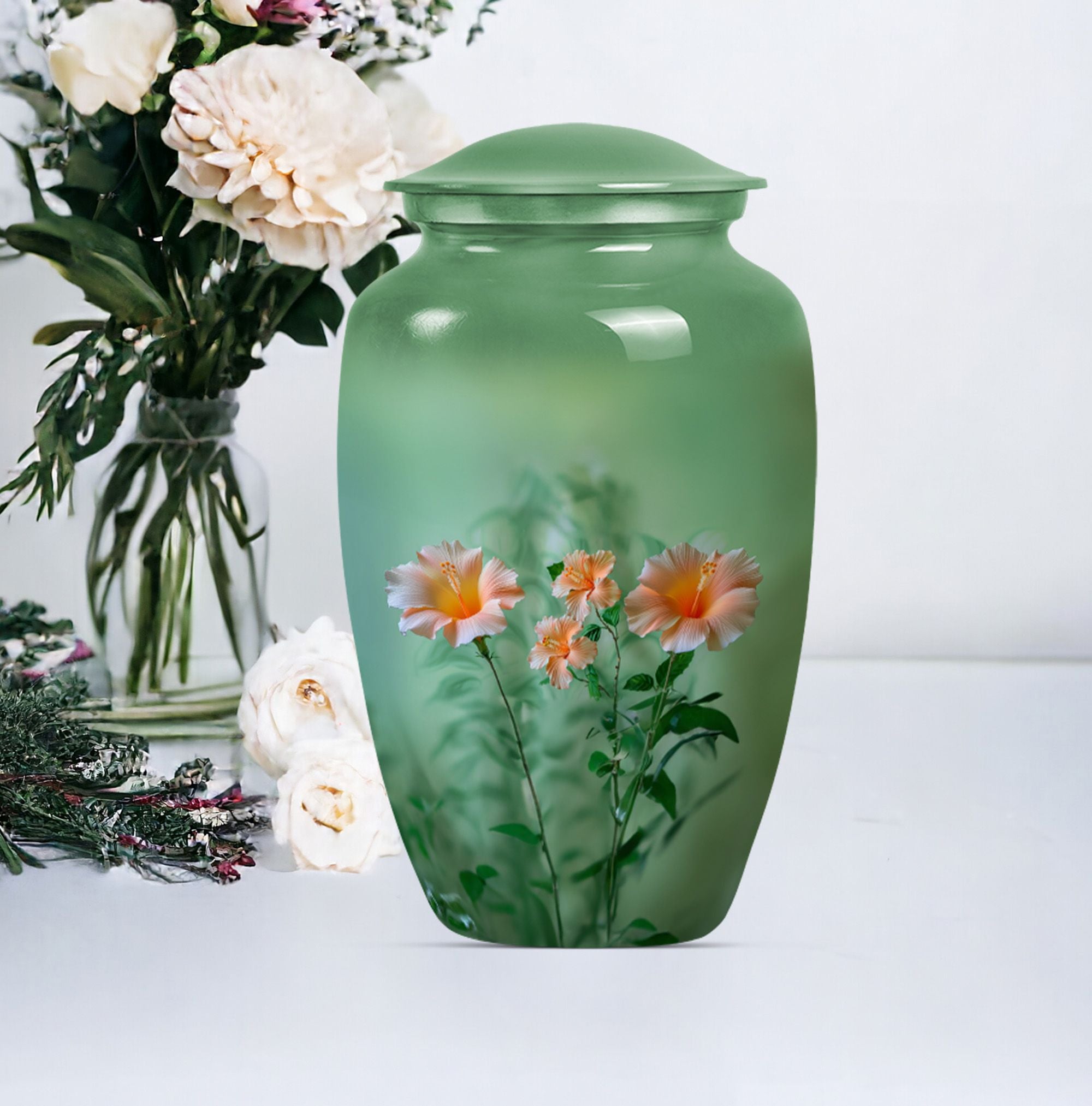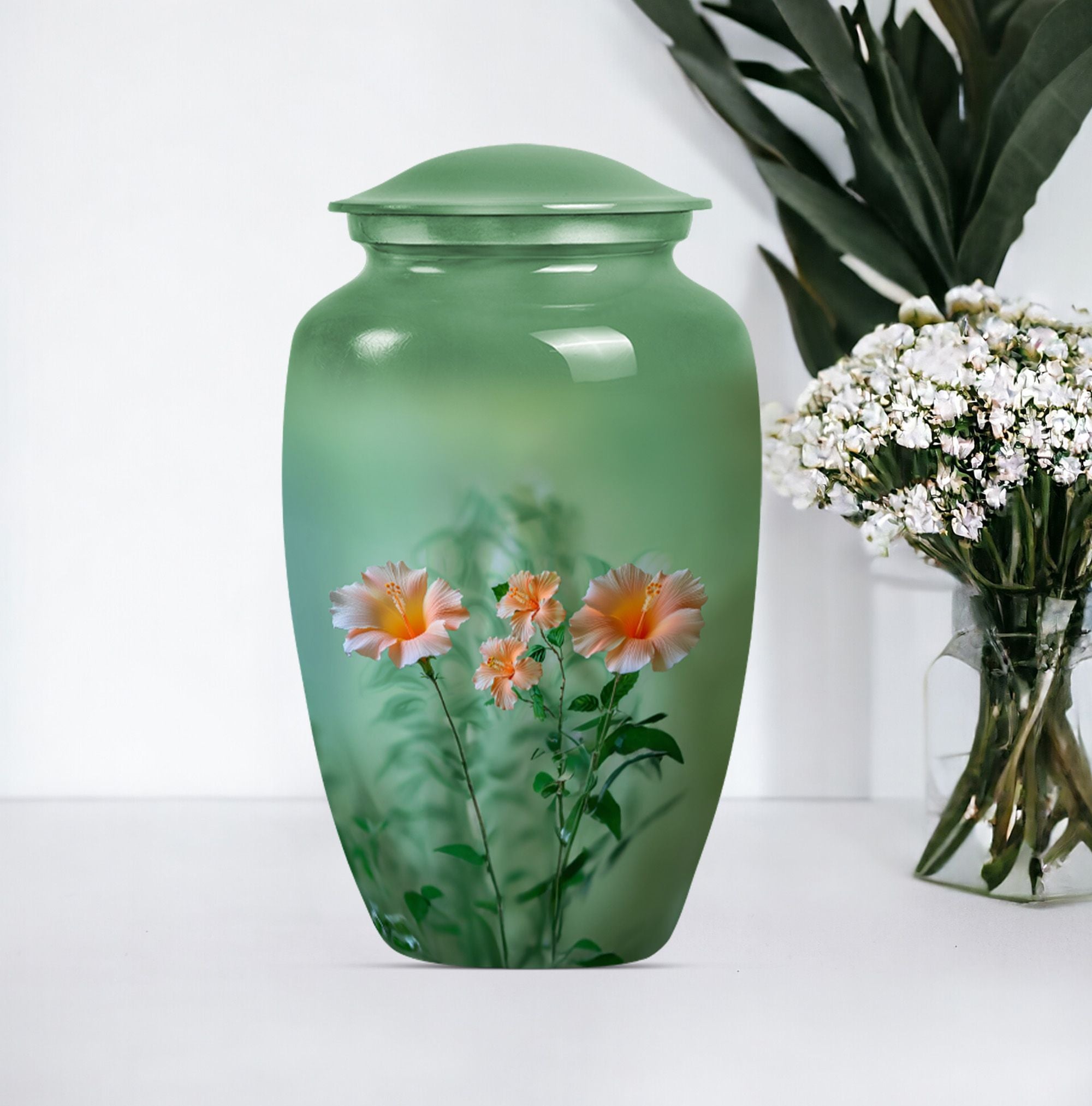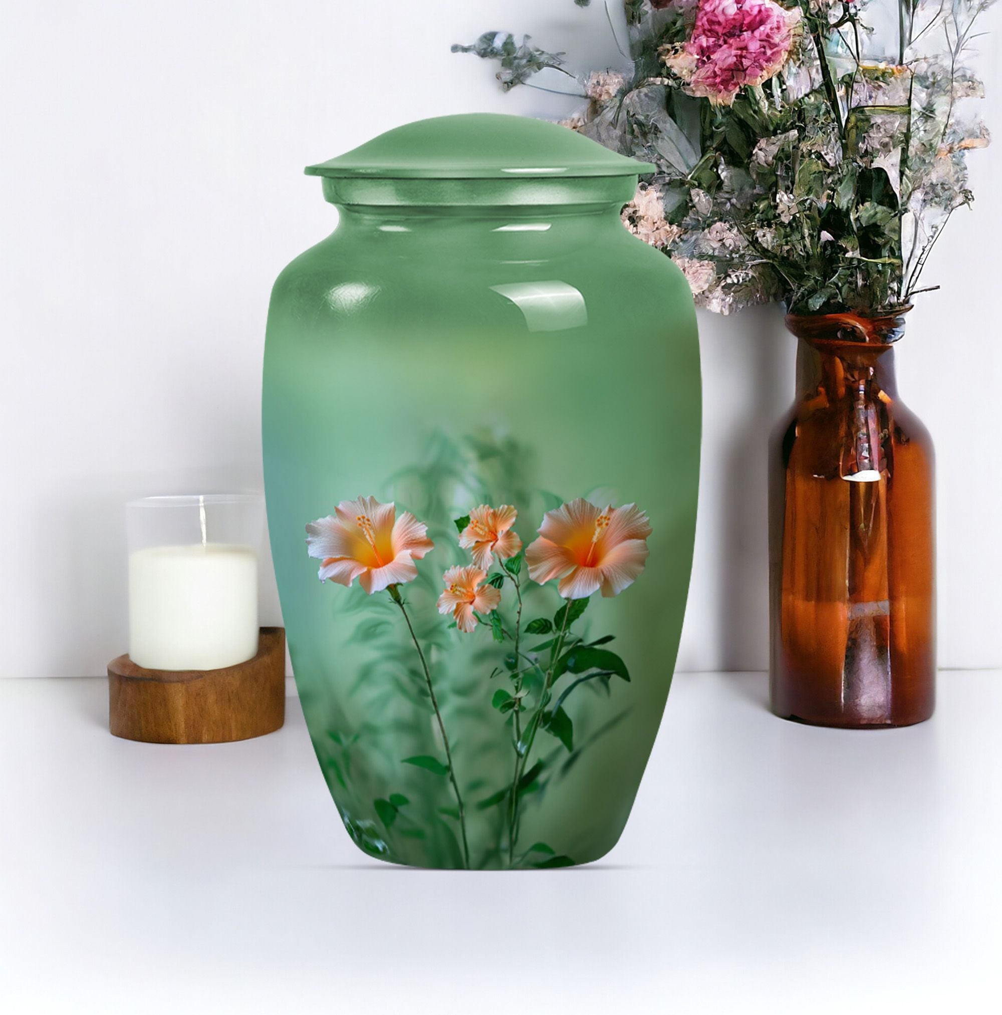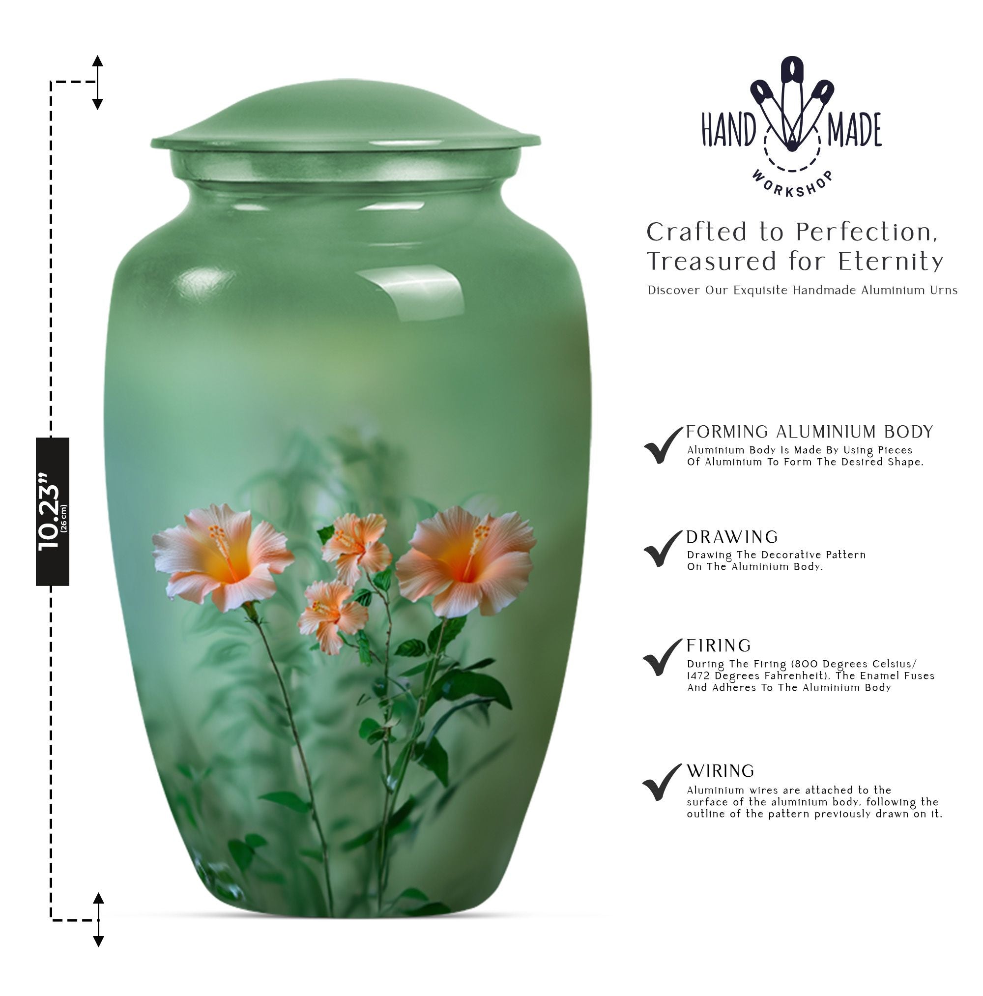Immerse yourself in a sense of tranquility as you avail of our pristinely crafted, Wolf Howling themed funereal urn. Sized 10 inches for a capacity of 200 cubic inches, this 'flowers Urn' seamlessly fits the ashes of an adult. We've creatively designed the piece with utmost mindfulness, ensuring it serves as a distinctive yet warm remembrance of your loved ones. Its construct of durable and high-quality Aluminium adds longevity, while its subtle weight of 3.3 pounds makes it easy to handle. This funeral urn for ashes for men can be personalized with engraved names, adding a touch of intimacy to an already profound memorial piece. Each urn comes with a velvet pouch for containment of ashes, adding an extra layer of security—thereby reflecting our attention to every minute detail. Whether you're looking for cremation urns, memorial human urns for ashes, traditional urns, burial urns, or metal urns, this urn plays multiple roles. Its classic urn design makes it a perfect fit for all kinds of ceremonial rites and events, enhancing the ambiance subtly yet significantly.