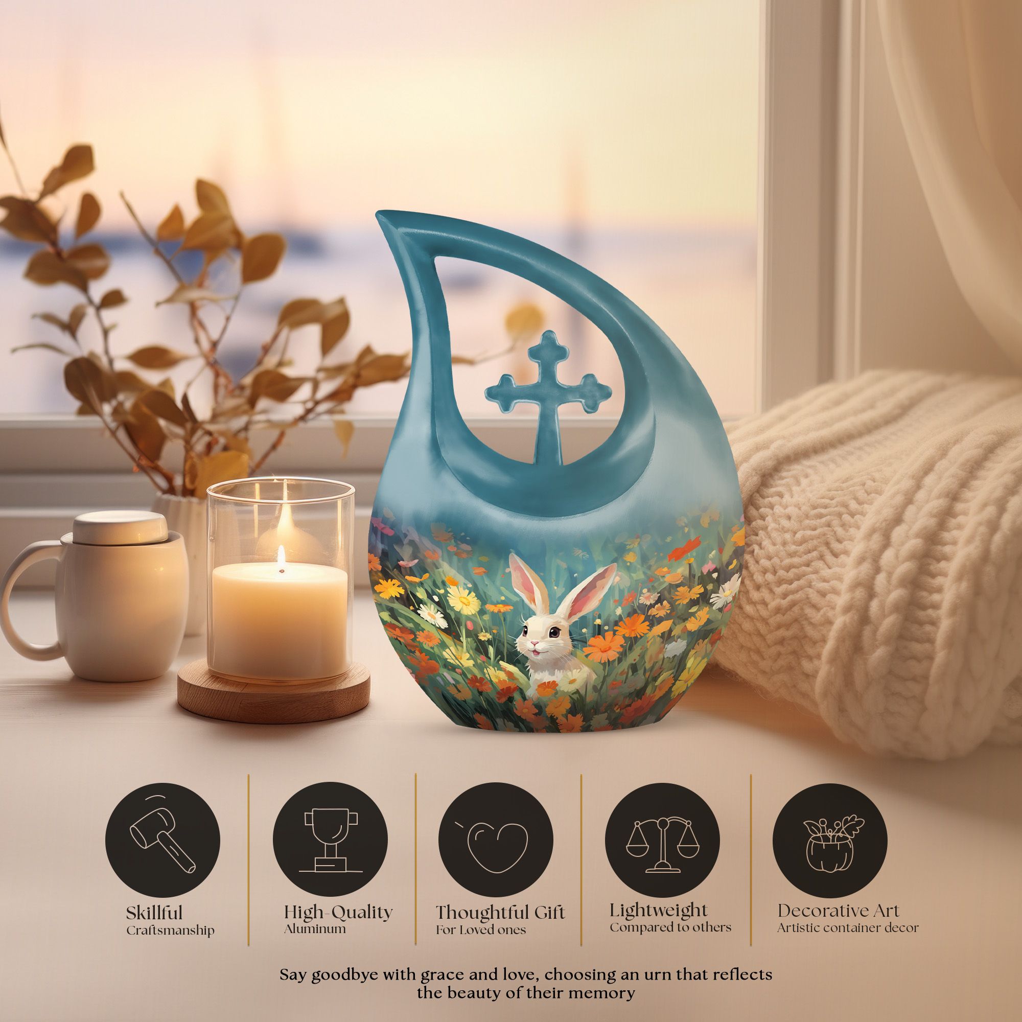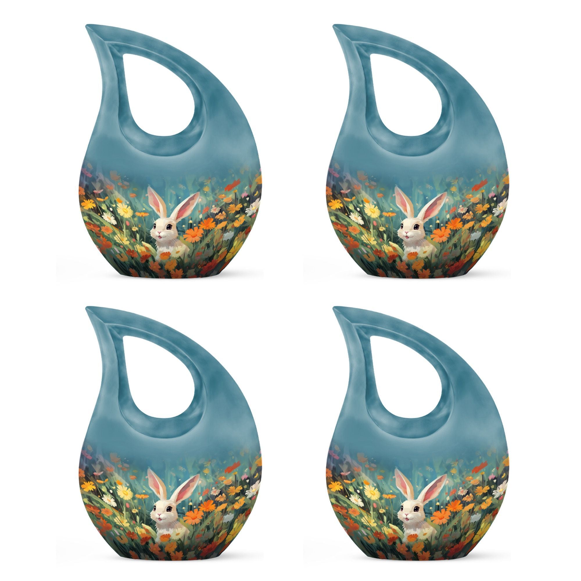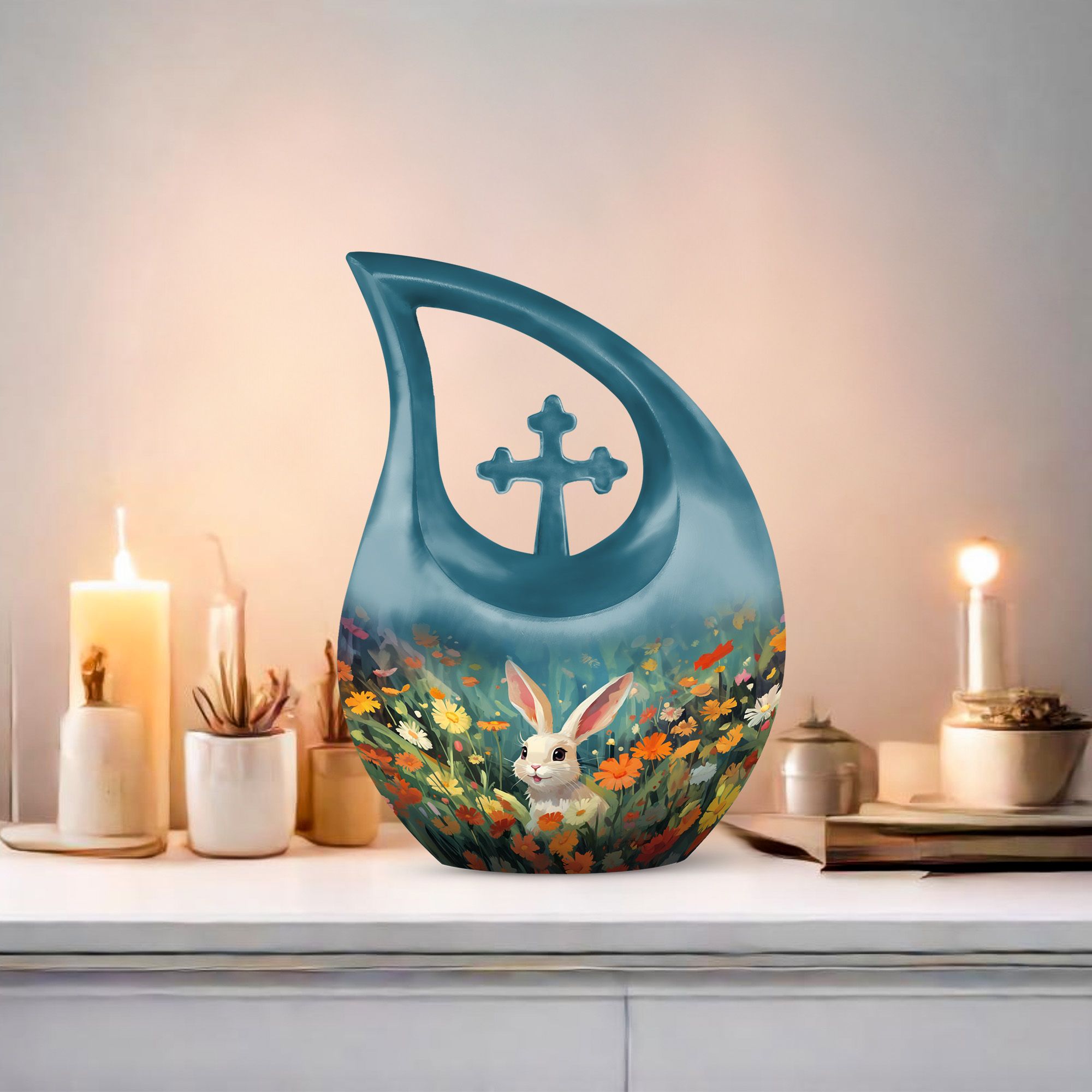 Cherish the unforgettable memories of your loved ones with our Colorful Flowers Rabbit Urn. Specially designed for couples, this 10-inch large urn offers a unique 'Cross Drop' theme that exudes tranquility and love. Skillfully crafted from durable, lightweight aluminium, it measures a considerable 200 cubic inches in capacity. It weighs an adequate 3.3 pounds, ensuring it exudes its heavy-duty characteristics whilst maintaining its elegance and sophistication. It comes with a plush velvet pouch that safely contains the ashes. Make it uniquely yours or, gift it to someone special by personalizing it with engraved names. As a versatile urn, it serves as a poignant memorial statement for your loved ones. Represent your love in a beautiful yet subtle way with our personalized urns for ashes. Whether you’re searching for modern urns for human ashes, small keepsake urns, or urns for sale near you; Our Colorful Flowers Rabbit Urn serves a variety of needs, providing lifelong commemorations. Note: This urn design doesn't include the 'Design'.