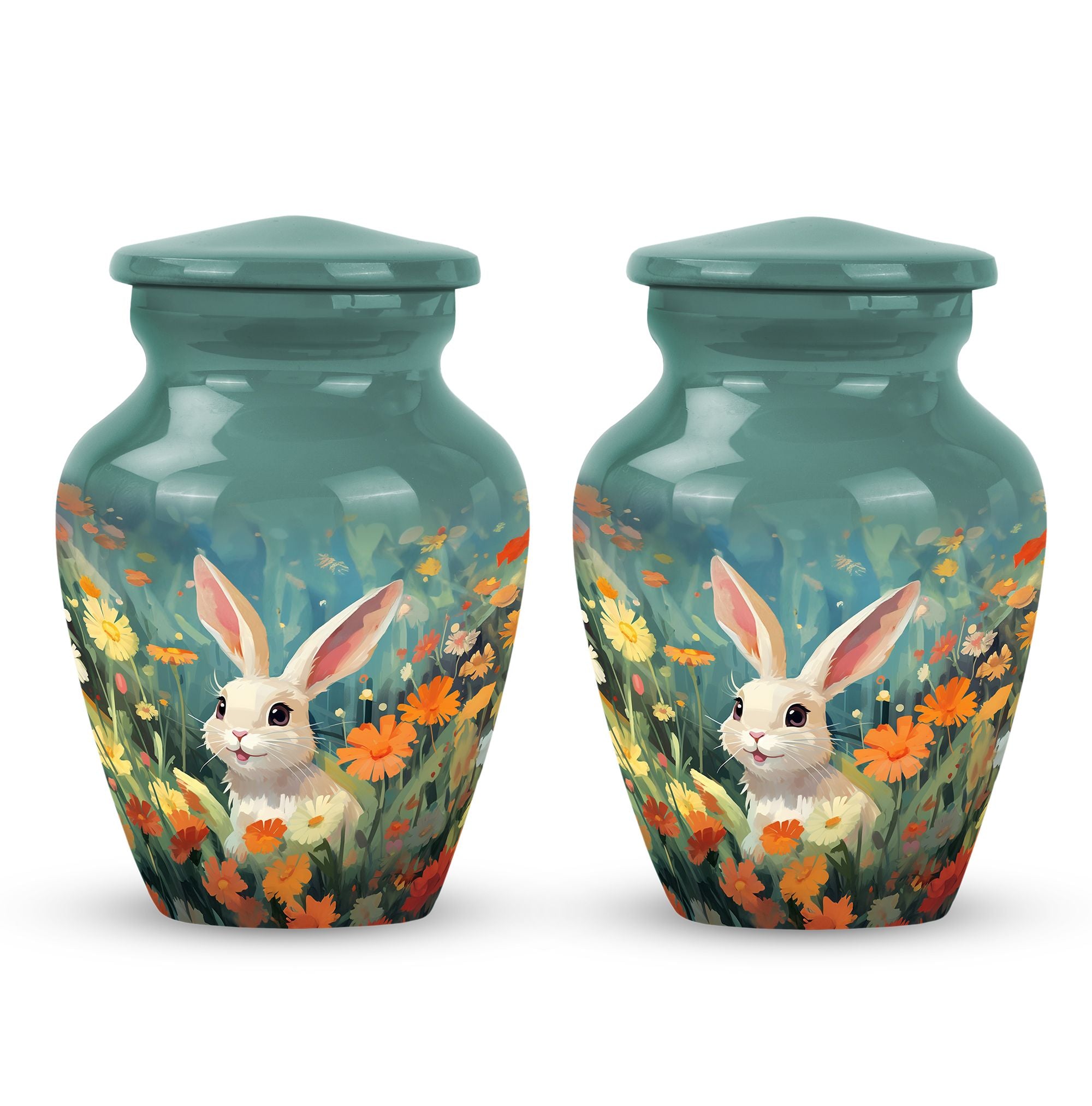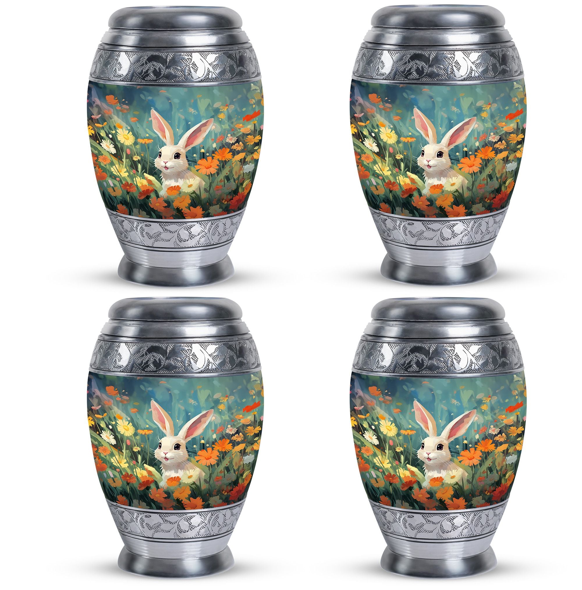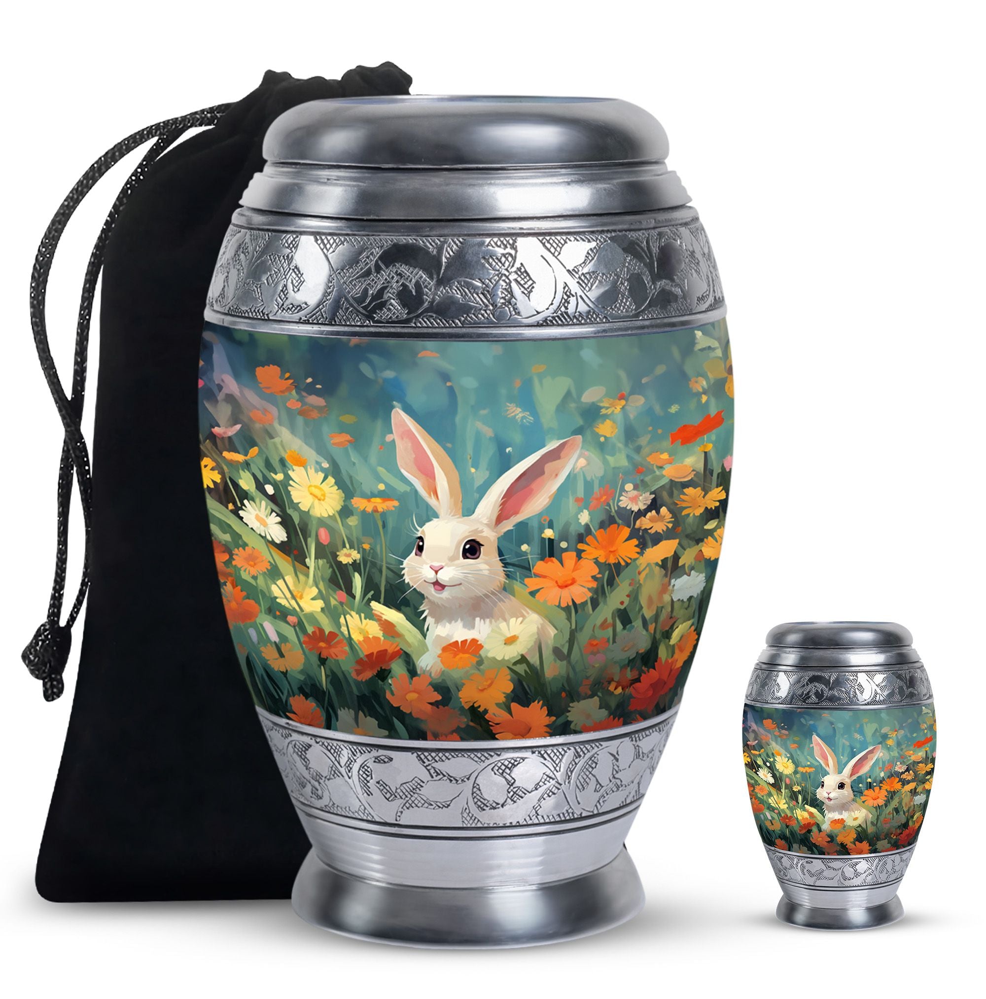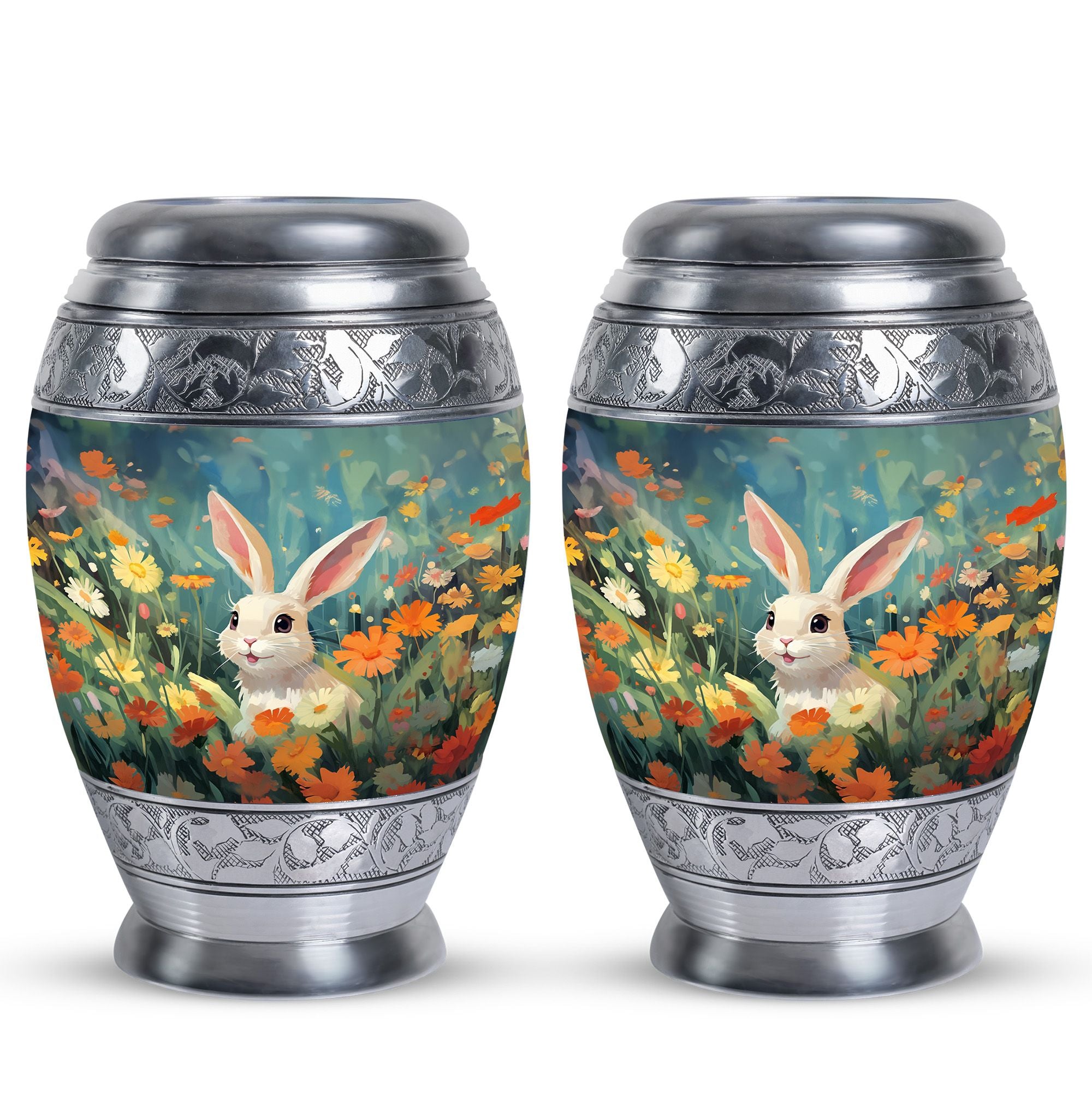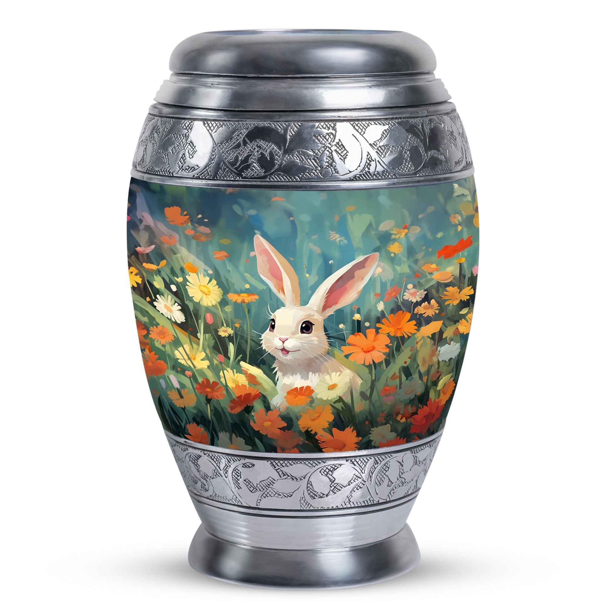 Crafted with care, this urn for pet ashes features a durable aluminium build with vibrant floral patterns and a charming bunny motif. Its elegant design ensures it fits beautifully in any home or garden, while the secure screw-top lid guarantees the safekeeping of ashes. Ideal for small urns for pet ashes or larger options, it combines functionality and artistry to create a timeless keepsake.