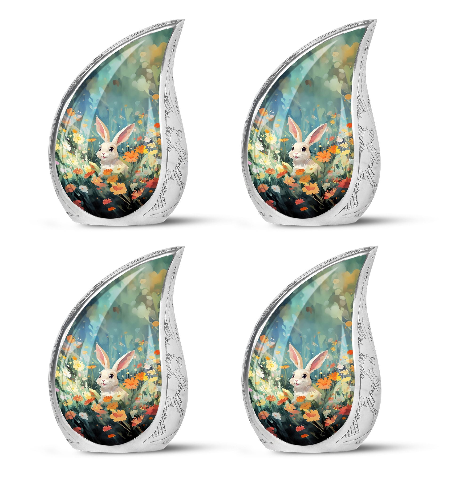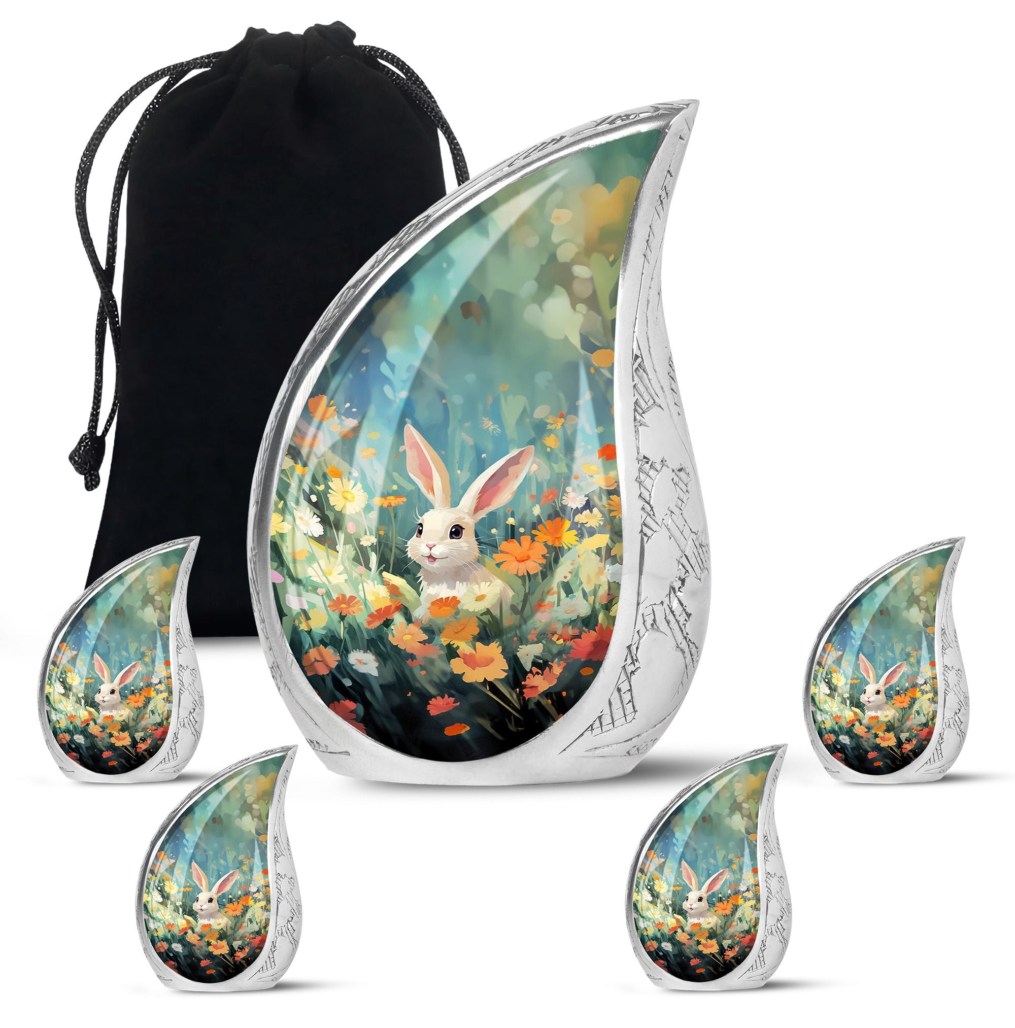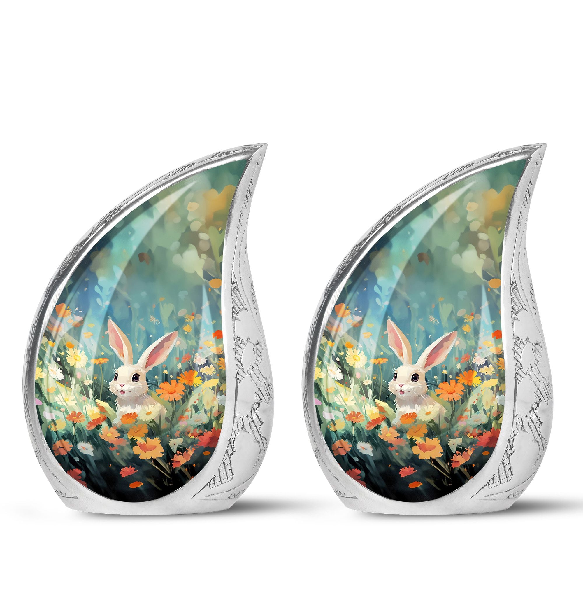 Cherish the memories of your loyal friend with this Colorful Flowers & Bunny Cremation Urn. Designed to celebrate the joy and love pets bring, this pet urn for ashes offers a heartfelt way to honor their memory. Perfect for families seeking pet urns for ashes that reflect the personality of their cherished companion.