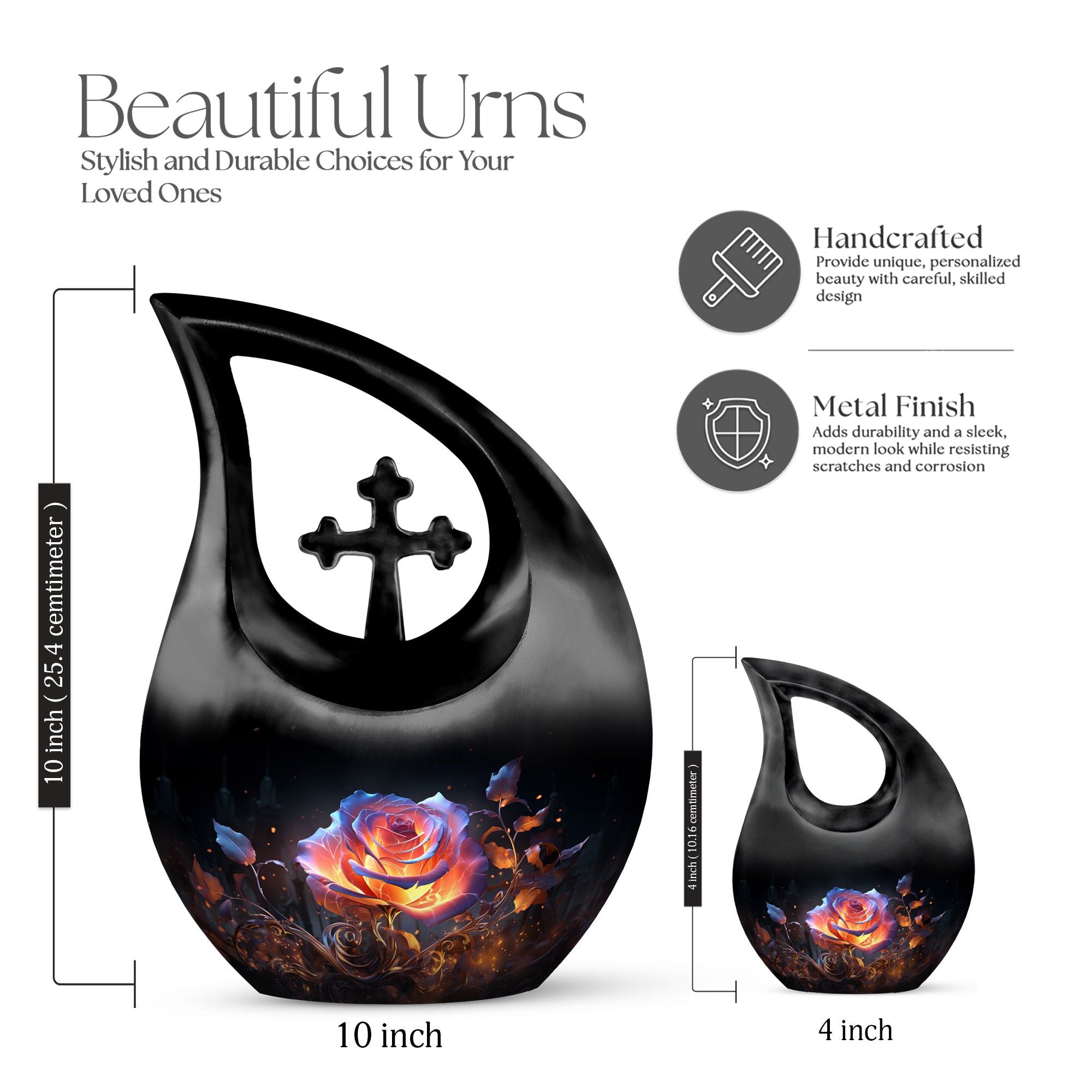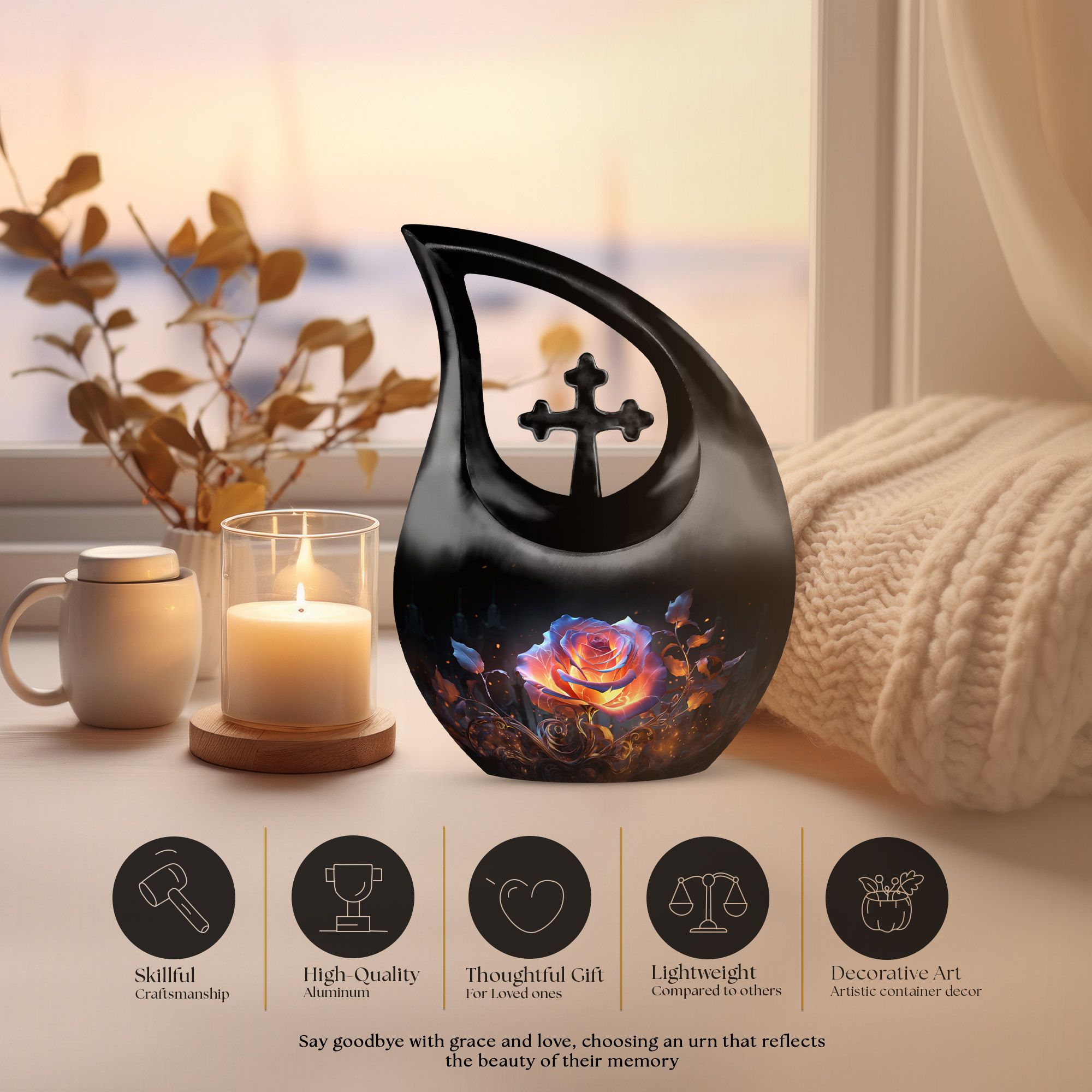 Celebrate the enduring spirit of a loved one with our Black Cremation Urn for Human Ashes. This elegant rose and cross memorial urn represents everlasting love, strength, and faith — making it a heartfelt tribute for both men and women. Thoughtfully designed, it serves as a dignified way to preserve and honor precious memories for generations.