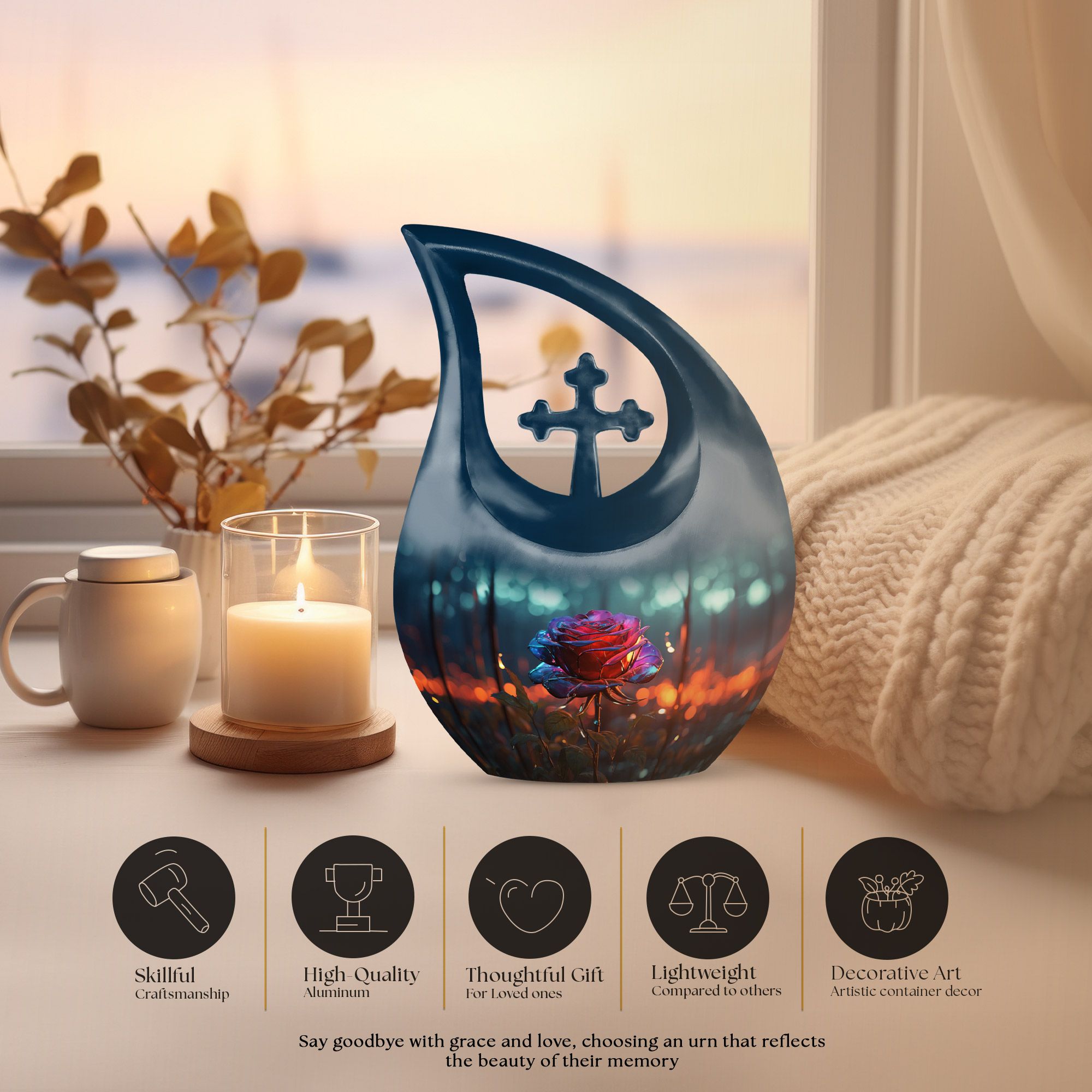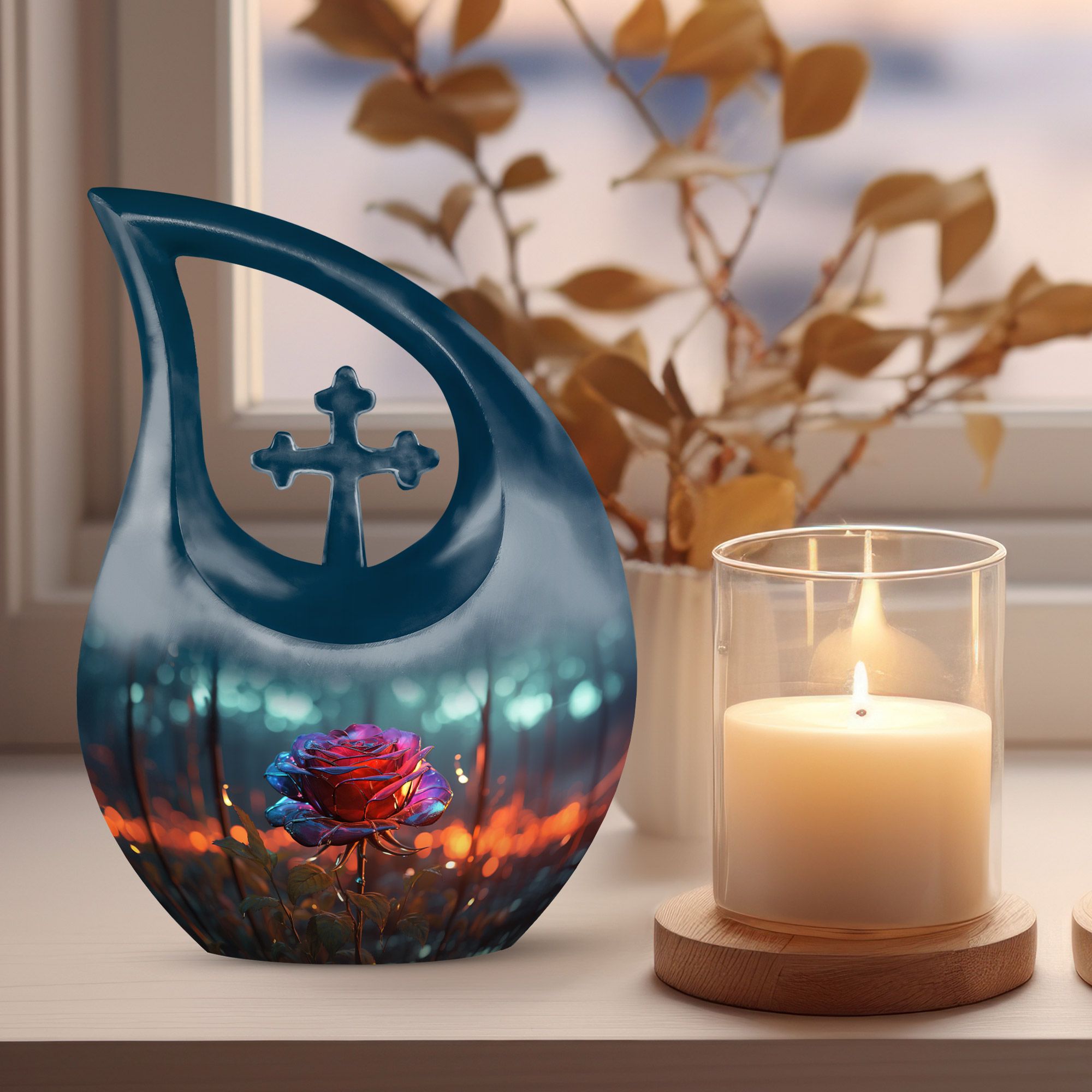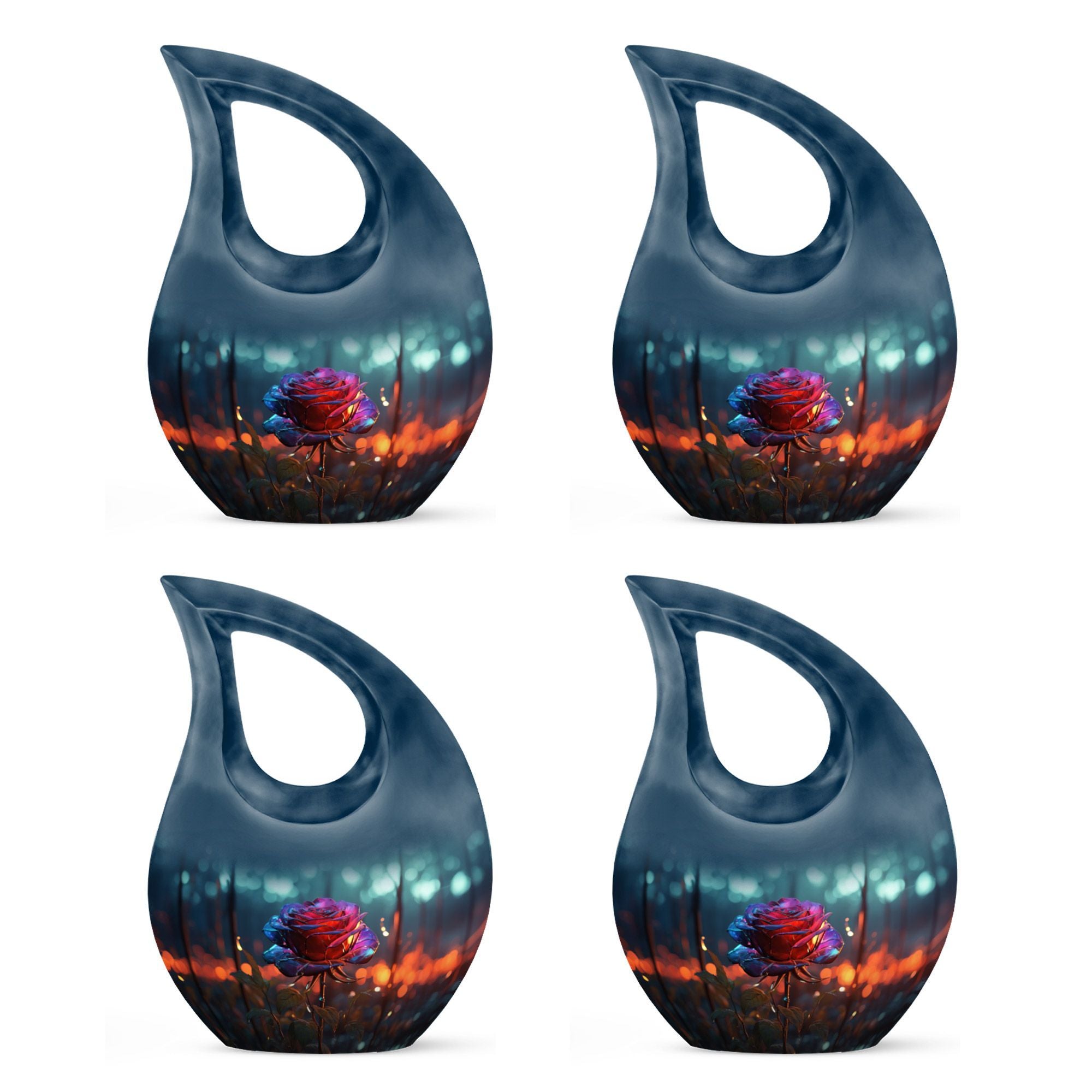 Celebrate the beauty of a cherished life with our Blue Teardrop Burial Urn for Ashes, featuring a Single Dark Rose and Cross Memorial design. This exquisite cremation burial urn embodies serenity and devotion, offering a peaceful and dignified resting place for your loved one. Whether chosen as a burial urn for ashes or for display at home, it represents faith, love, and eternal connection.