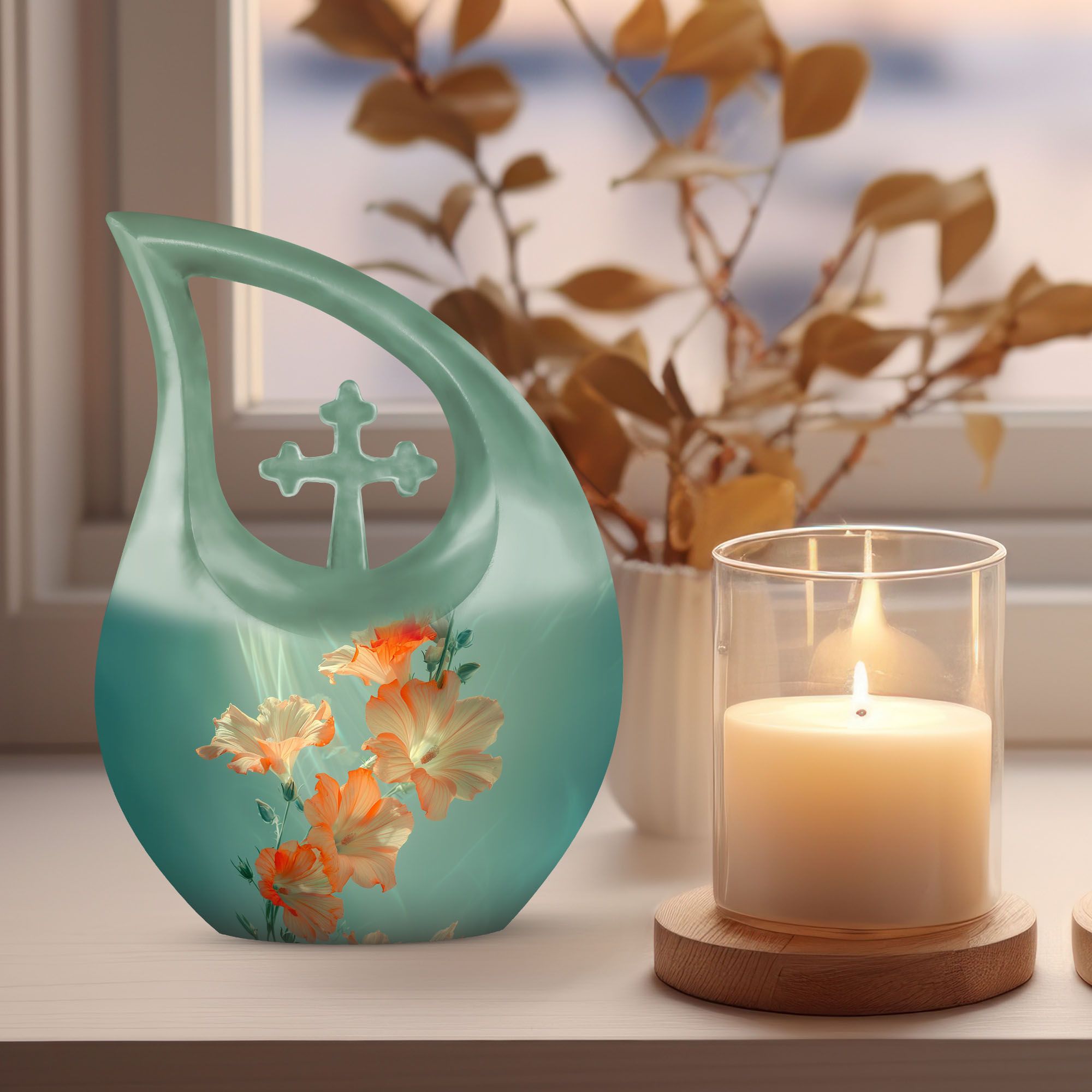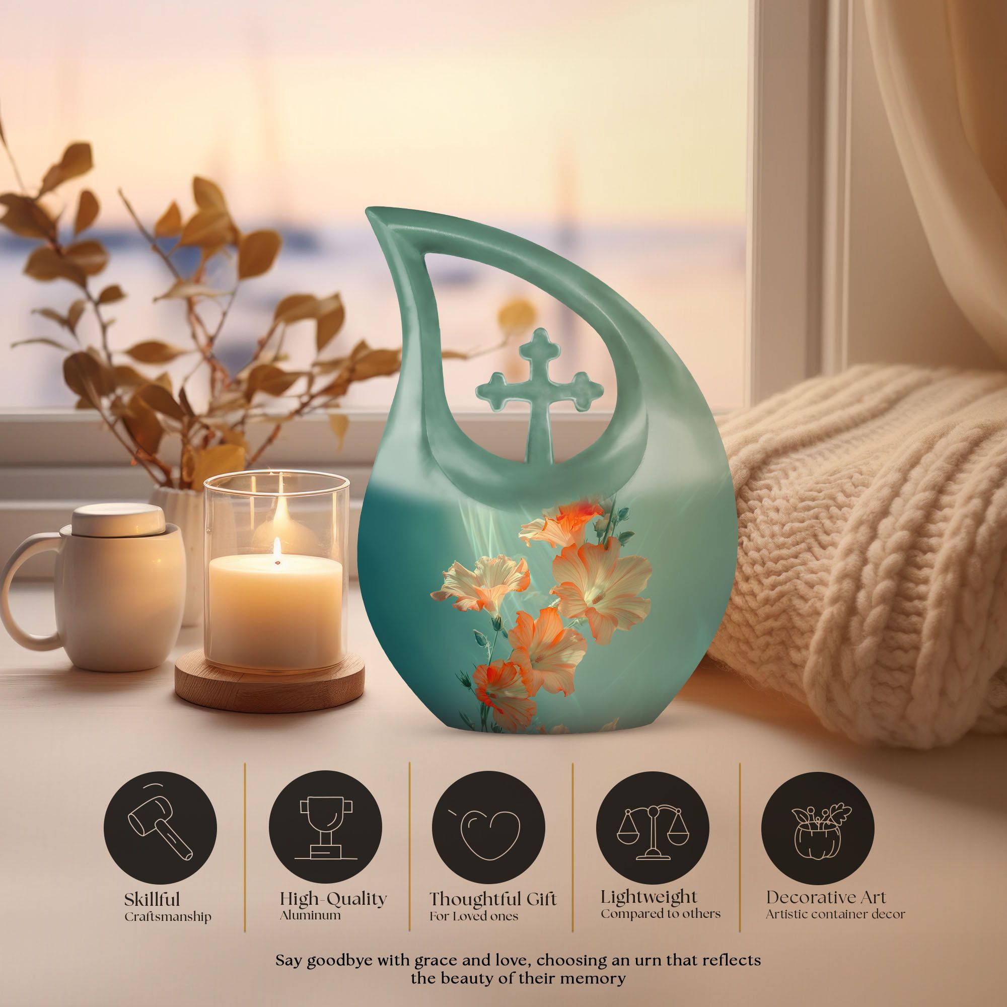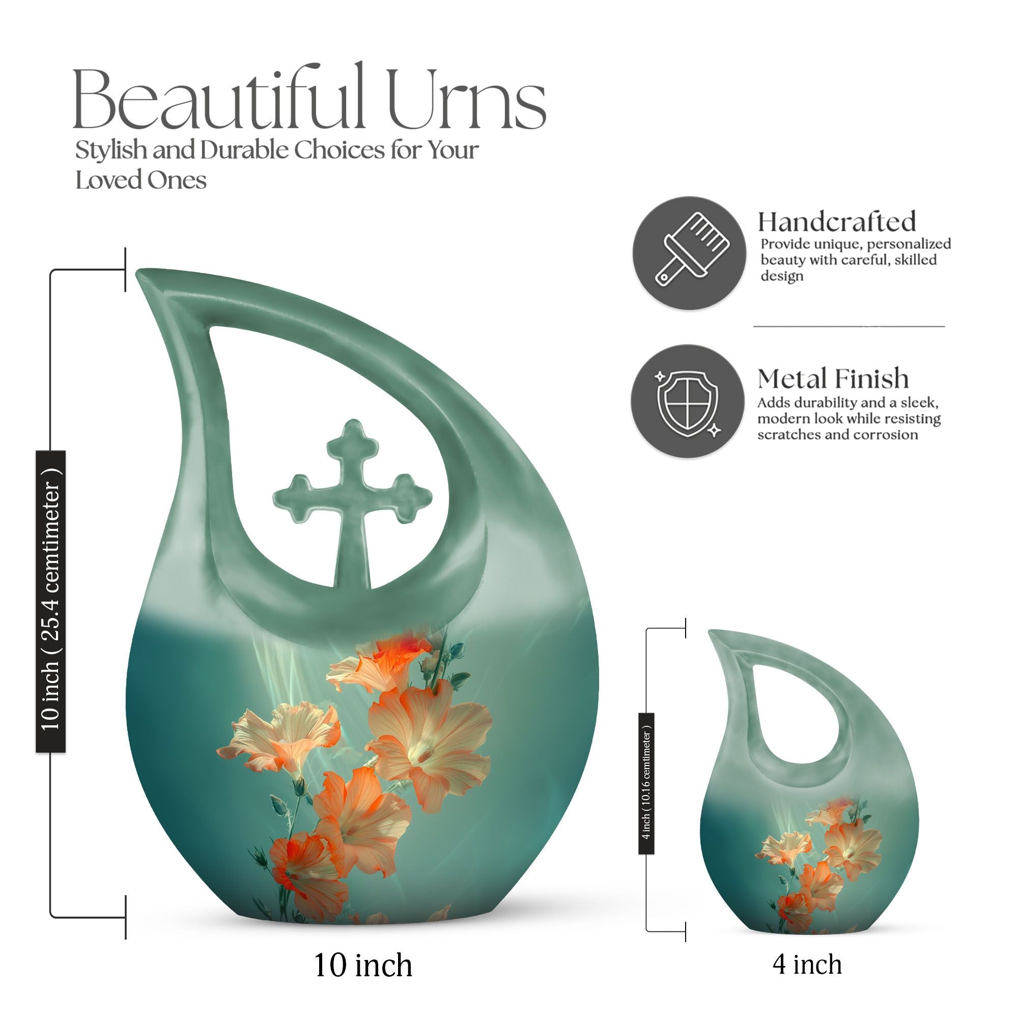 Honor a loved one and express your unending affection with our 10-inch Flower Urn from the All Faith Funeral Urn collection. Expertly crafted from durable aluminium, this memorial urn showcases a distinctive 'Cross Drop' theme, seamlessly incorporating elements of faith and reflection into its design. Weighing 3.3 pounds with dimensions of 10 inches in height, it elegantly serves as a lasting tribute with a capacity of 200 cubic inches. Easily safeguard precious remains with the inclusion of a velvet pouch for containment of ashes. For an even more heartfelt tribute, personalize this Large Urn by engraving the name of your loved one. Our urns are not just paraphernalia but convey the enduring love and respect we hold for those who are no more in a unique yet meaningful way. Ideal for adults and seniors searching for 'Flower Urn' or 'memorial urns' or alternatives such as 'Small Urn', 'Miniature Urns', 'Custom Cremation Urns', or 'Funeral Urns For Adults', this urn offers a touching gesture of remembrance.