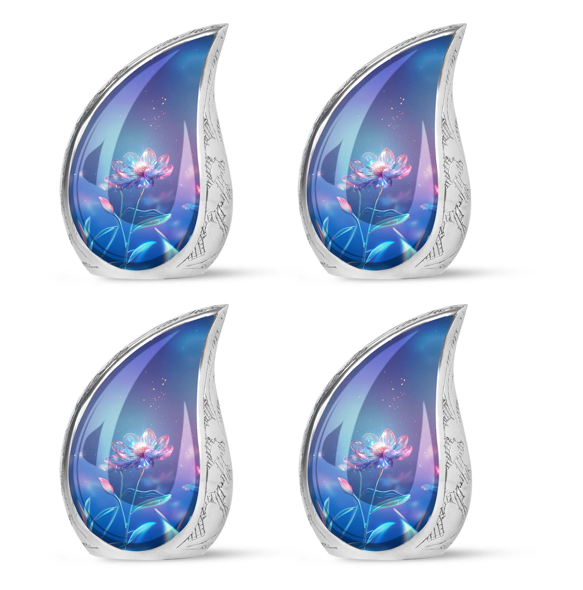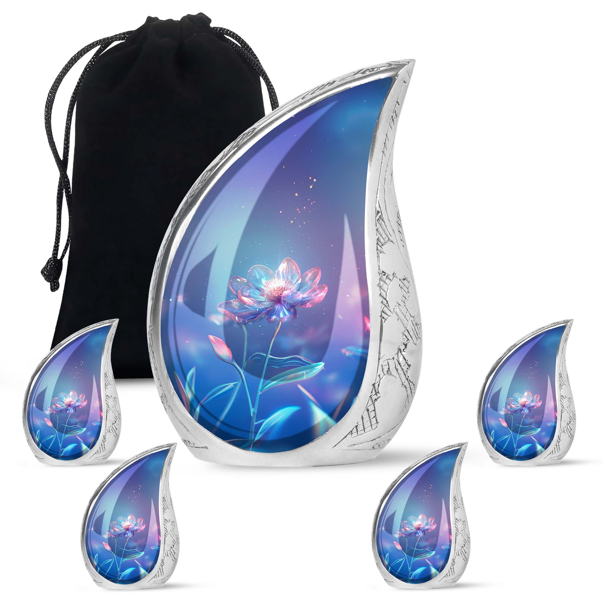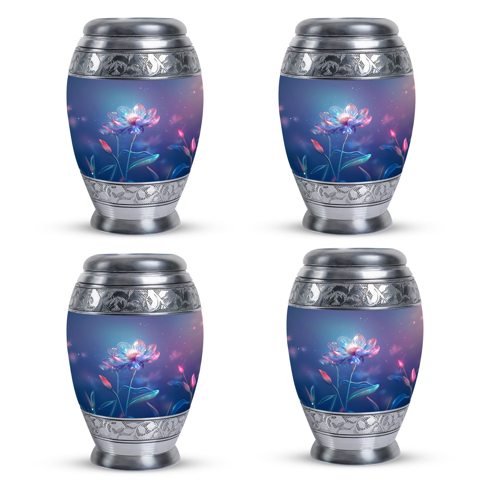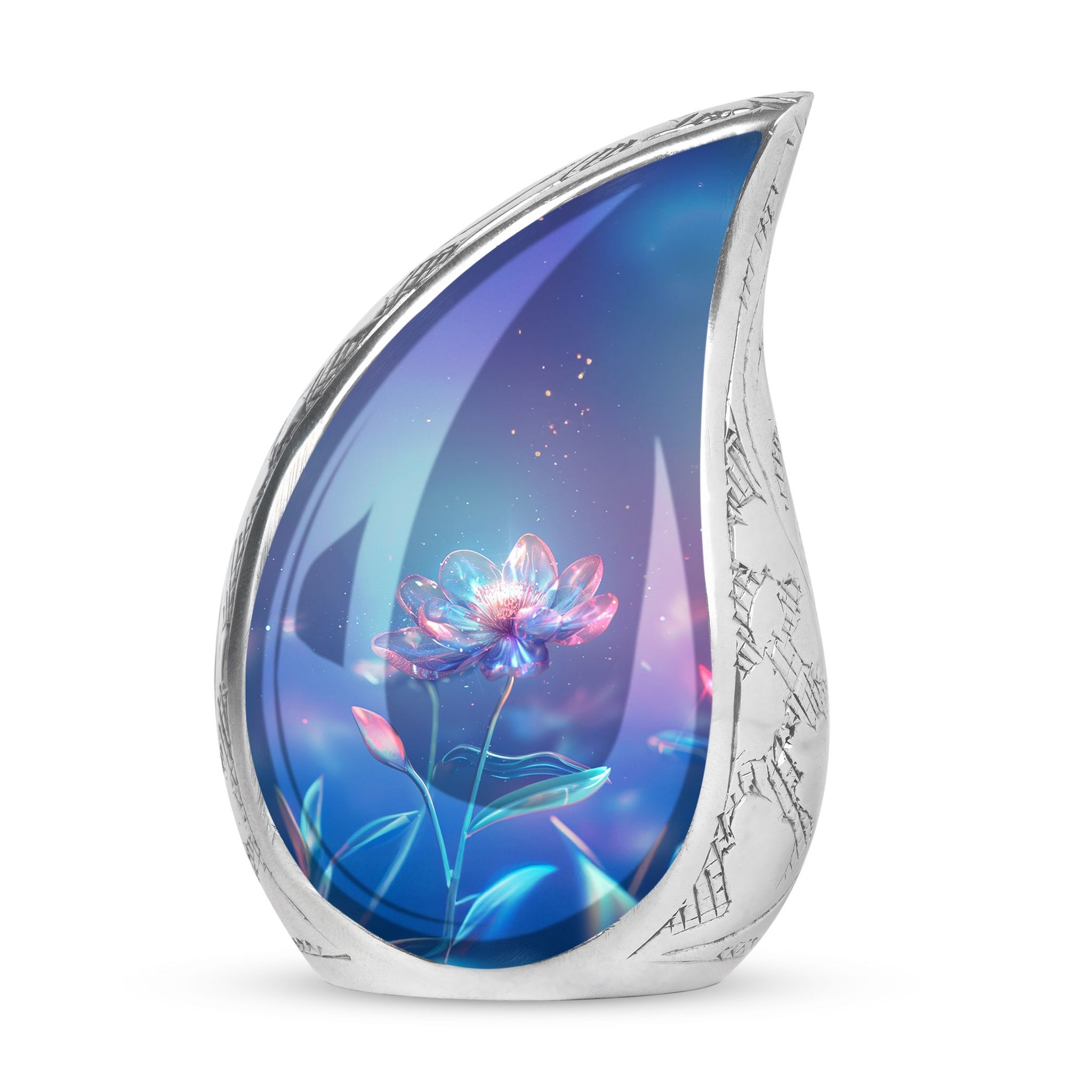 Each detail of this large decorative urn for human ashes reflects fine artistry and compassion. Designed with delicate floral motifs, it captures the beauty of eternal life and love. Handcrafted from high-quality aluminum, this urn ensures durability and timeless charm. Its vibrant blue hue, accented with graceful flowers, symbolizes tranquility and eternal peace—making it one of the most heartfelt cremation urns for women available. The secure screw-top lid guarantees the safe preservation of ashes, offering comfort in knowing your loved one rests in beauty and security.