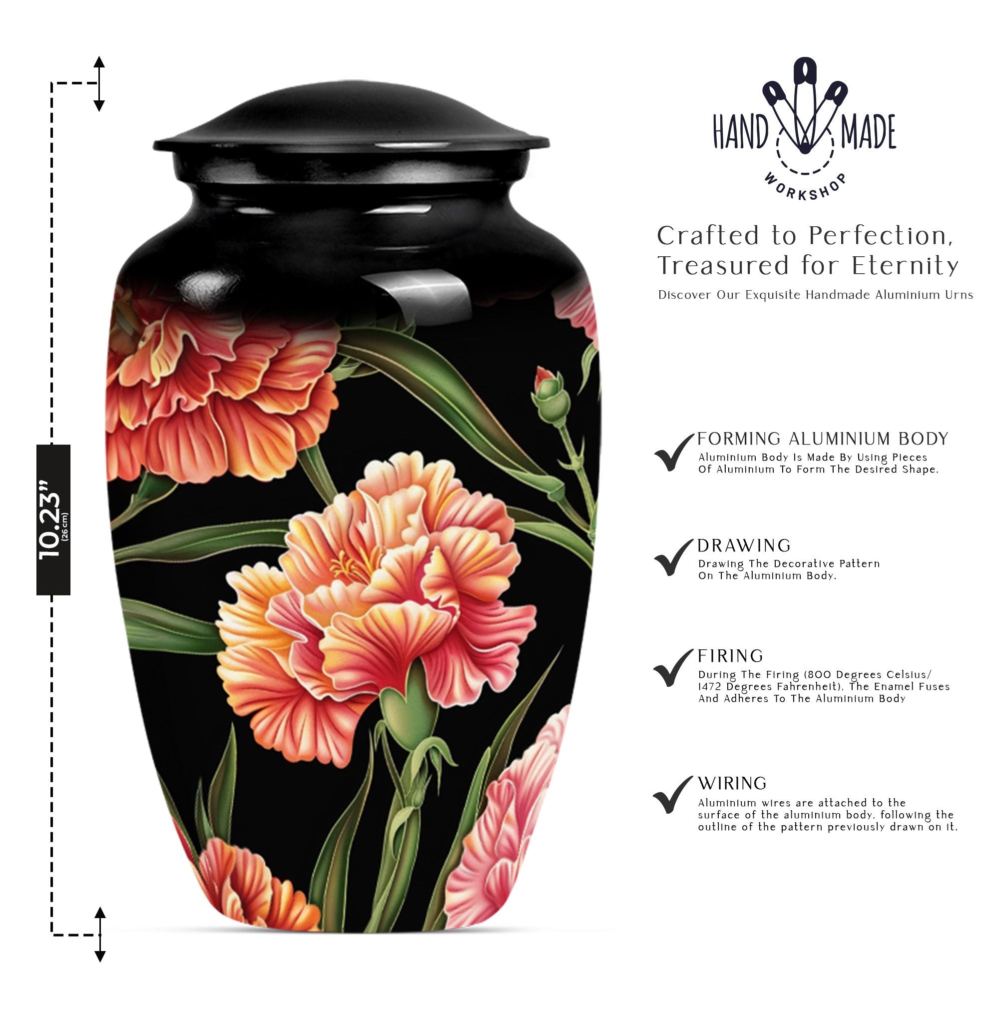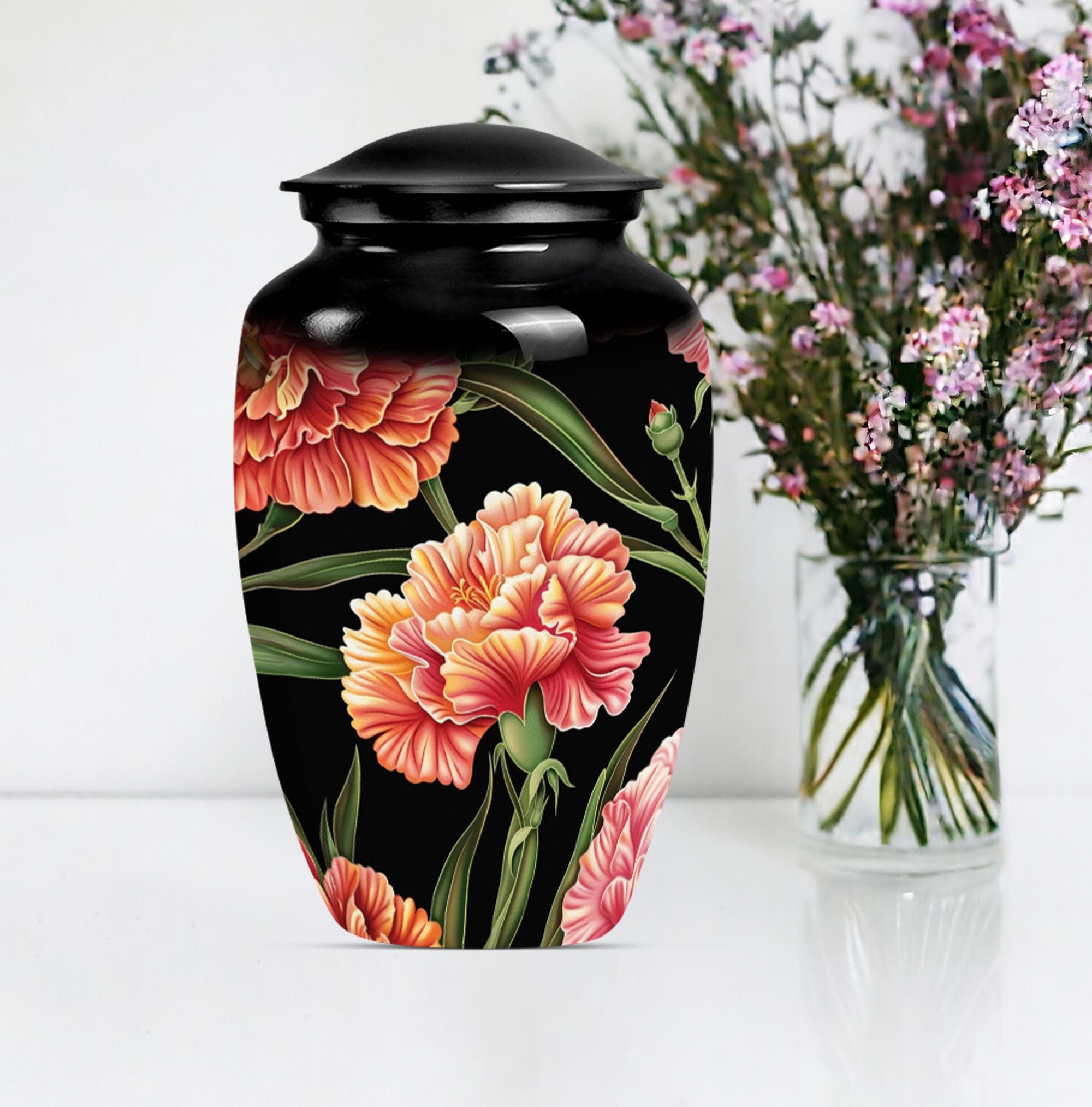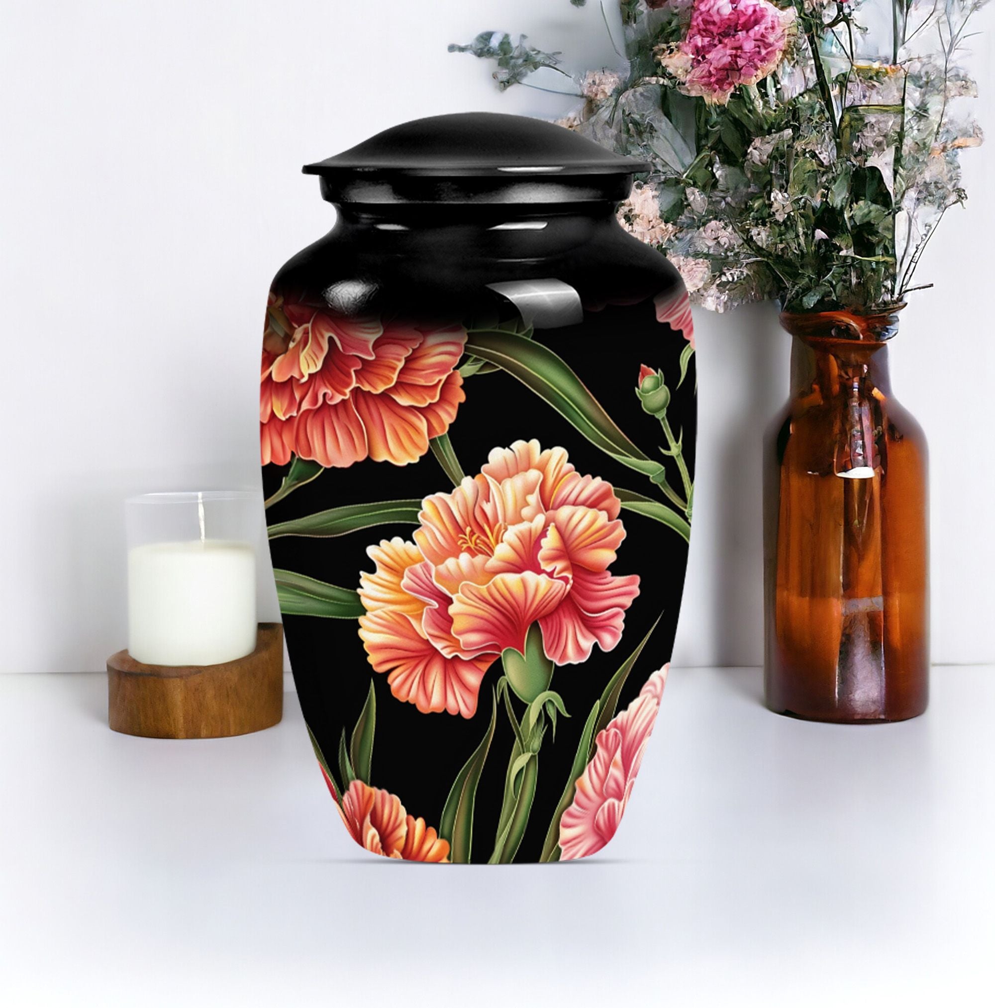 Presenting a distinguished way to commemorate and honor loved ones, our 10-inch, aluminium flower urn provides an exquisite resting place. This cremation urn, artistically themed as 'Purple Meadow,' emanates calming serenity while safely containing your cherished one's remains. It weighs a sturdy 3.3 pounds and is a perfect choice for those seeking large urns. Notably, our lovely cremation urn can hold up to 200 cubic inches of ashes, making it ideal for human ash containment. A sense of thoughtfulness is enhanced with our provided velvet pouch, ensuring the dignified containment of ashes. Personalize and add a touch of your affection with the offered customization option to engrave names on it. Besides being a 'Classic Urn,' the rarity of its design contributes to its unique aspect while providing comfort and eye-pleasing aesthetics. It is perfectly suited for those in need of cremation urns for human ashes, funeral urns, or burial ashes urn.