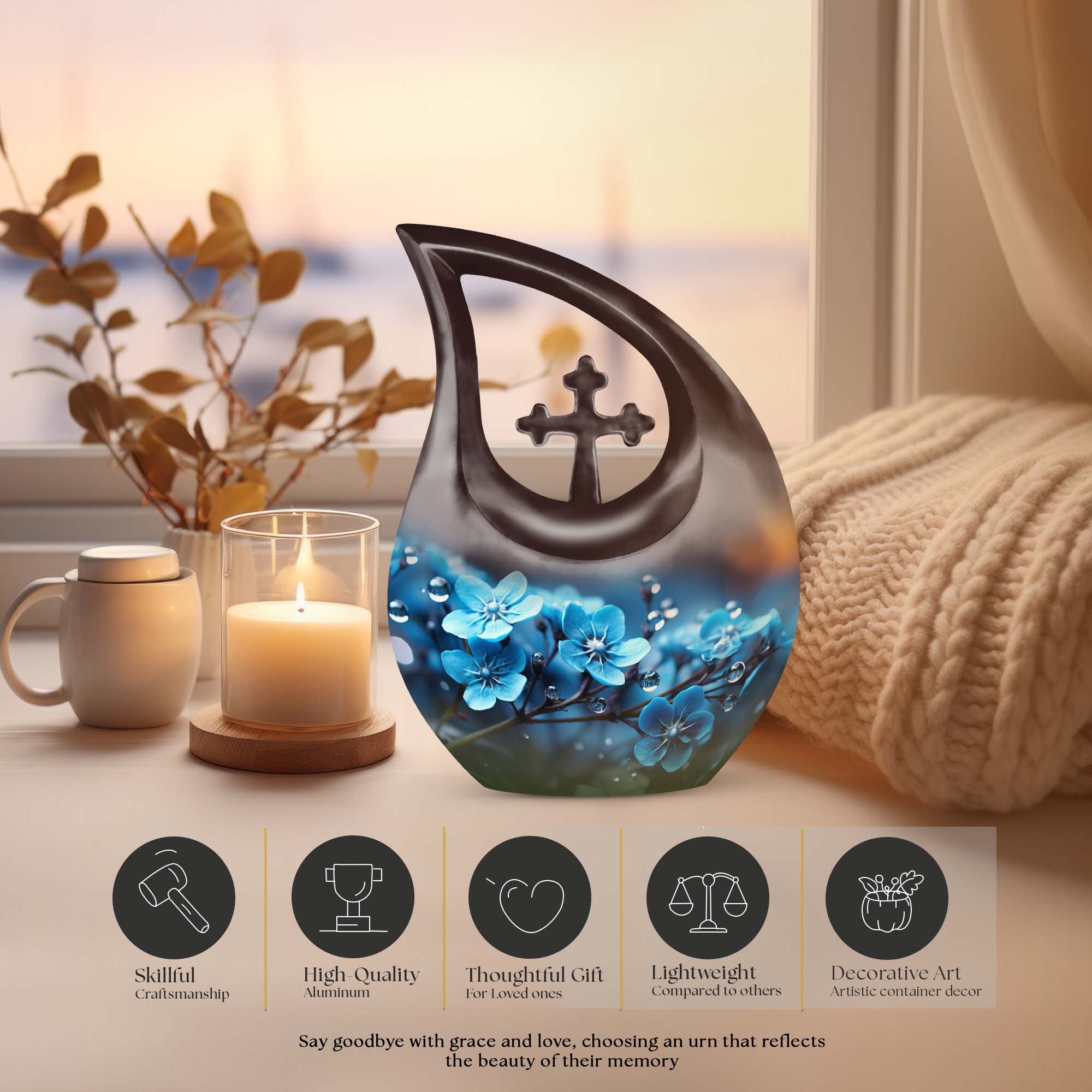 Crafted from premium aluminum, this urn showcases delicate blue floral artistry on a polished finish — reflecting calm and everlasting beauty. Its versatile design makes it perfect for display or as a funeral urn for adult ashes men and adult urns for human ashes women. Whether chosen as a centerpiece urn or part of a keepsake collection, it provides both elegance and comfort.