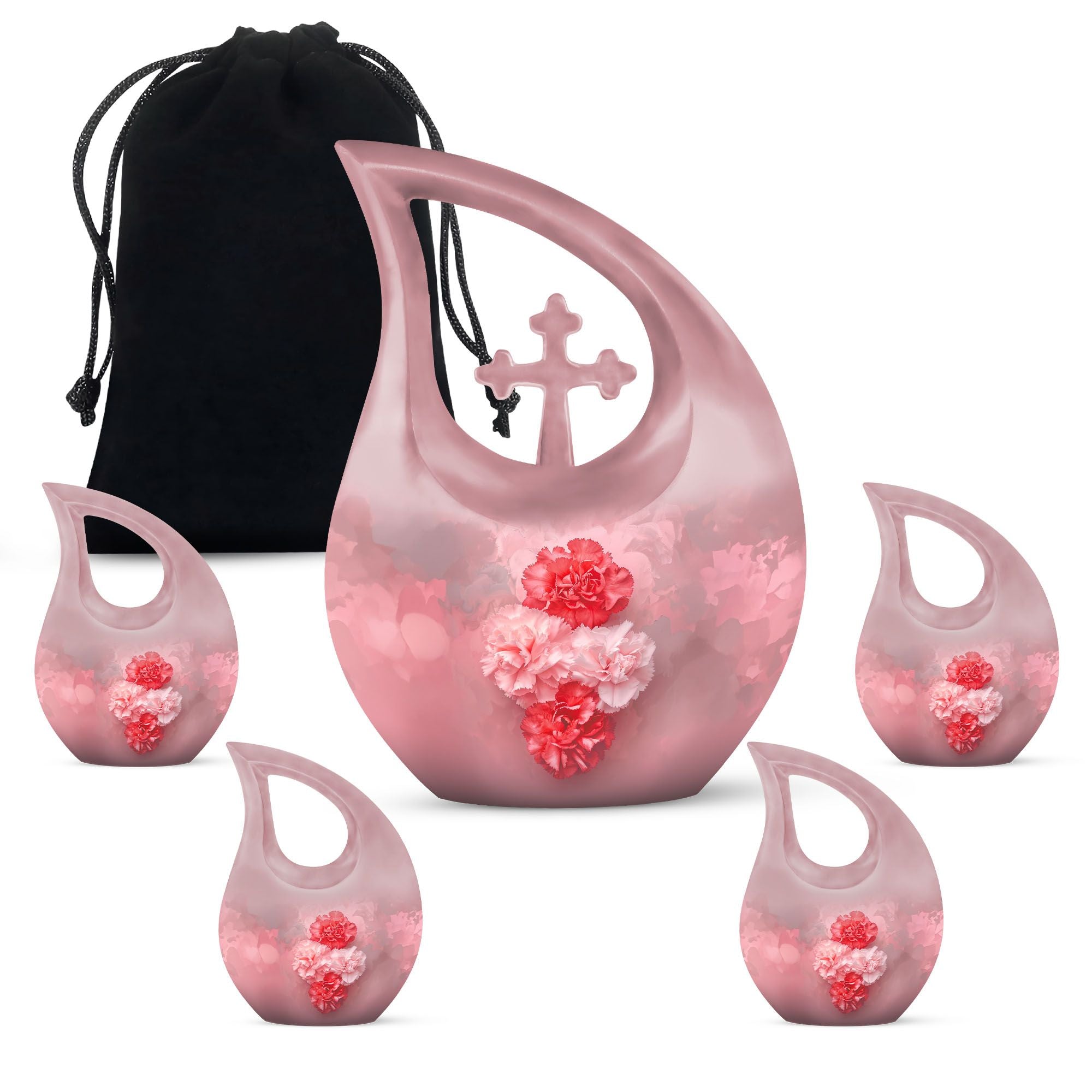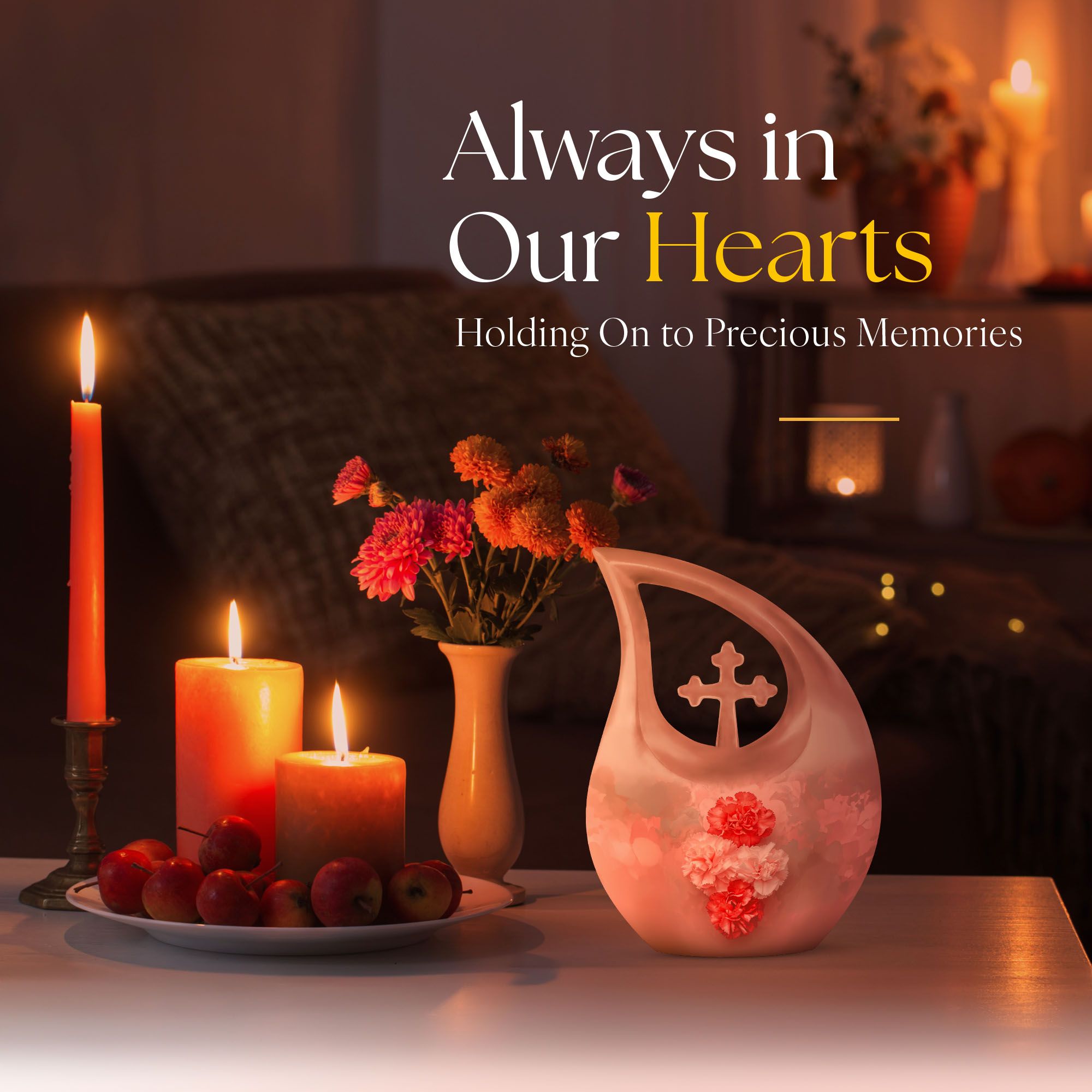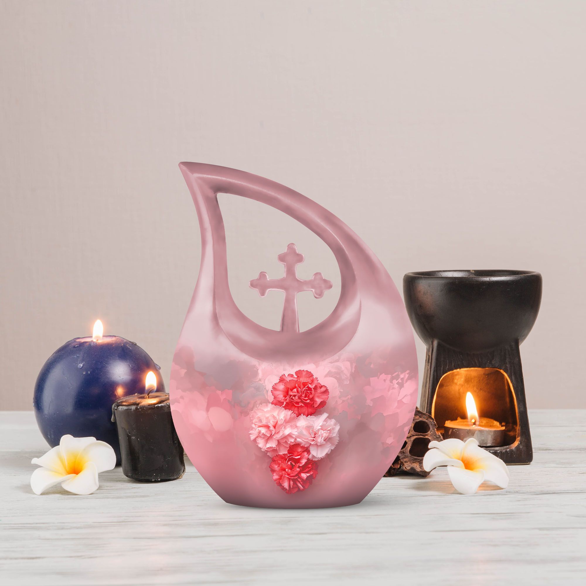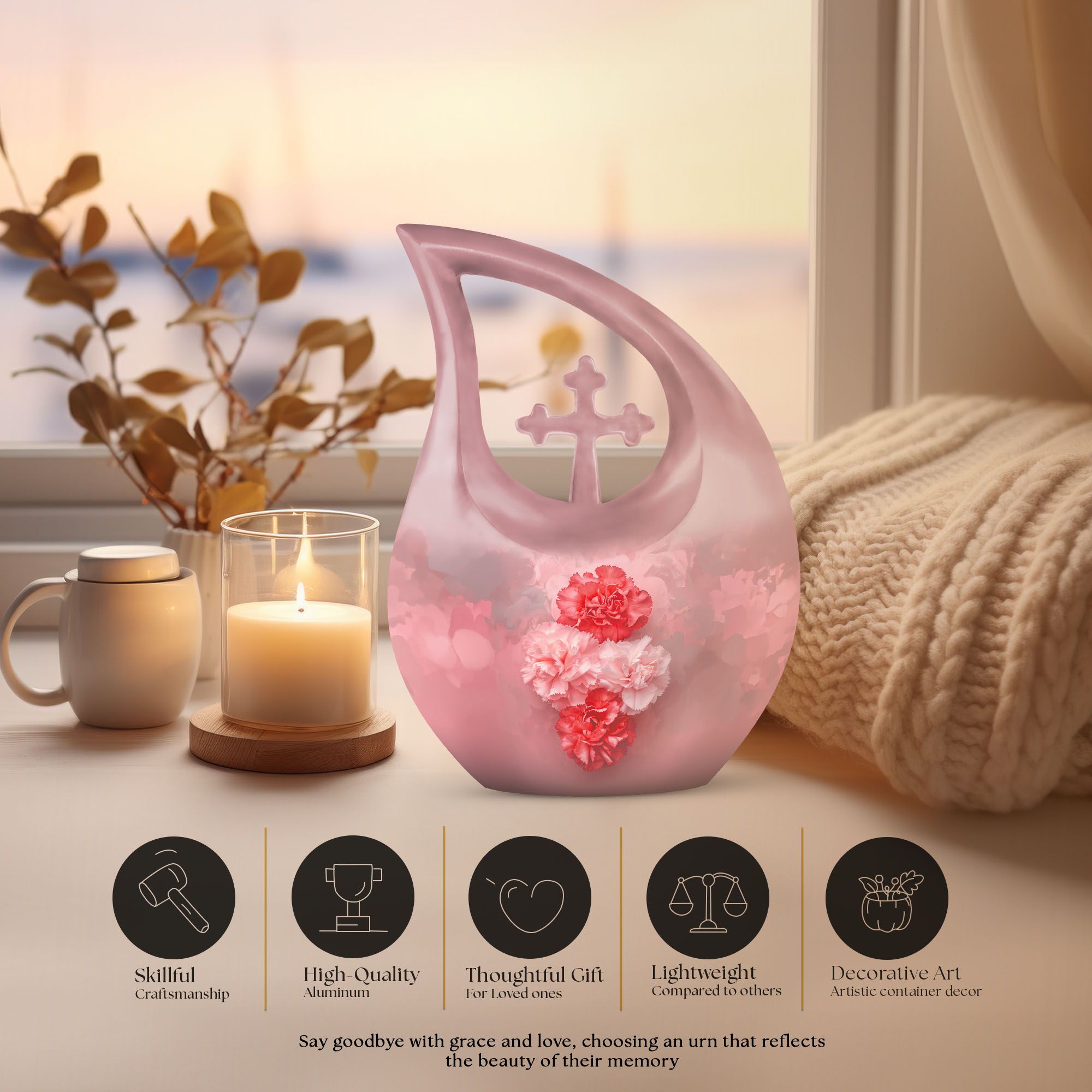 Immerse yourself in the tender memories of your loved ones with our beautifully crafted Flower Urn. This memorial urn, fitting within the Cremation Boxes For Adults category, boasts an alluring 'Cross Drop' design. Made from high-grade Aluminium, it's both durable and aesthetically pleasing. Standing at 10 inches in height and weighing 3.3 pounds, its capacity is a substantial 200 cubic inches, providing ample space for ashes. Personalize this large urn with engraved names to add a touch of intimacy and make it meaningful for you. This urn comes accompanied by a velvet pouch facilitating safe containment of ashes. Whether you're looking for 'Unique Urns For Dad', 'Companion Urns For Adults', 'Urns Online', or 'Large Urns For Ashes', this Flower Urn fits all those categories effortlessly. With its size and strength, it's a fitting and respectful tribute to the memory of your loved ones.