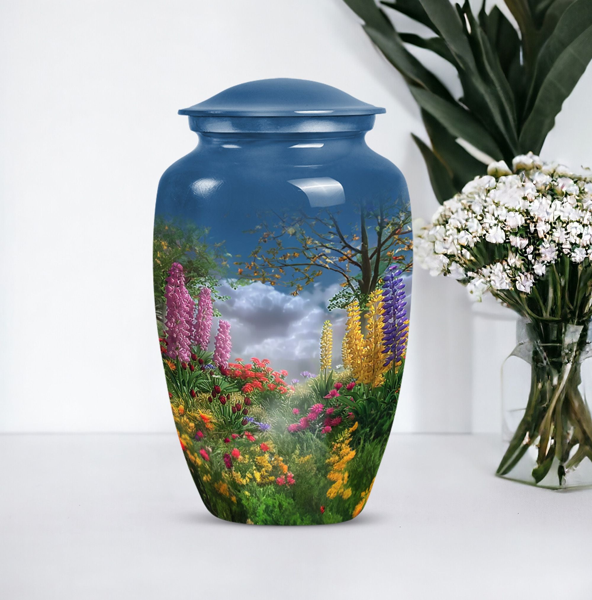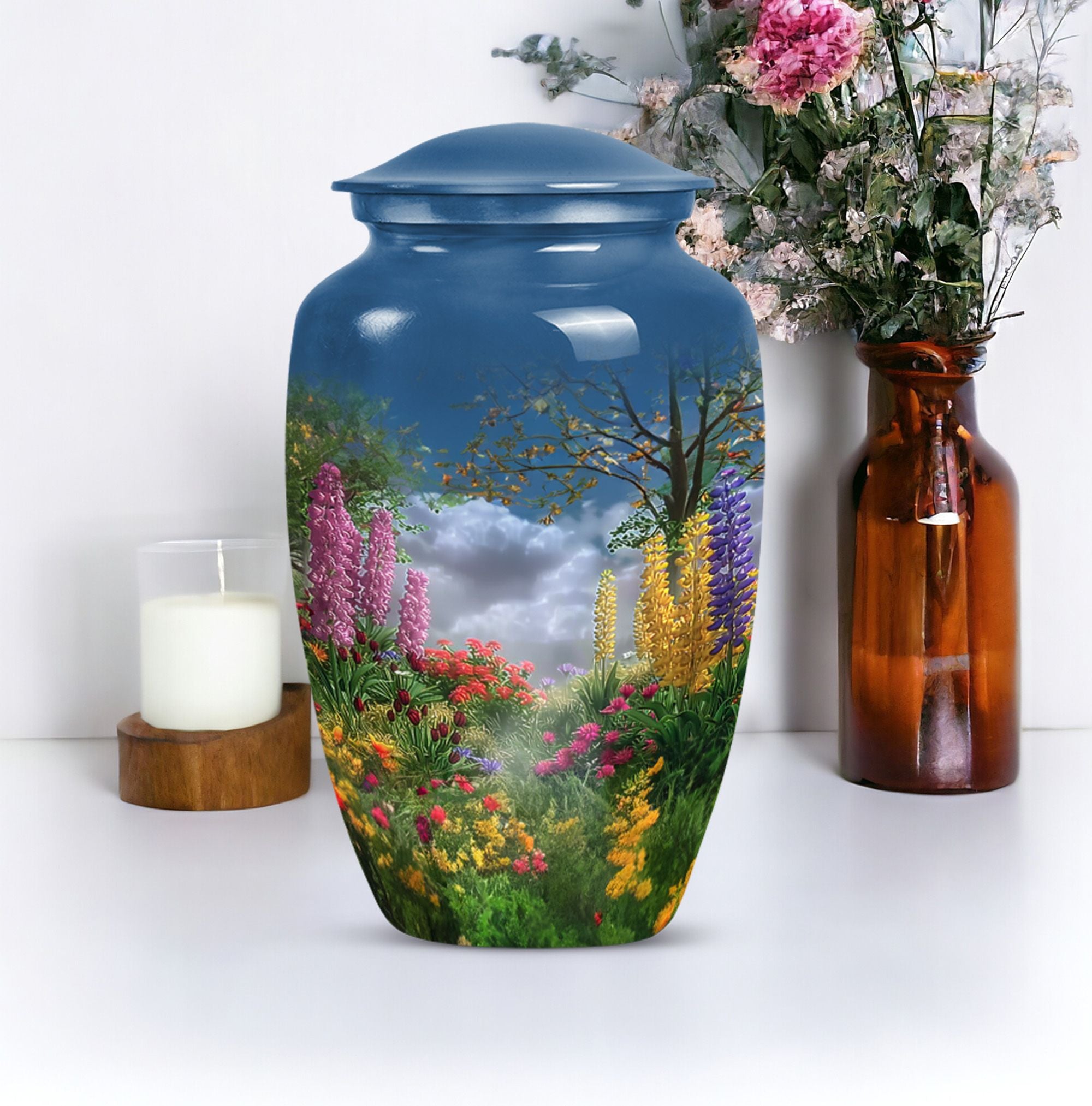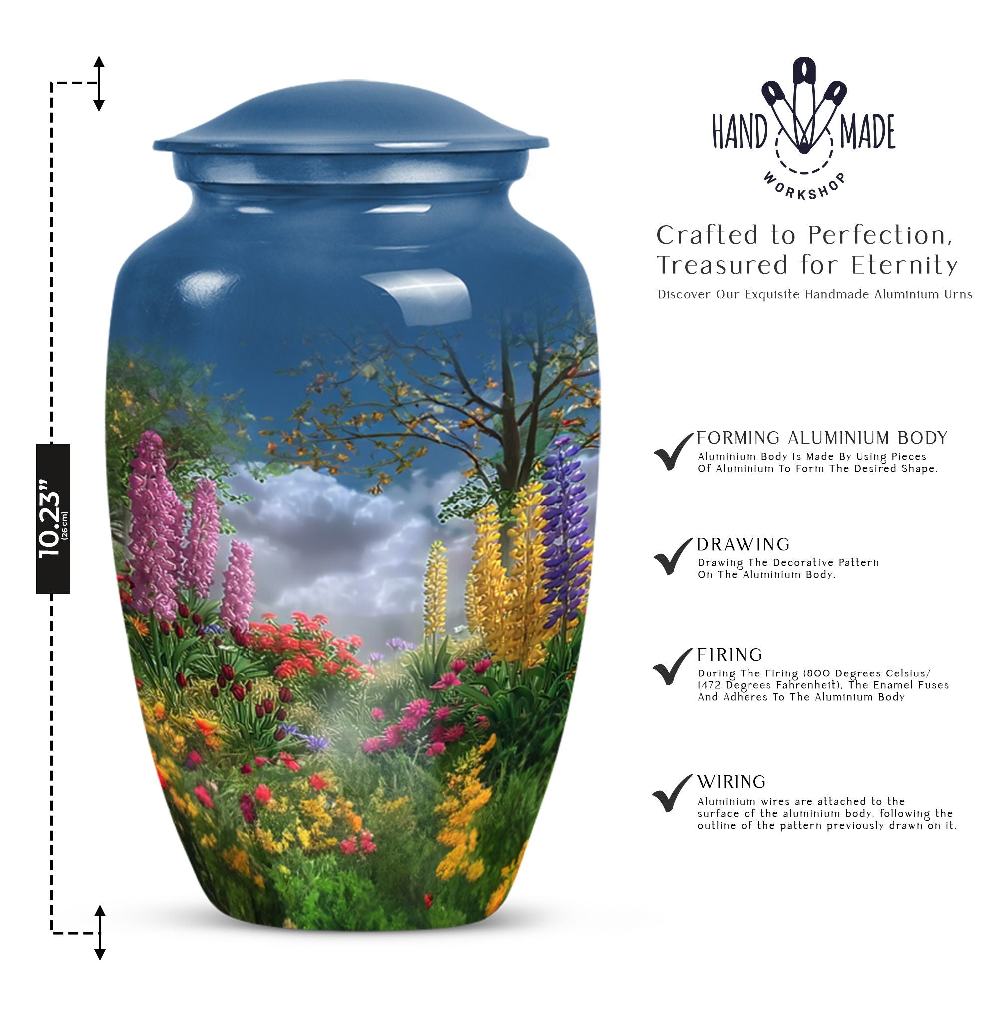 Find solace in the memorial appreciation of your beloved with our FLOWERS Urn, a prestigious and time-honored memorial urn for women ashes. Tailored from high-quality aluminium, this large urn guarantees top-tier durability and an impressive longevity. With a 200 cubic inches capacity, it comfortably houses the ashes of an adult female. Its impressive size - 10 inches high - and weight of 3.3 pounds reflect its sturdy construction and grandeur. Apart from the attractive floral theme that adorns the urn, it also offers personalization via engraved names, adding an intimate, personalized, and lasting touch to the memory of the departed. The urn is sufficiently sized for ground burial and can also serve as a lasting keepsake. On purchase, each urn comes with a velvet pouch for containment of ashes, ensuring your cherished memories are preserved with utmost respect and dignity. Our cremation urn promotes a tranquil and gentle remembrance, making it a perfect and meaningful choice for your memorial ceremony supplies.