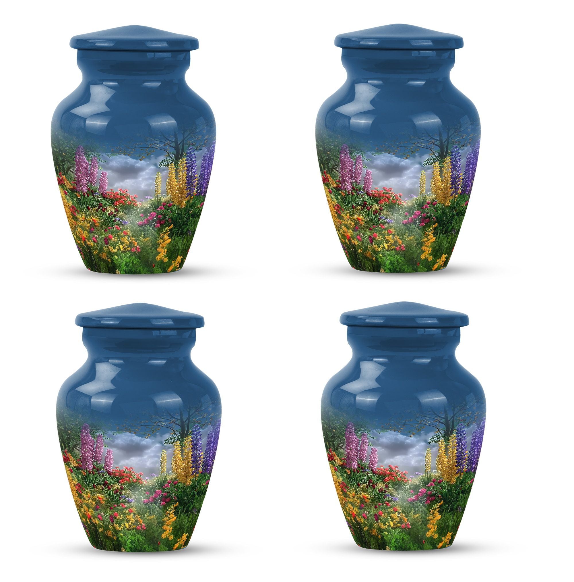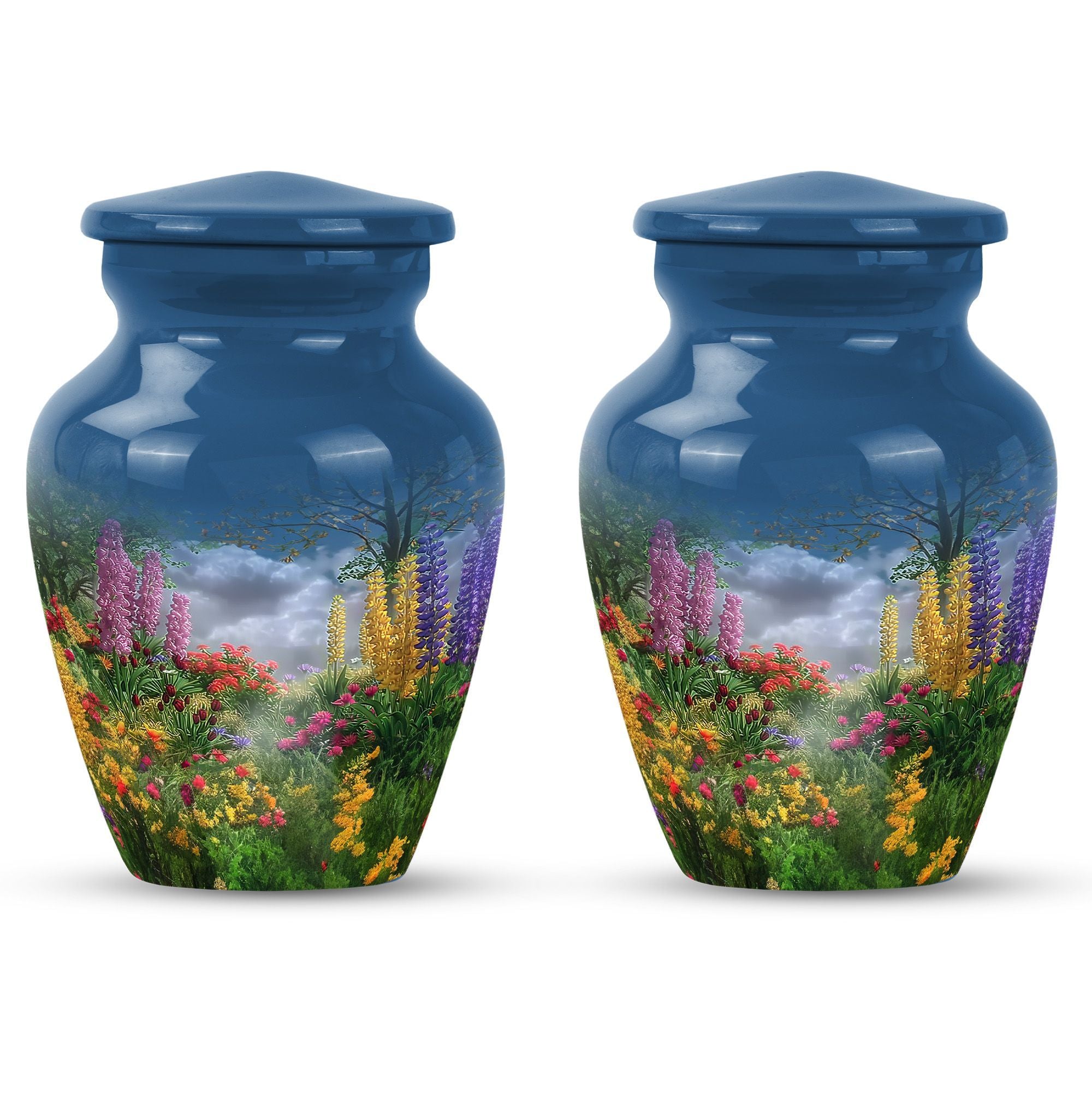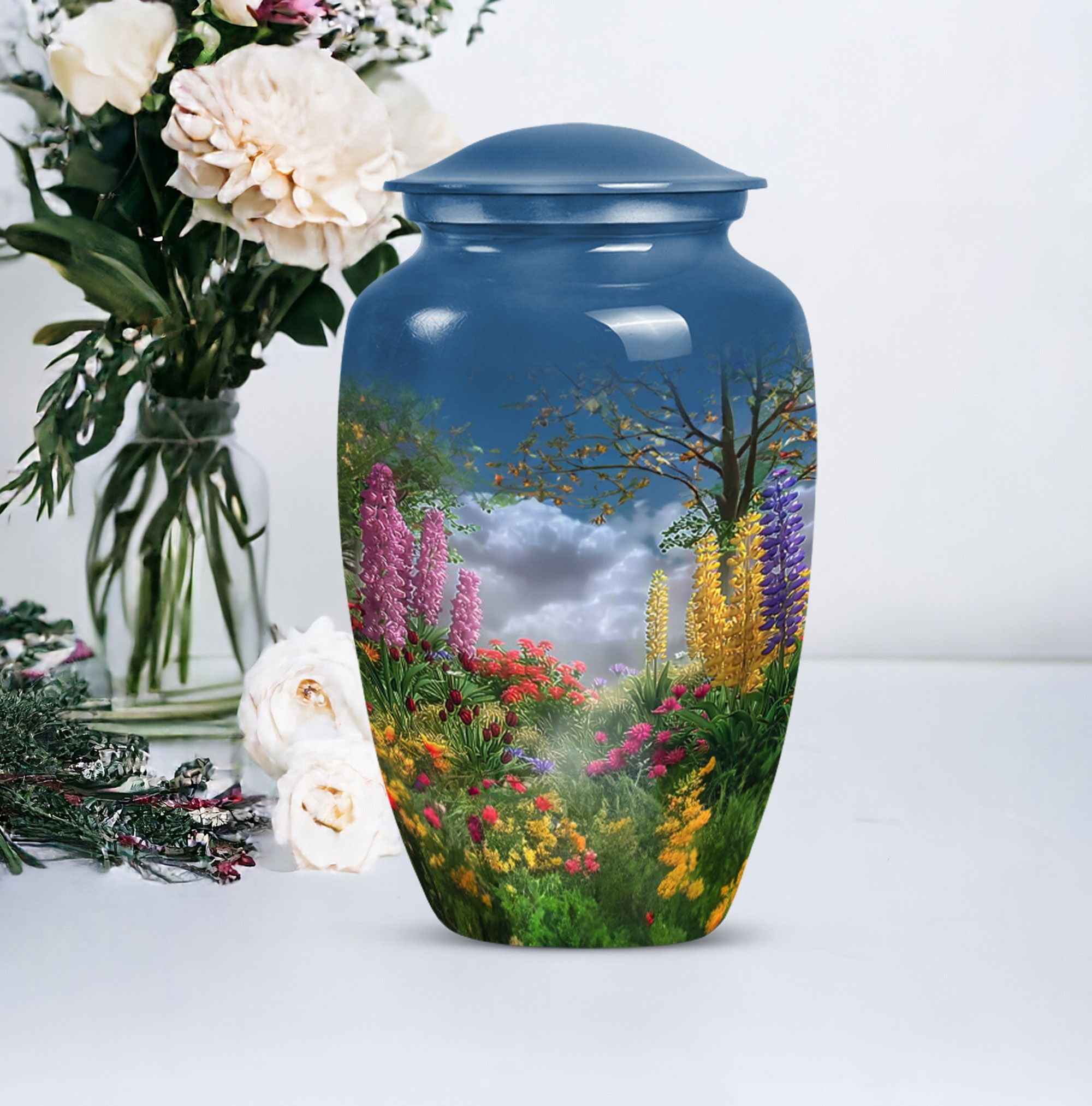 Find solace in the memorial appreciation of your beloved with our FLOWERS Urn, a prestigious and time-honored memorial urn for women ashes. Tailored from high-quality aluminium, this large urn guarantees top-tier durability and an impressive longevity. With a 200 cubic inches capacity, it comfortably houses the ashes of an adult female. Its impressive size - 10 inches high - and weight of 3.3 pounds reflect its sturdy construction and grandeur. Apart from the attractive floral theme that adorns the urn, it also offers personalization via engraved names, adding an intimate, personalized, and lasting touch to the memory of the departed. The urn is sufficiently sized for ground burial and can also serve as a lasting keepsake. On purchase, each urn comes with a velvet pouch for containment of ashes, ensuring your cherished memories are preserved with utmost respect and dignity. Our cremation urn promotes a tranquil and gentle remembrance, making it a perfect and meaningful choice for your memorial ceremony supplies.