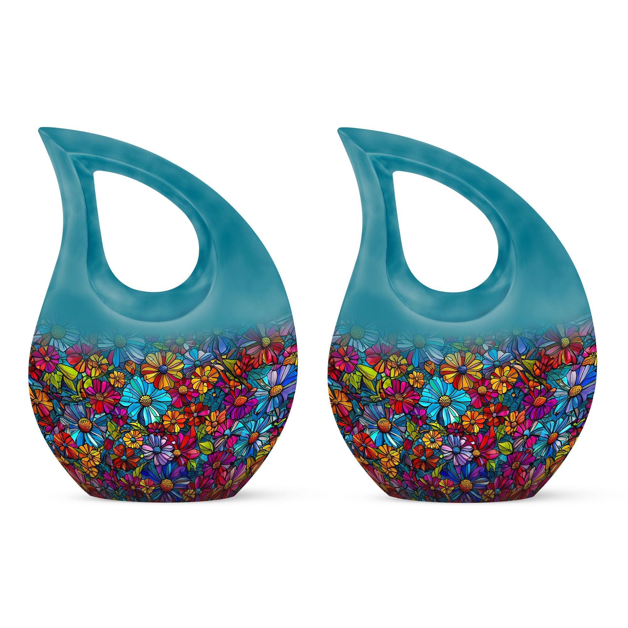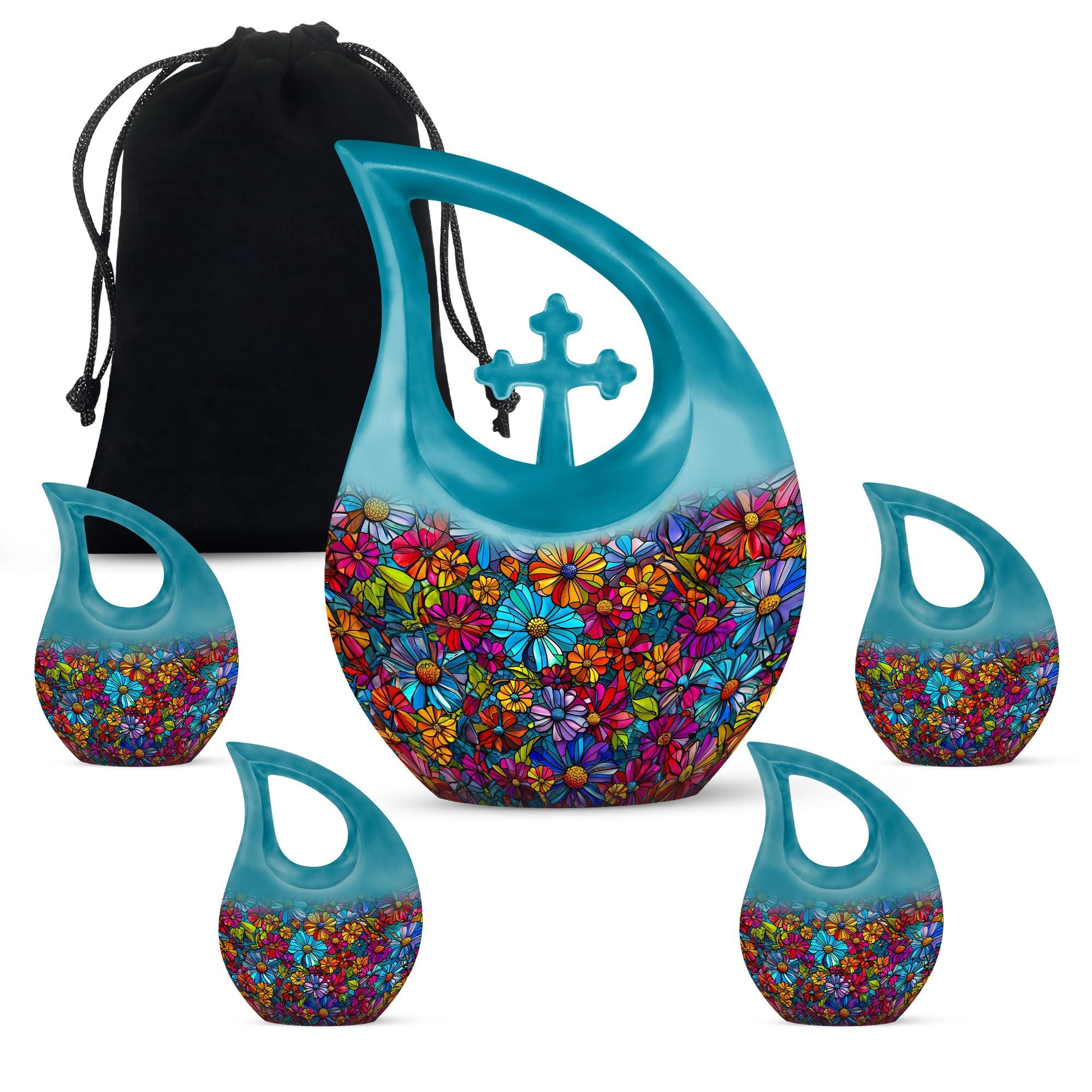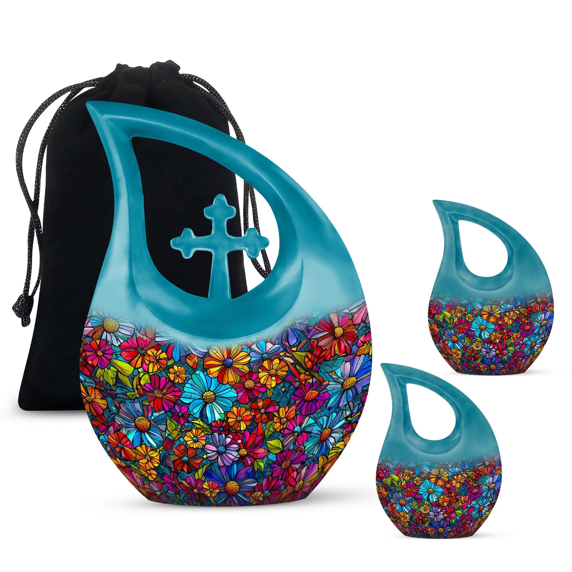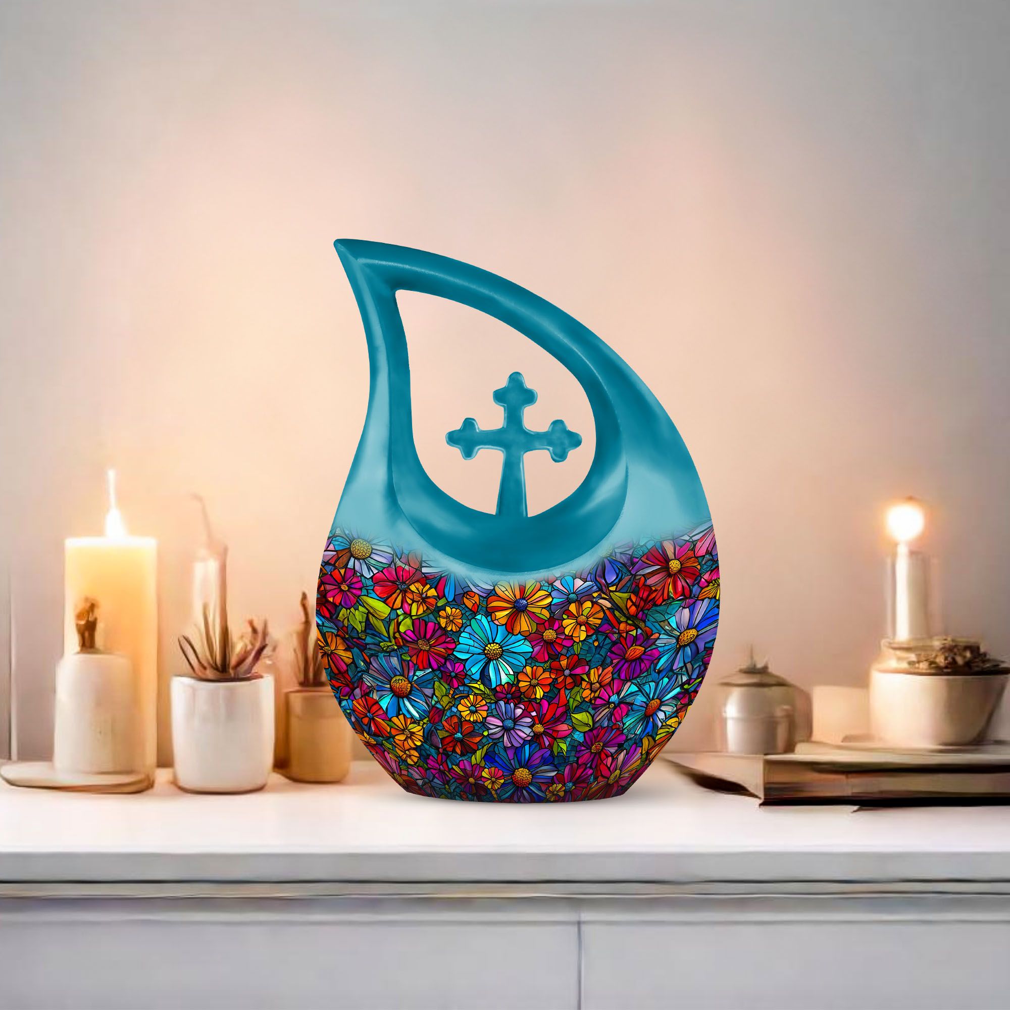 Presenting our exquisite 10-inch Flowers Urn, a remarkable piece from our collection of Extra Large Urns. This aluminium urn's unique Cross Drop motif is a symbolic tribute to your loved one's spiritual faith and offers a touching memorial tribute. The urn weighs 3.3 pounds and stands tall at 10 inches in height, capable of holding up to 200 cubic inches of ashes. Its size and capacity make it a perfect memorial for human ashes. Our Memorial Urns come with a delicate velvet pouch for containment and safekeeping of ashes. An added personal touch is available with our customization option, allowing you to engrave the names of your dearly departed. This Flowers Urn is an artful blend of function and beauty, making it a standout choice among Metal Cremation Urns. Discover our collection of beautifully crafted and Custom Made Urns For Ashes today. With our extensive range of Ashes Urns For Sale, find an elegant and meaningful way to remember your loved ones.