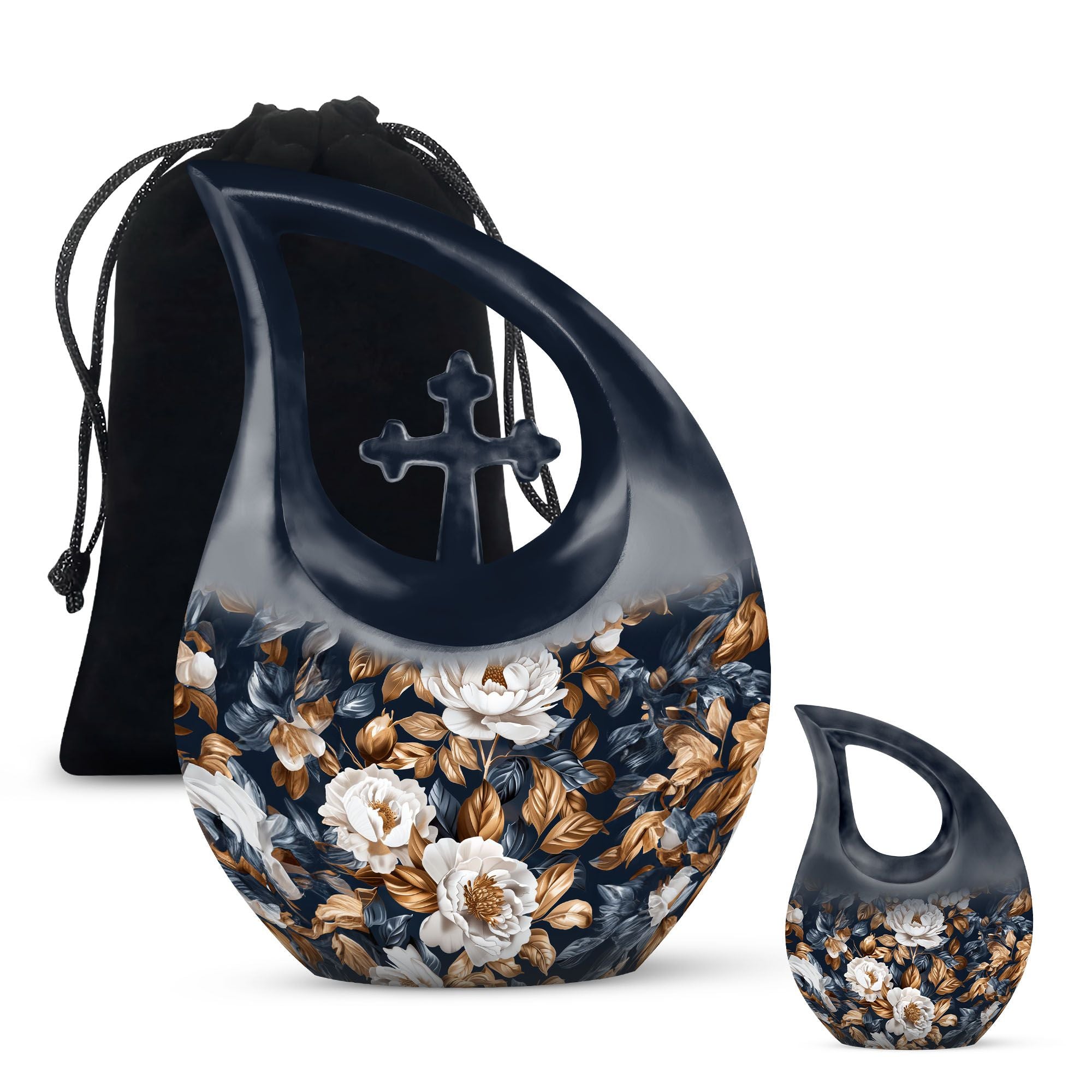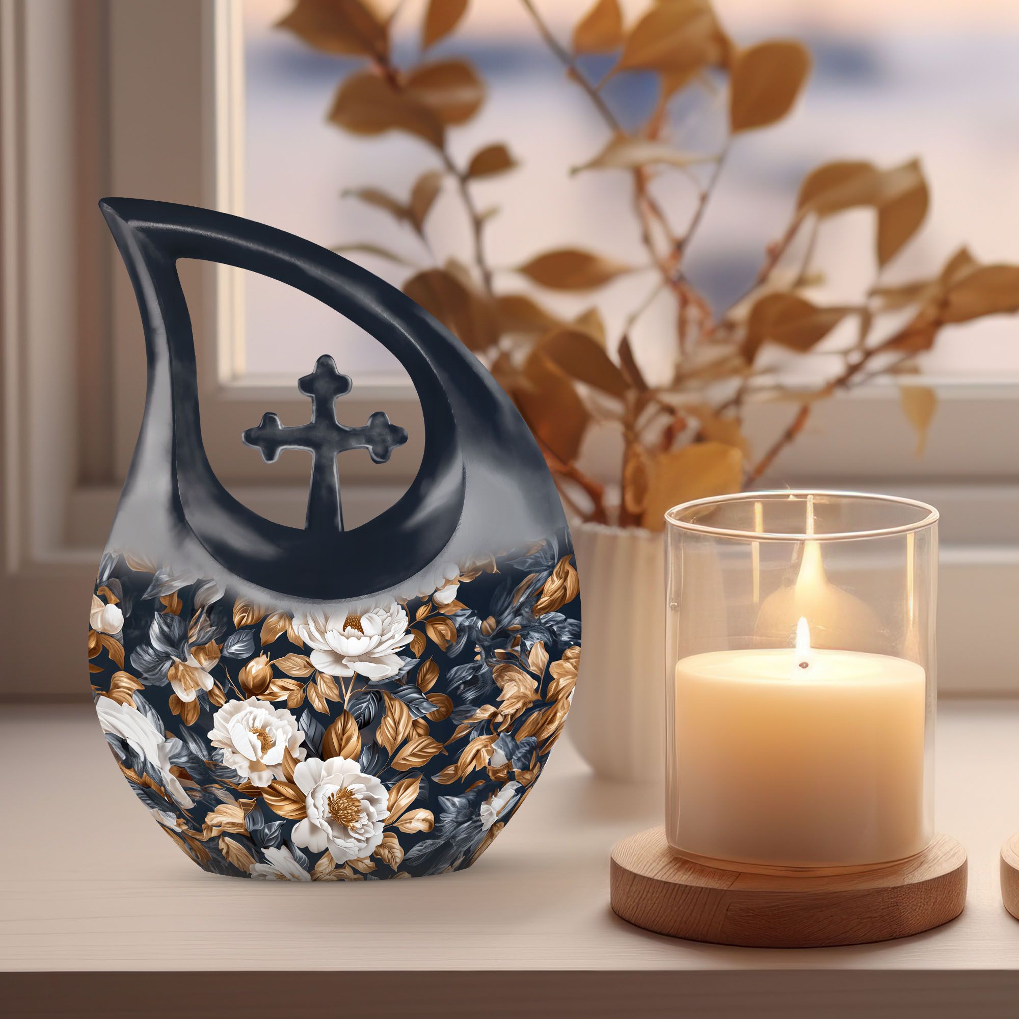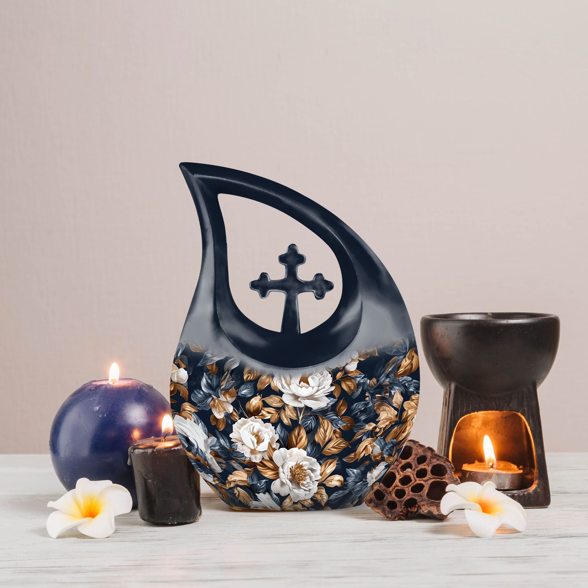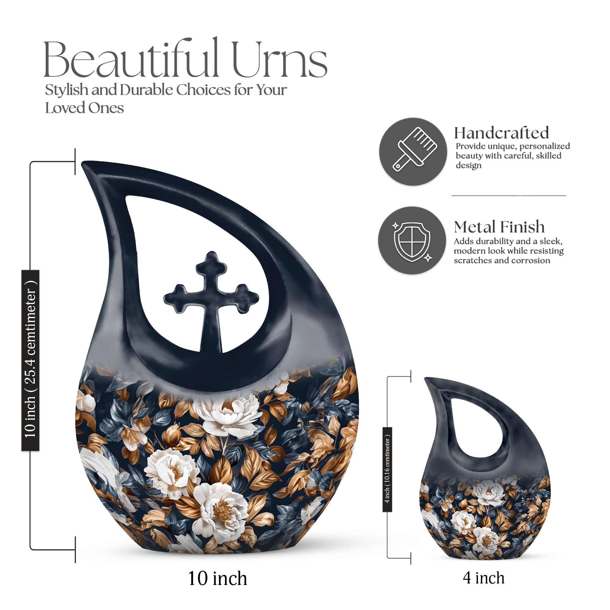 Honor the memory of a loved one with our 10-inch Flowers Urn, a thoughtfully designed large urn that subtly blends aesthetics and sentiment. Crafted from high-quality aluminum, it exhibits timelessness and longevity in the realm of 'memorial urns'. The ”Cross Drop” design resonates with serenity and sanctity that's synonymous with remembering the departed. The urn can hold up to 200 cubic inches, a substantial capacity suitable for adult and senior remains. It has a weight of 3.3 pounds and dimensions of 10 inches in height, which adds to its dignified presence. We offer the possibility of personalizing it with the engraved names, making it a unique memorial piece. The urn comes packaged in a velvet pouch, ensuring safe containment of ashes. Our product line also includes 'Miniature Urns For Ashes', 'Blue Urn For Ashes', and 'Garden Urns For Ashes' which are available for purchase. Make your selection from our 'Metal Cremation Urns' – a tangible embodiment of precious memories and love.