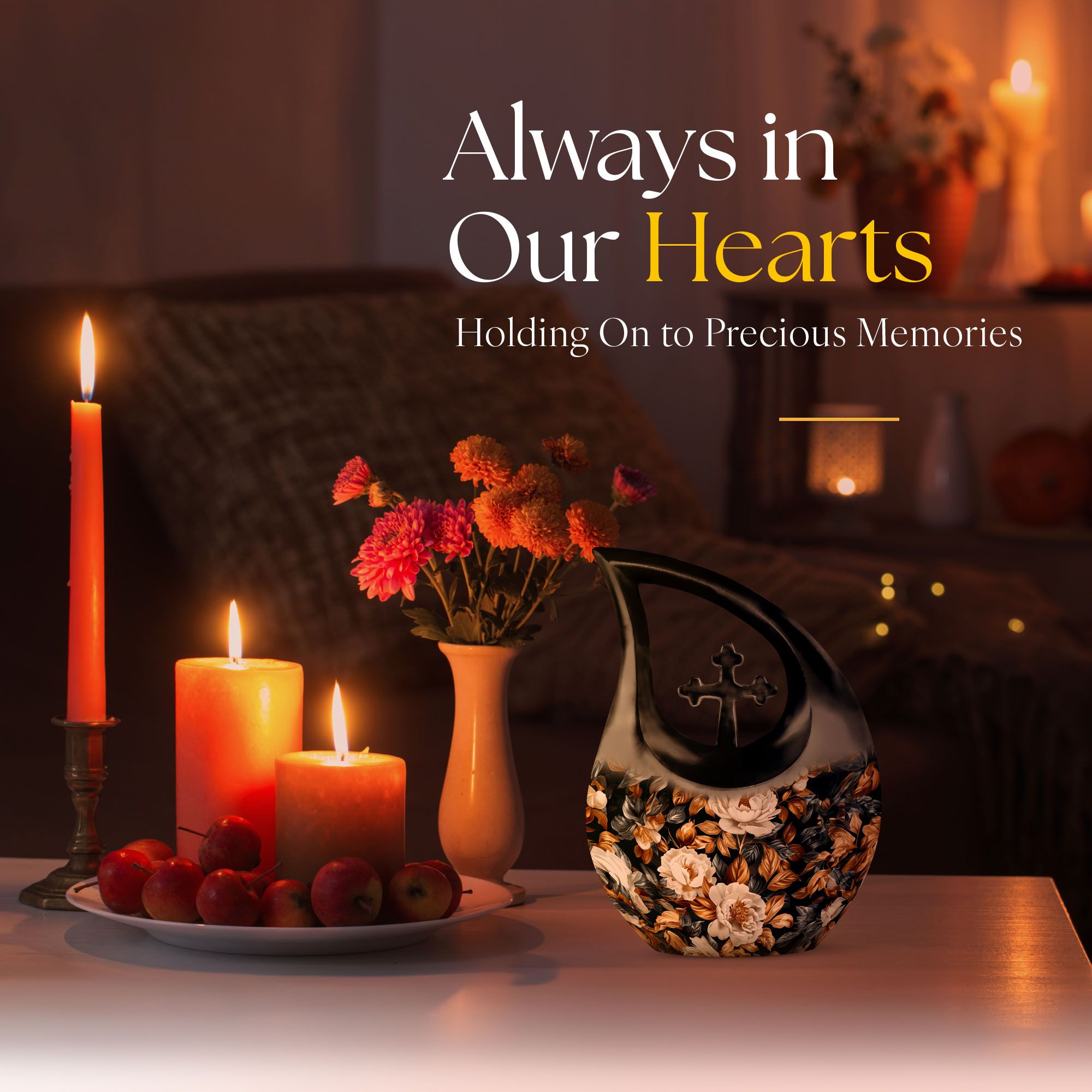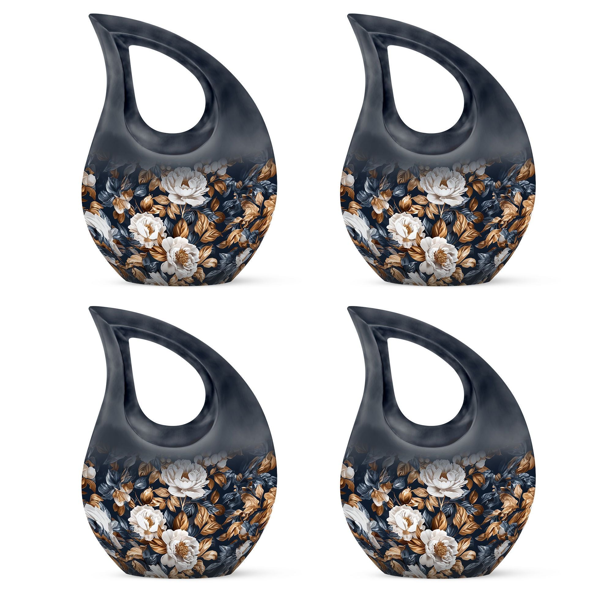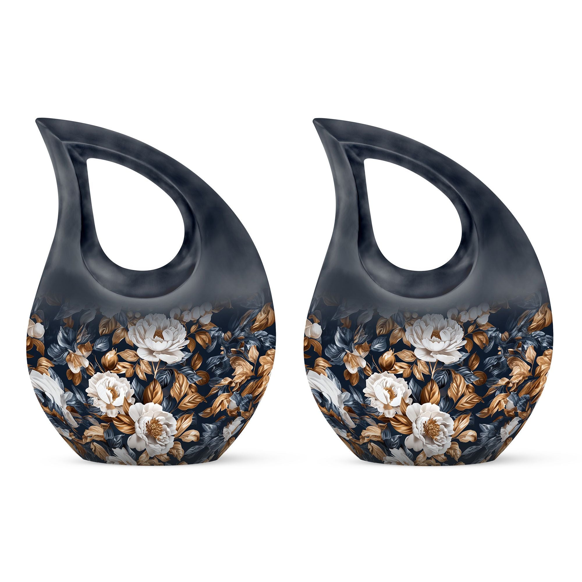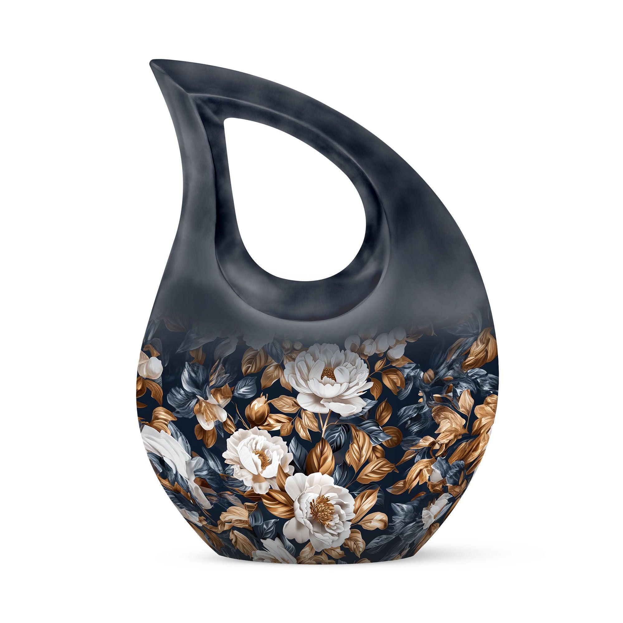 Honor the memory of a loved one with our 10-inch Flowers Urn, a thoughtfully designed large urn that subtly blends aesthetics and sentiment. Crafted from high-quality aluminum, it exhibits timelessness and longevity in the realm of 'memorial urns'. The ”Cross Drop” design resonates with serenity and sanctity that's synonymous with remembering the departed. The urn can hold up to 200 cubic inches, a substantial capacity suitable for adult and senior remains. It has a weight of 3.3 pounds and dimensions of 10 inches in height, which adds to its dignified presence. We offer the possibility of personalizing it with the engraved names, making it a unique memorial piece. The urn comes packaged in a velvet pouch, ensuring safe containment of ashes. Our product line also includes 'Miniature Urns For Ashes', 'Blue Urn For Ashes', and 'Garden Urns For Ashes' which are available for purchase. Make your selection from our 'Metal Cremation Urns' – a tangible embodiment of precious memories and love.