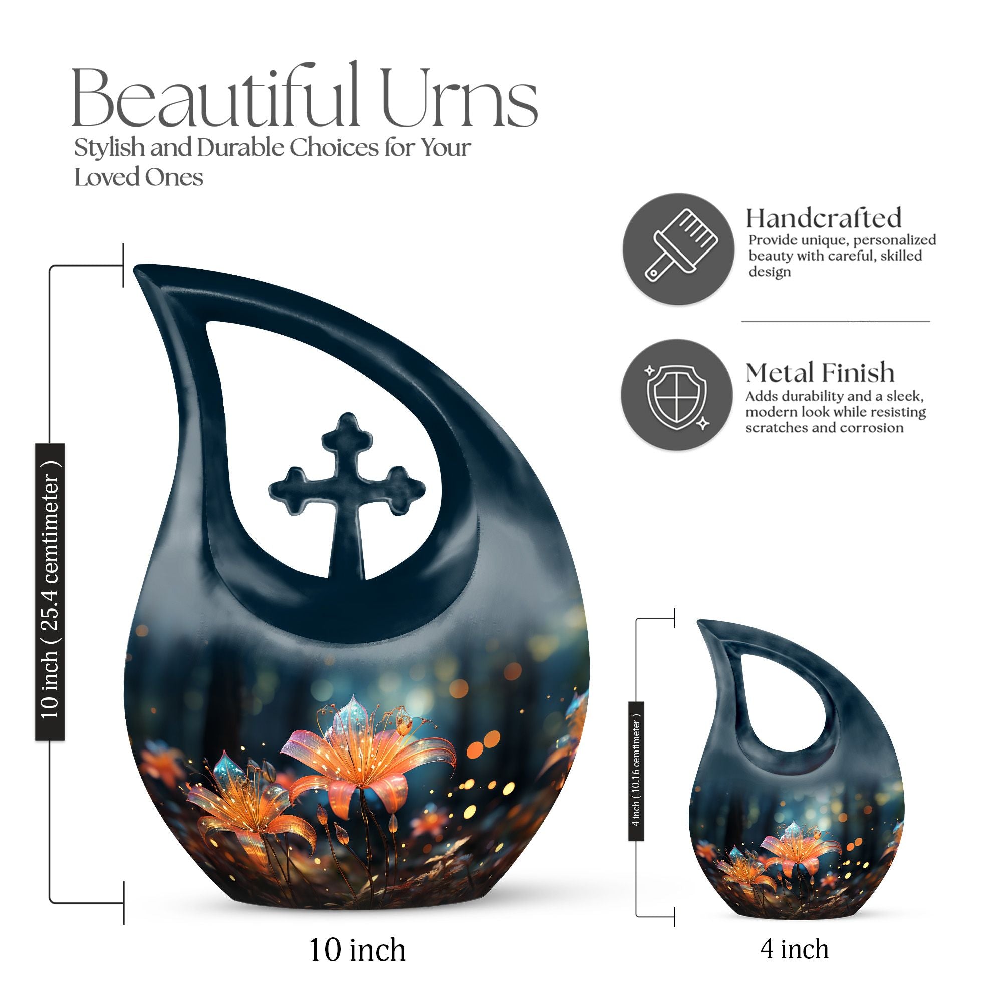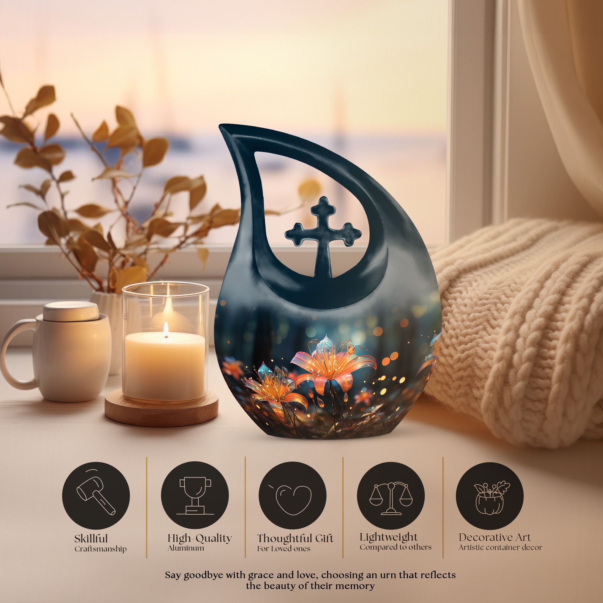 Expertly handcrafted from premium aluminum, this cremation urn features a delicate lily motif that glows softly under light — symbolizing serenity and eternal beauty. The compact size makes it ideal as a keepsake urn for women or a memorial accent for home display. Its secure screw-top lid ensures the ashes remain safely contained, while the polished finish adds a touch of sophistication and reverence.