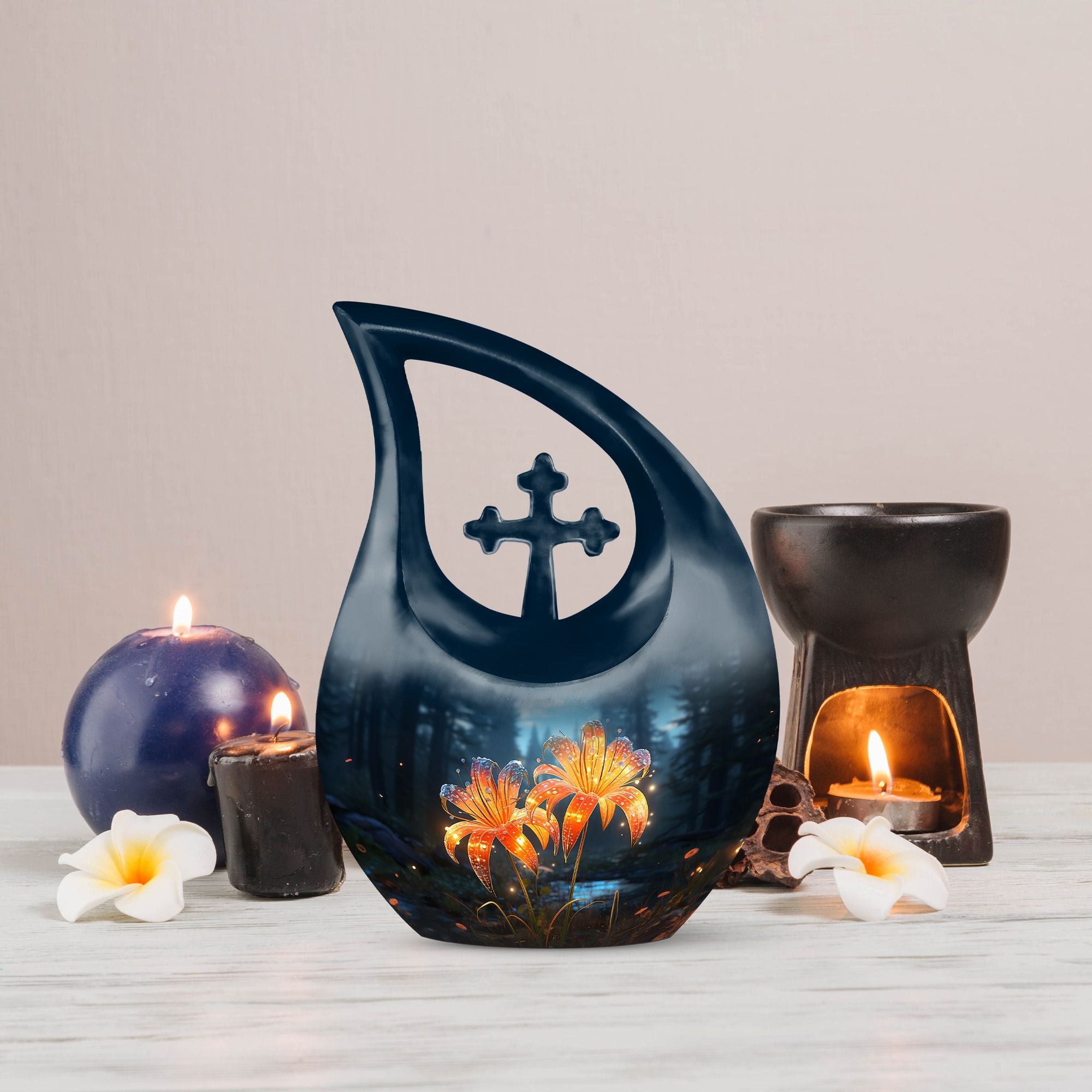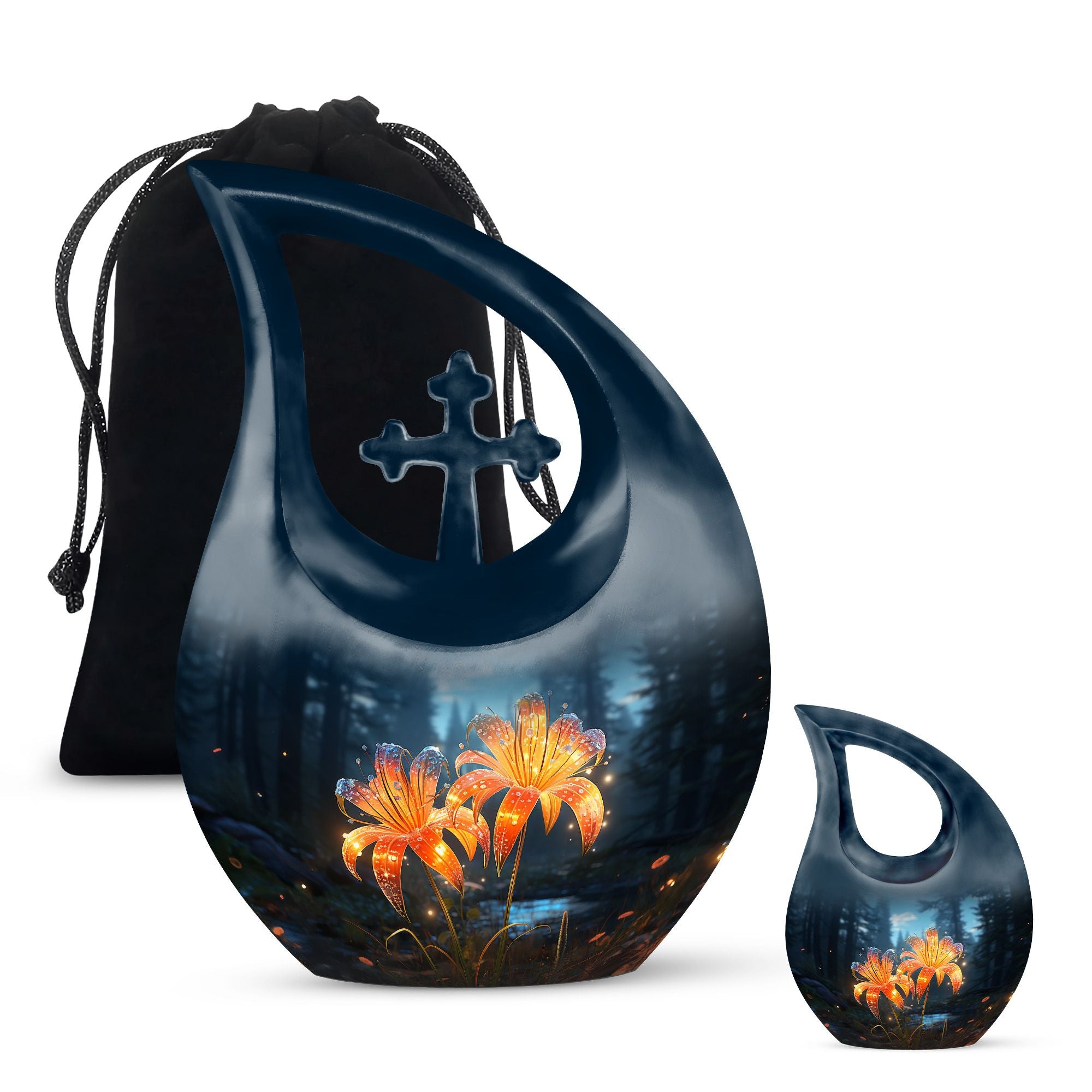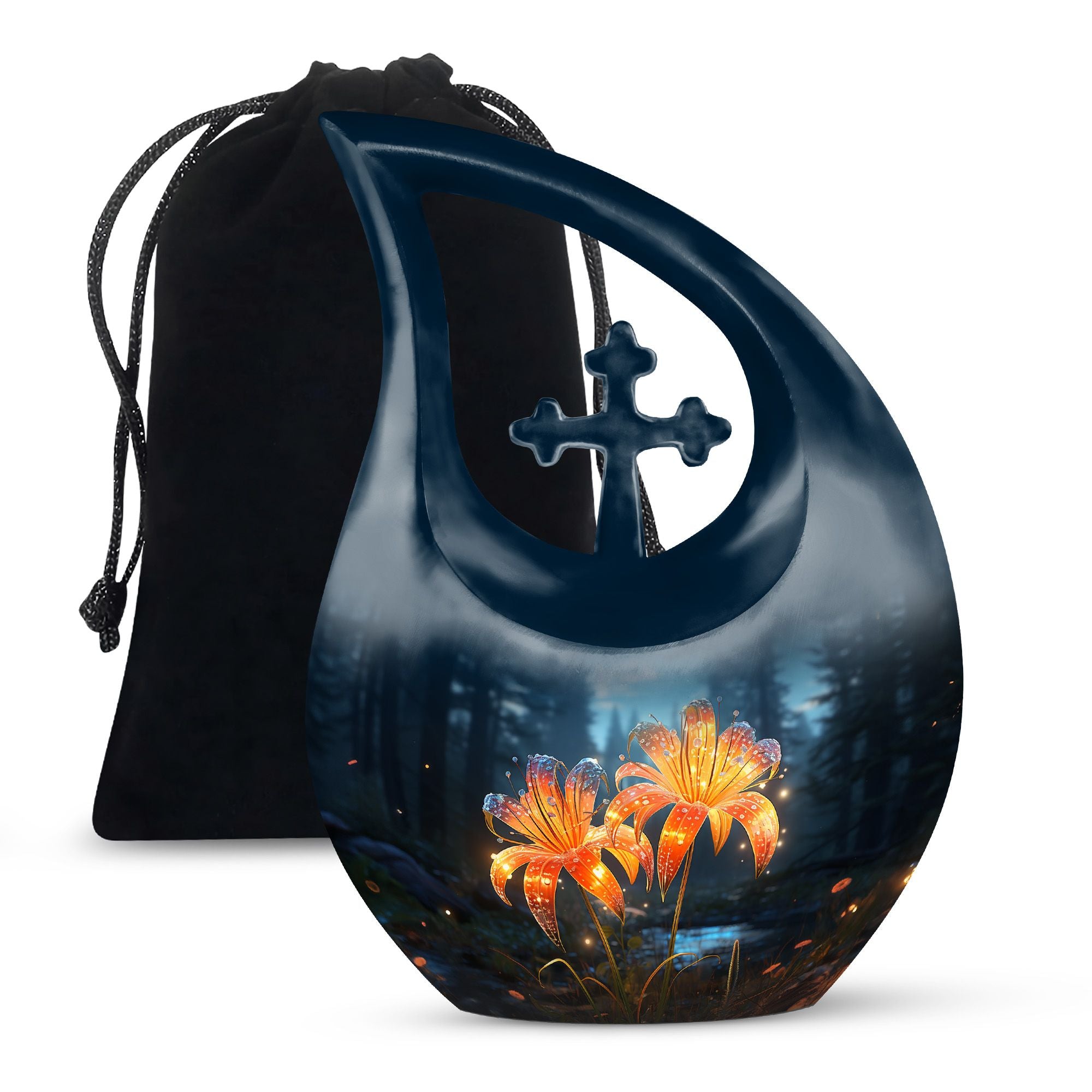 Celebrate a cherished life with our Black Teardrop Burial Urn, beautifully designed with Twin Orange Lily Flowers and a Cross. The glowing orange lilies represent renewal, courage, and the warmth of everlasting love, while the cross stands as a timeless symbol of faith. Whether chosen as a large urn for adult ashes or a special large urn mom, this design offers families a graceful and comforting tribute to a life well-lived.