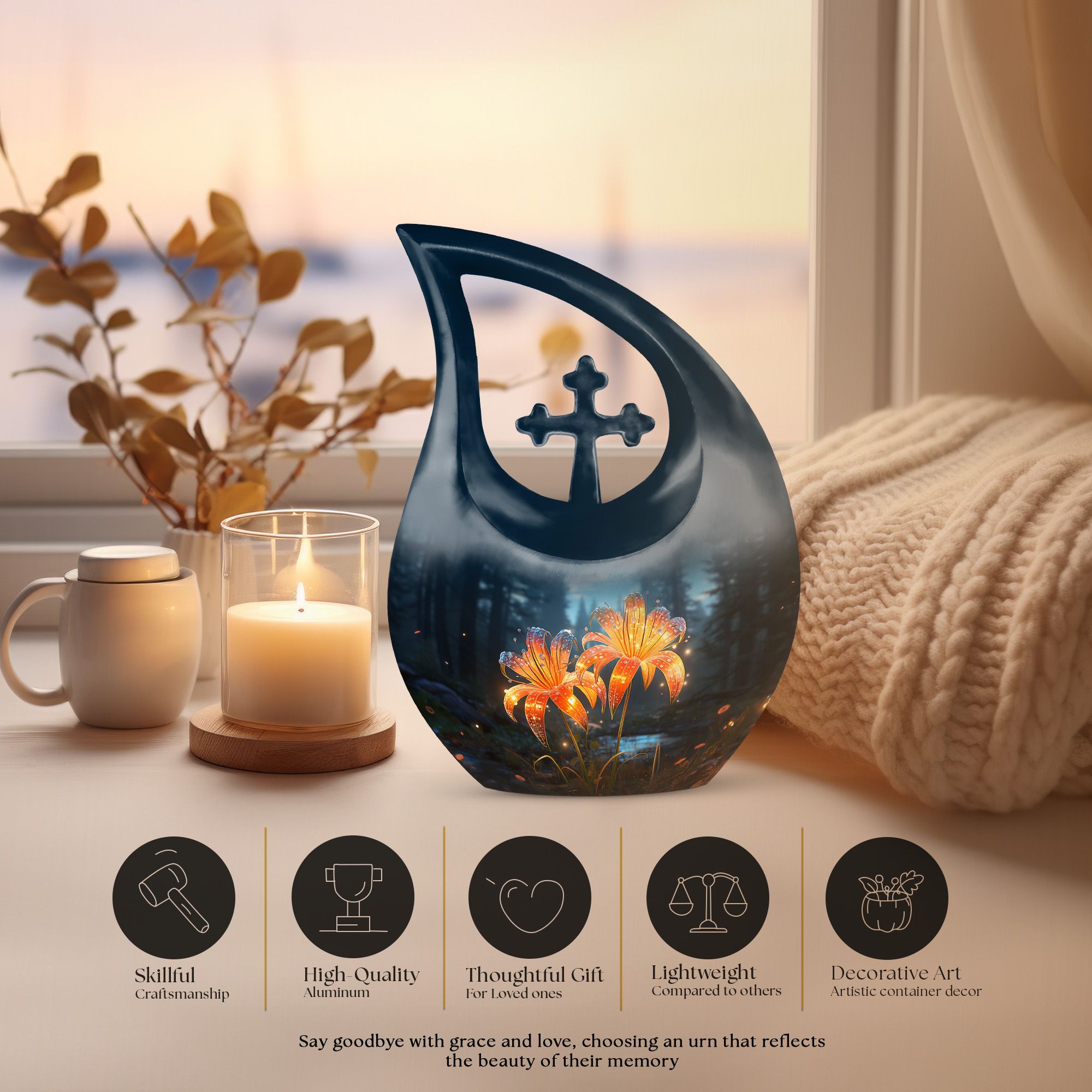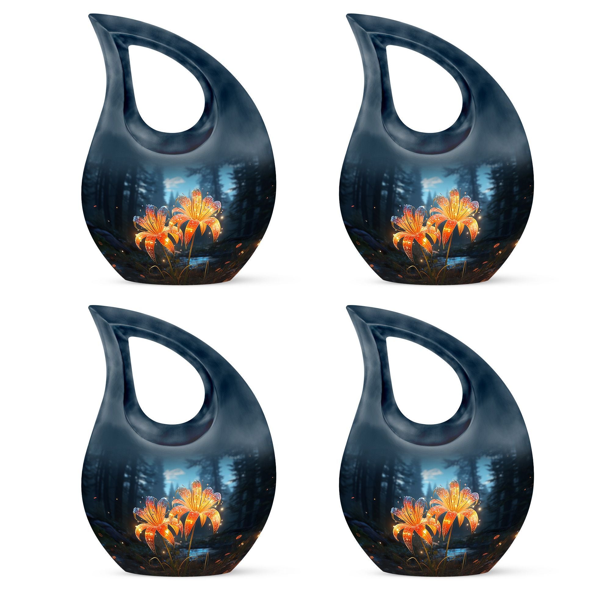 Expertly handcrafted from durable, high-quality aluminum, this large cremation urn blends strength, elegance, and artistry. Its sleek teardrop silhouette in deep black is accentuated by radiant orange lilies that softly illuminate the surface, bringing both visual beauty and emotional meaning. Ideal for both men and women, this human urn for ashes adult large provides a secure and dignified resting place. The threaded screw-top lid ensures ashes remain safely preserved, making it a reliable and lasting choice for home display or burial.