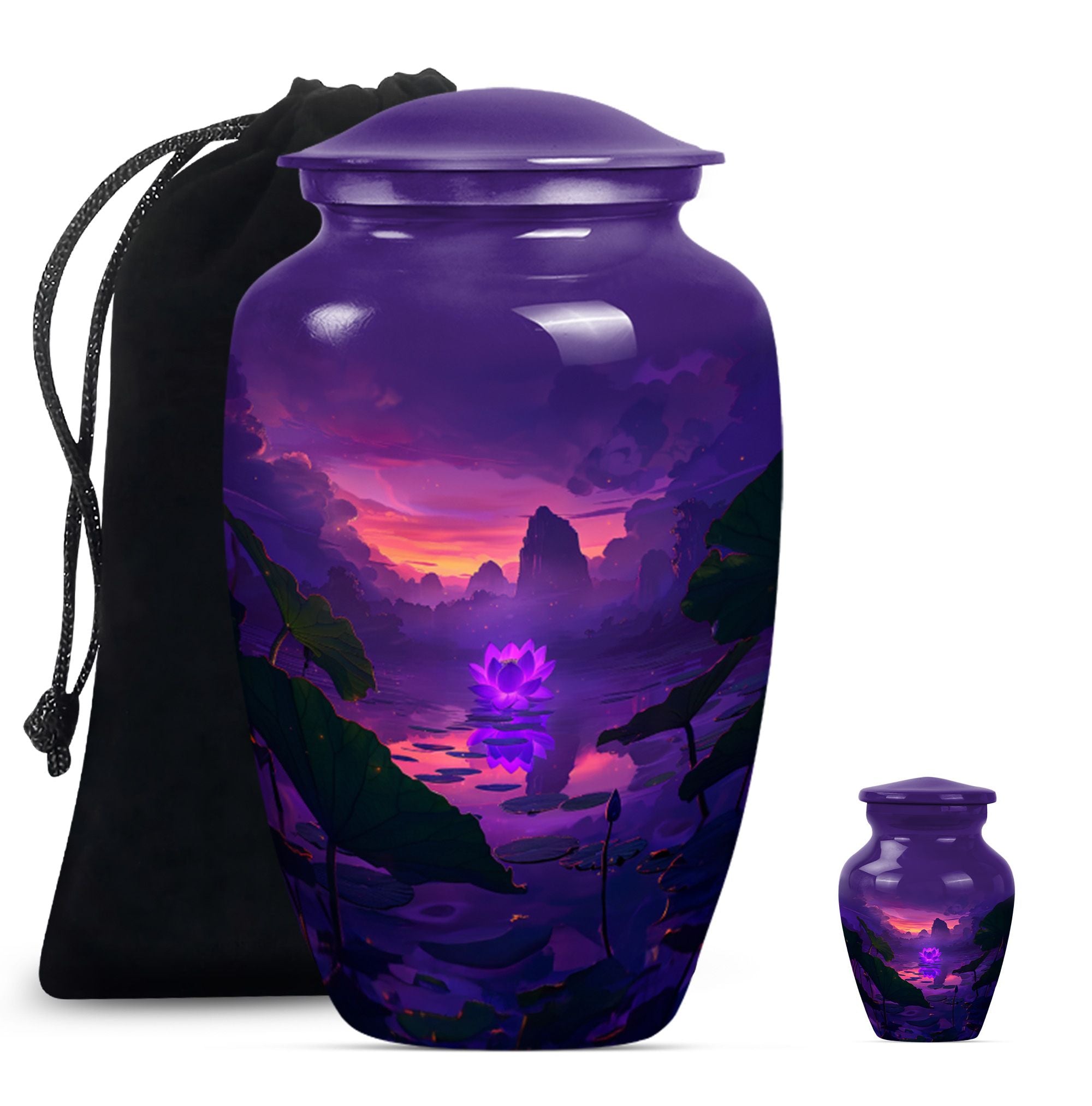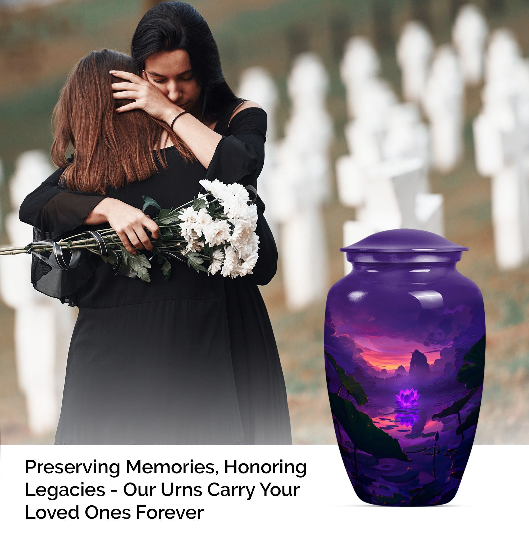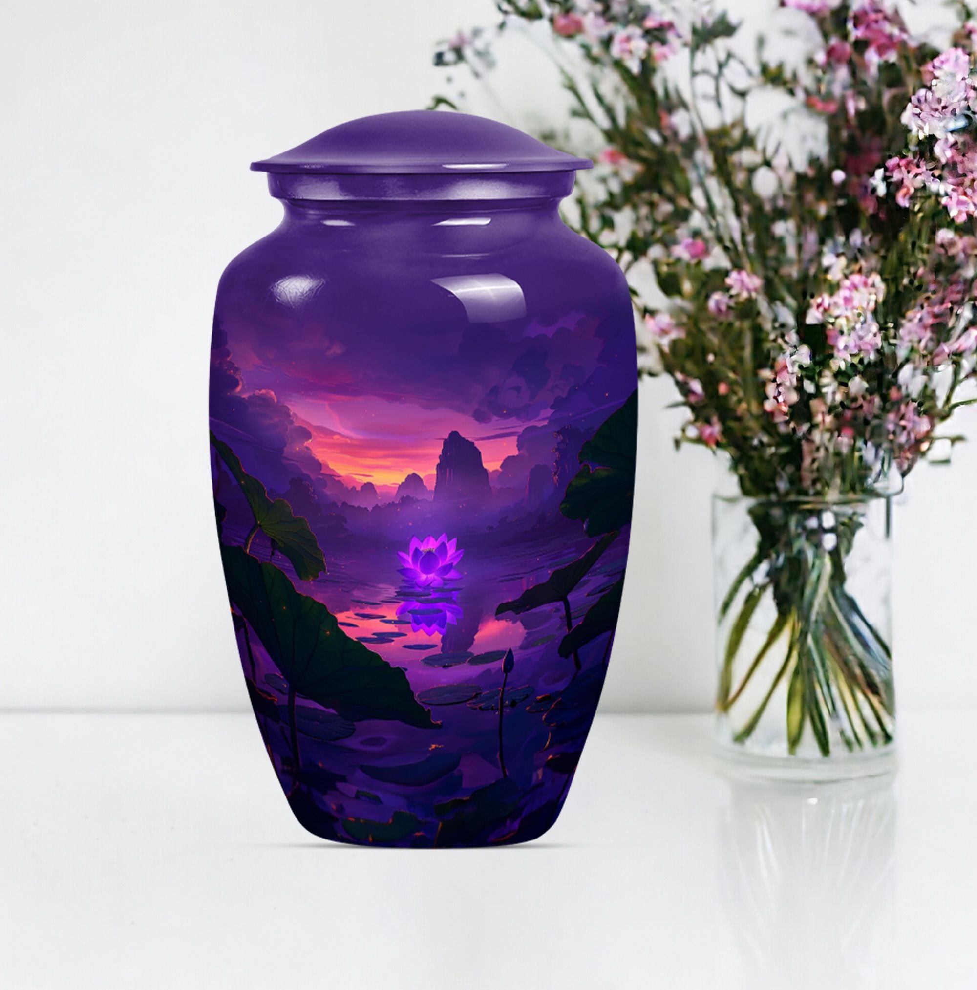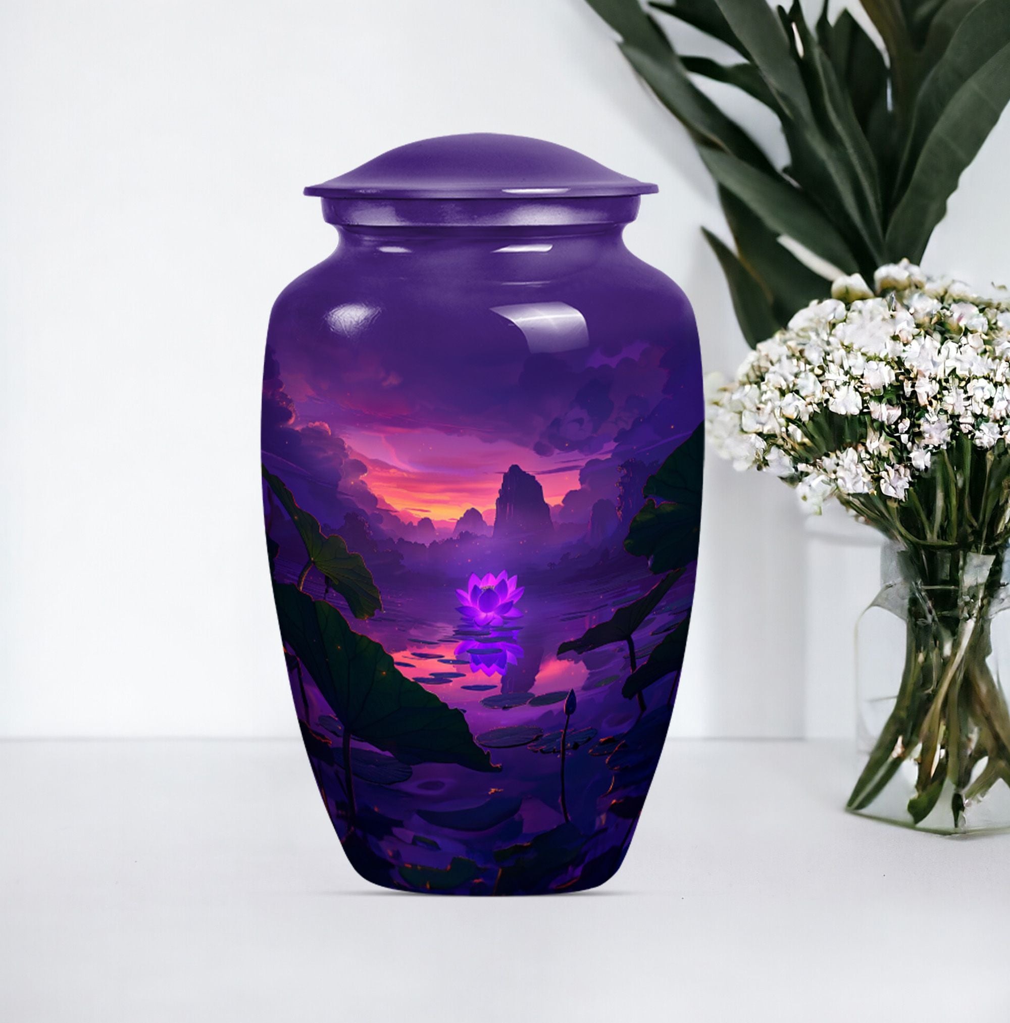 Cherish the memories of your loved ones with our 10-inch Lotus Urn, a prestigious selection in funeral urns for human ashes. Crafted meticulously from top-quality aluminium, this 3.3-pound urn is characterized by an abstract theme. Its large type generously accommodates 200 cubic inches of ashes, making it a fitting resting place for your dear one. This memorable piece comes in a classic urn style that exudes a timeless appeal, further signifying enduring love and tribute. Our memorial urns are uniquely delivered with a velvet pouch to respectfully contain and protect the ashes. Enhance this urn's uniqueness by personalizing it with engraved names, tailoring a touching tribute to the departed soul. Savour the lasting reminiscences with our lotus urn, a timeless piece amongst stone urns that is shaped with utmost respect and care for your emotional sentiments. Note: Design is not a key feature of this urn.