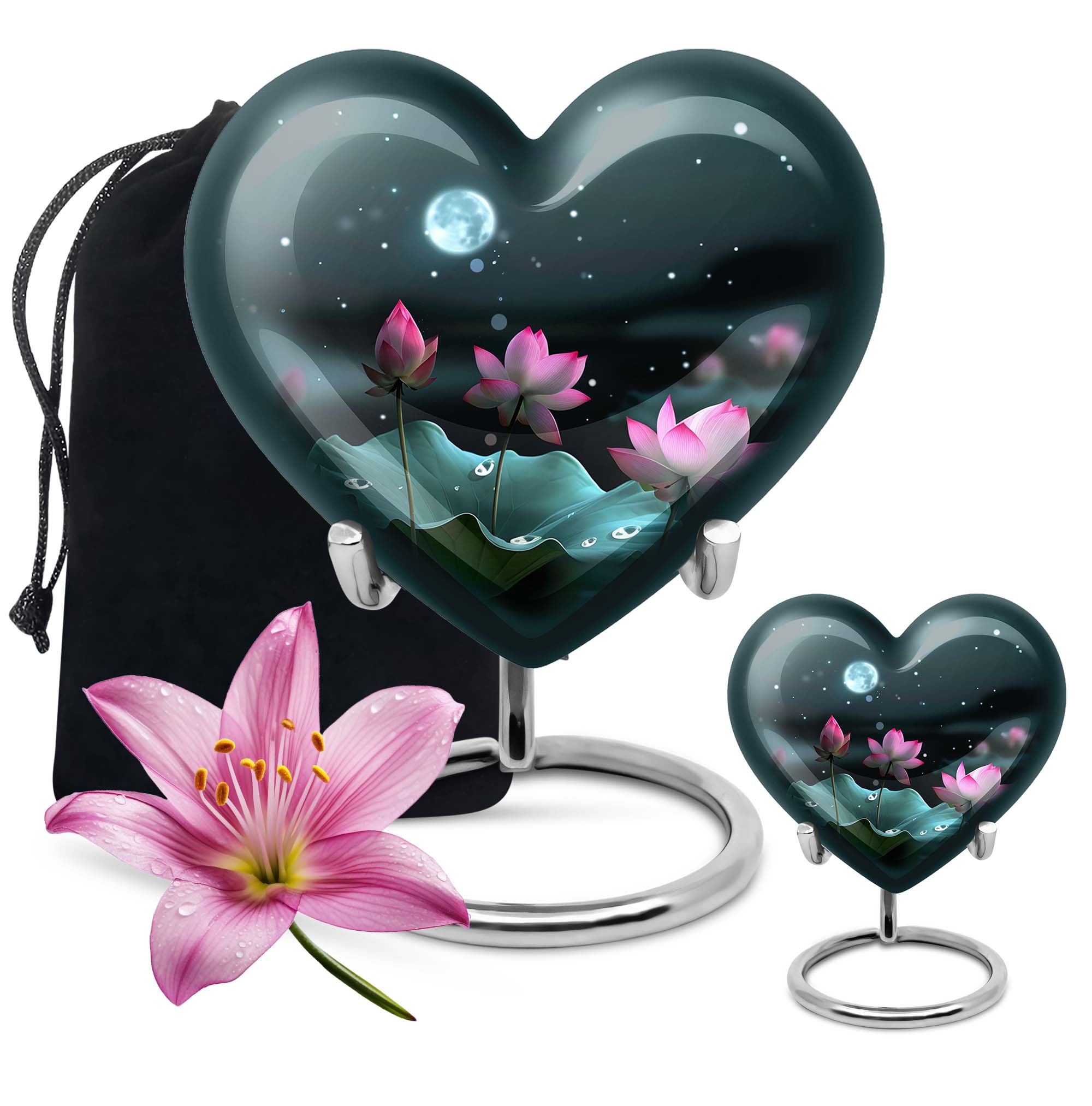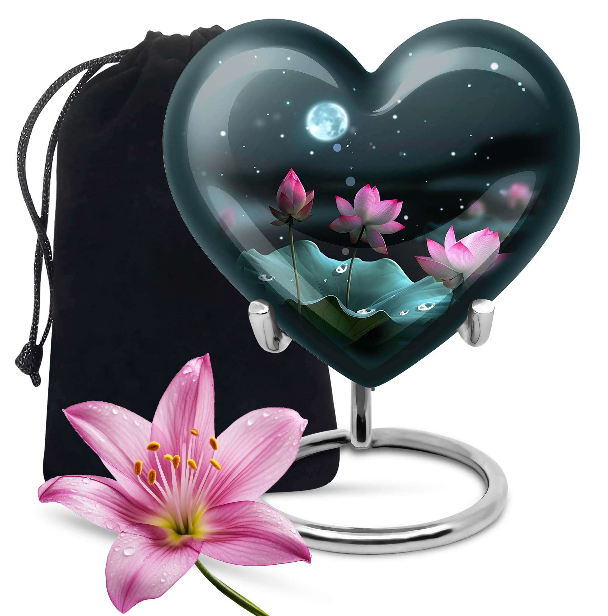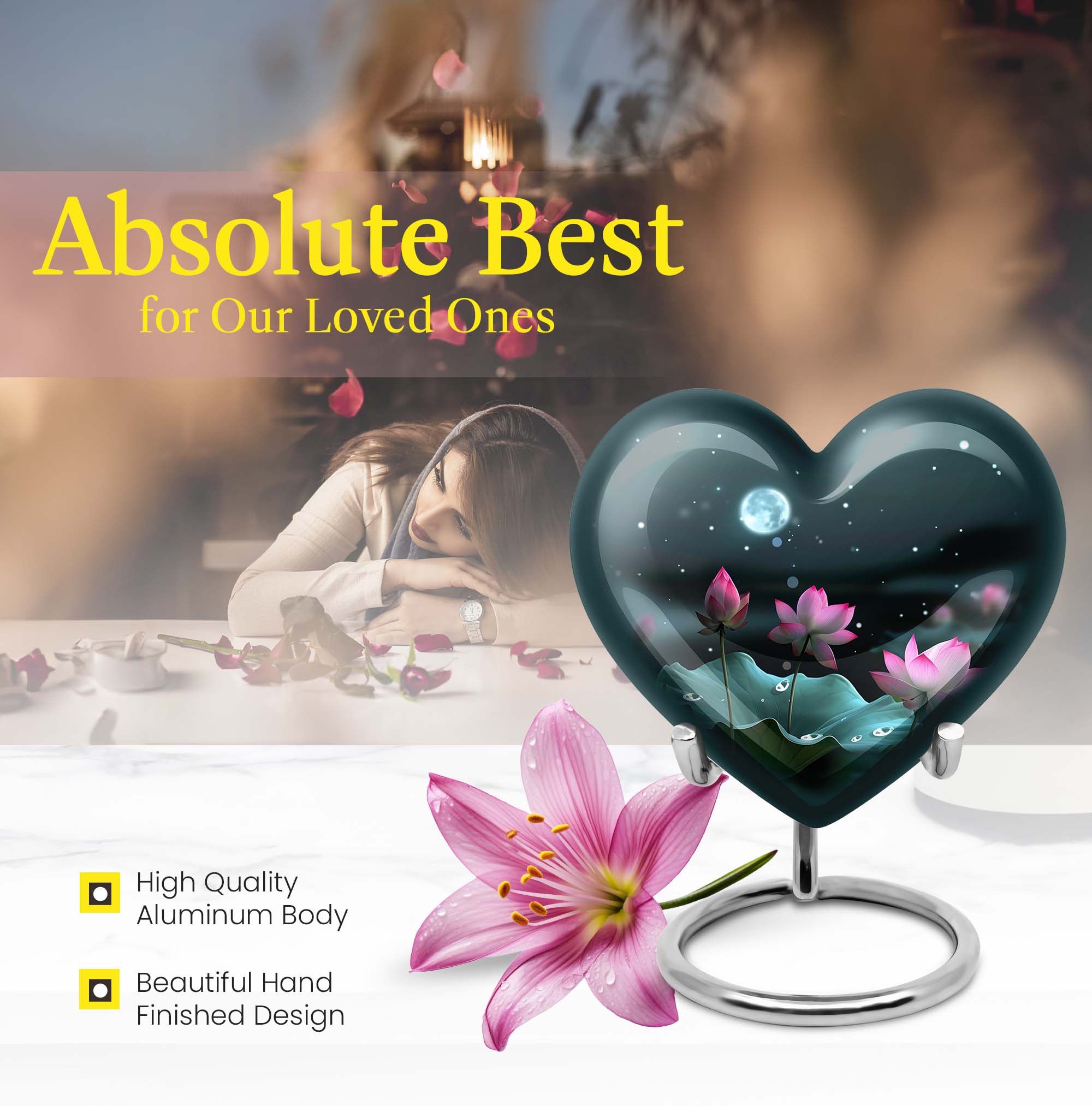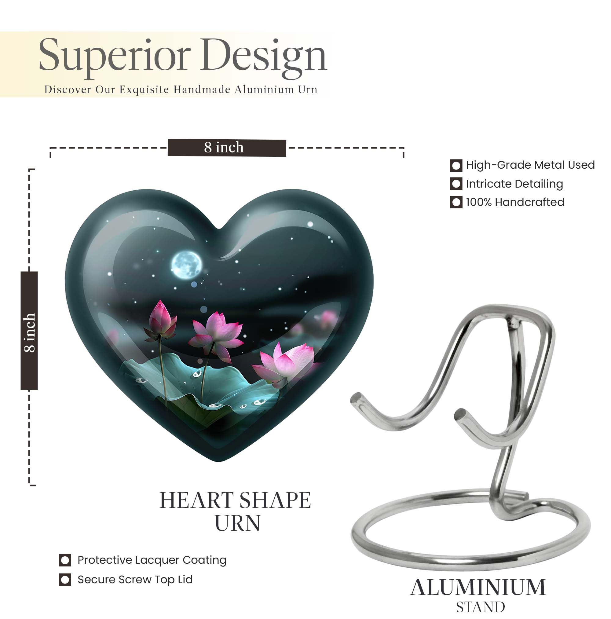 Cherish your loved ones' memories with our meticulously crafted Lotus Urn; a sentimentally significant funeral urn for ashes. This 10 Inch memorial piece is a true emblem of eternal love crafted eloquently into the shape of a heart. Featuring an intrigue abstract theme, it stands as a unique tribute to those passed yet always present in spirit. This large urn, weighing 3.3 pounds, boasts a generous capacity of 200 cubic inches, suitable for the containment of ashes for both adult males or women. Fabricated with robust, durable aluminium material, and an additional velvet pouch for a final touch of elegance and safety. Personalize your urn with the engraved names of your dear ones, adding an extra layer of intimacy. Uncommonly artful, our Lotus Urn serves as a poignant dedication, a silent conversation with the departed dearly. Please note, this cremation urn, whether designated as an urn for mom or a burial urn for any loved one, is designed to hold more than just ashes; it encapsulates feelings, and lastly, the never-ending bond of love.