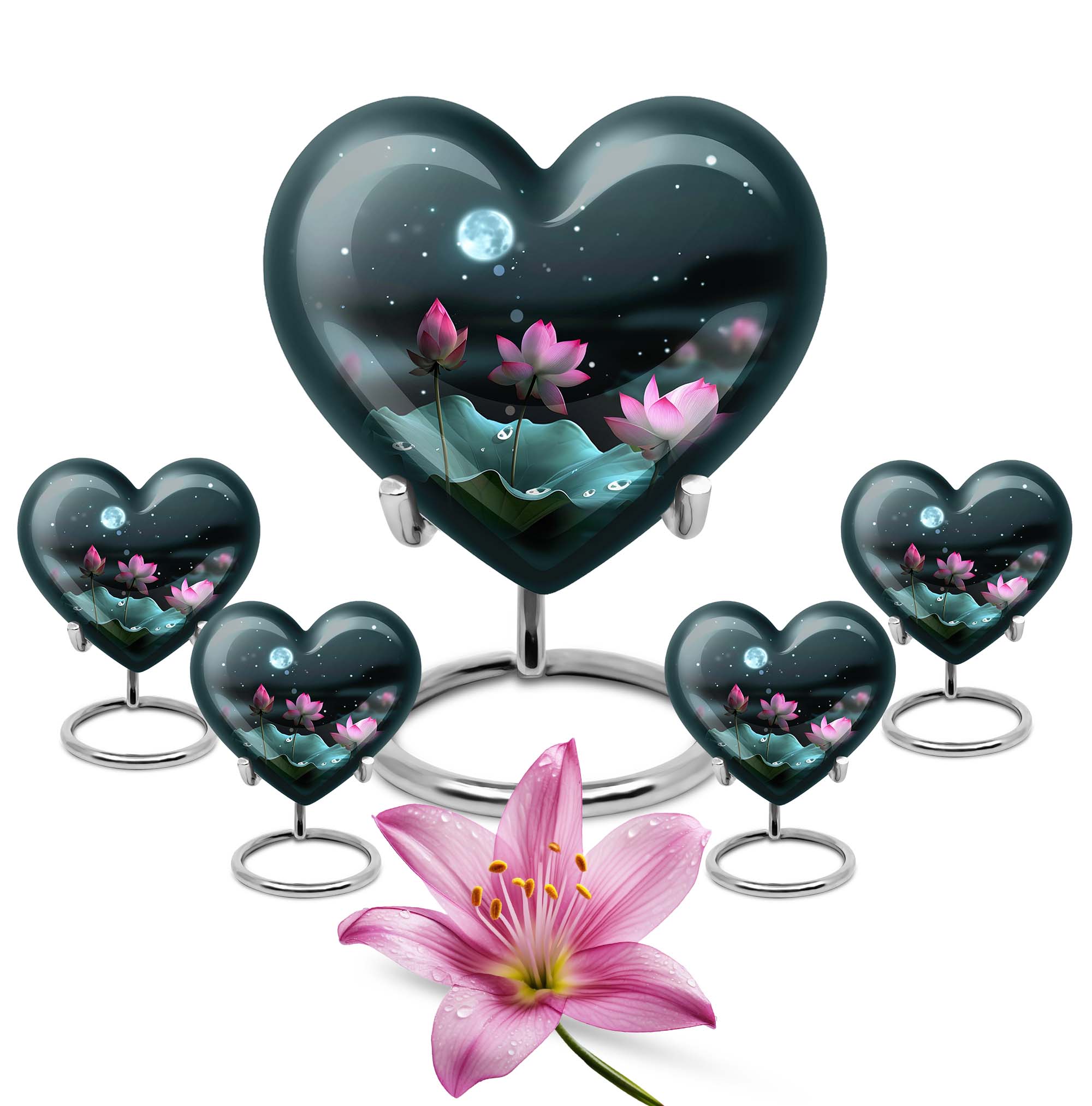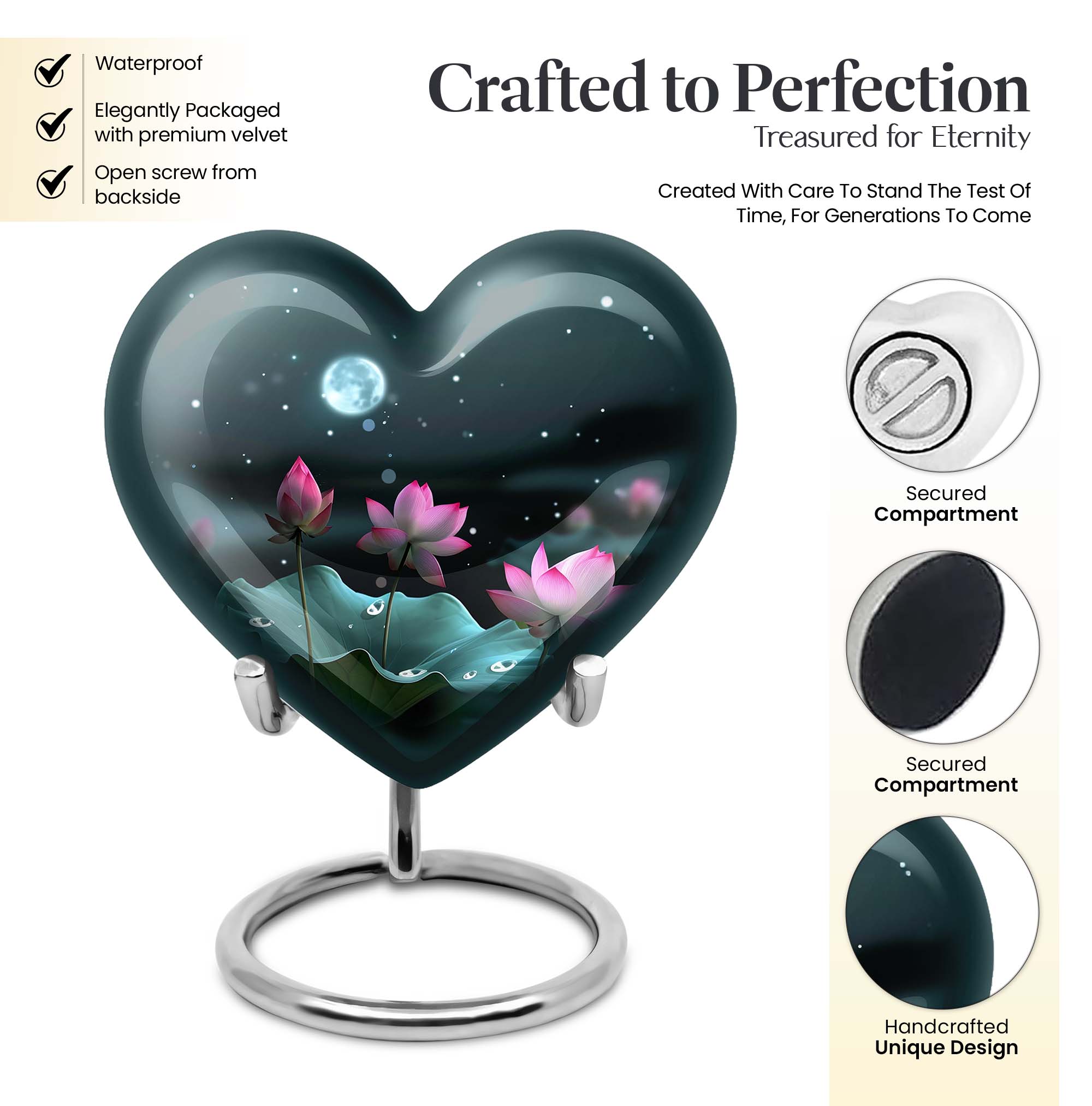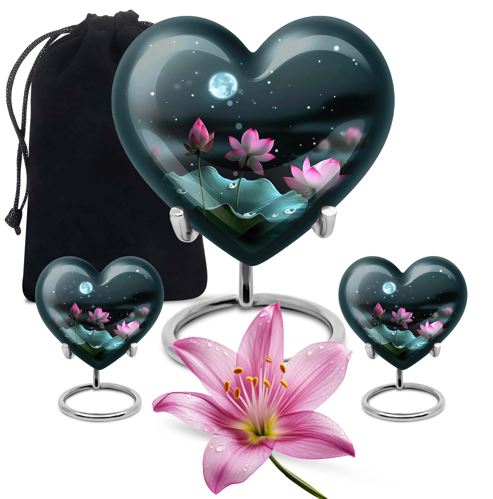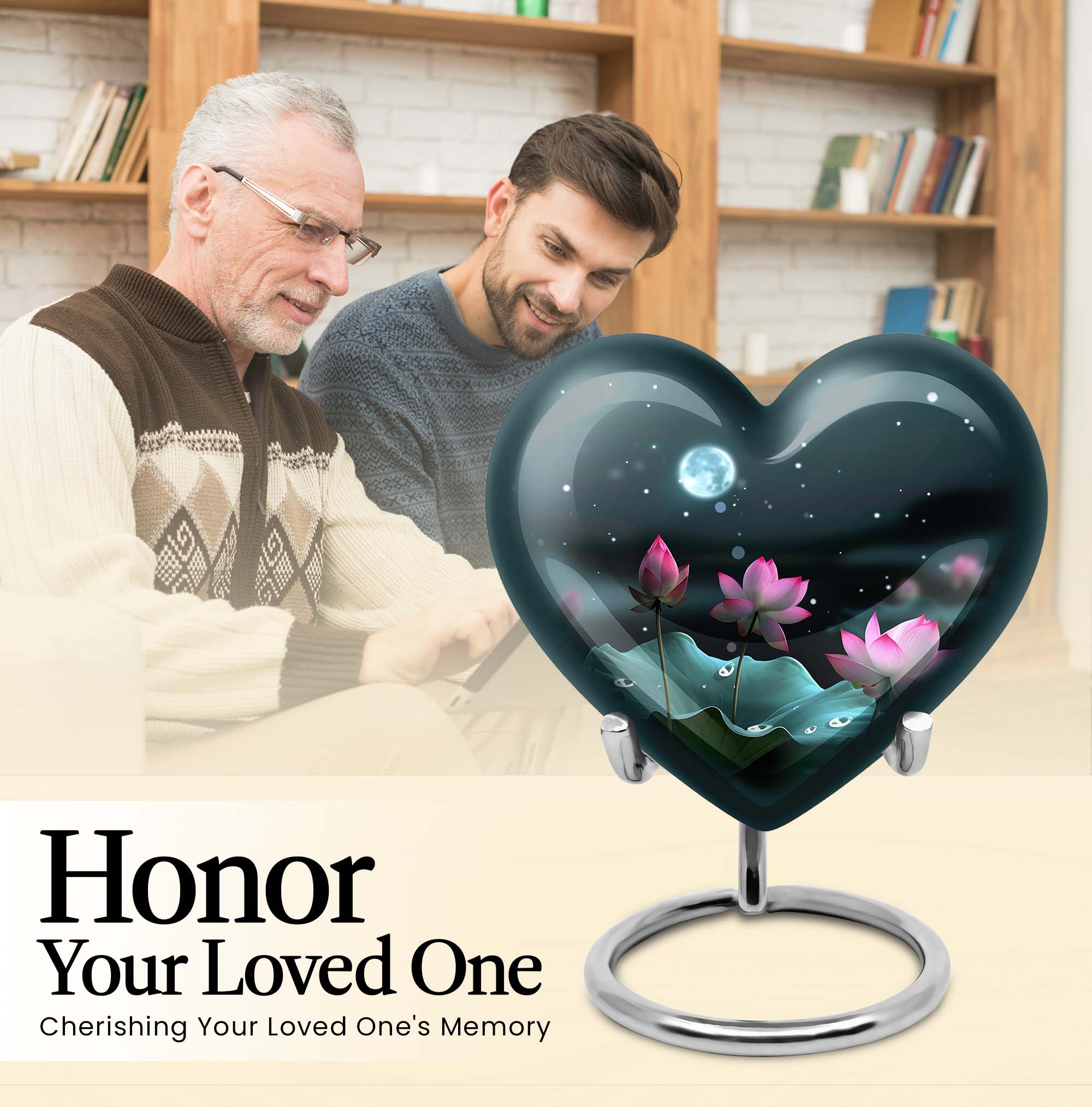 Cherish your loved ones' memories with our meticulously crafted Lotus Urn; a sentimentally significant funeral urn for ashes. This 10 Inch memorial piece is a true emblem of eternal love crafted eloquently into the shape of a heart. Featuring an intrigue abstract theme, it stands as a unique tribute to those passed yet always present in spirit. This large urn, weighing 3.3 pounds, boasts a generous capacity of 200 cubic inches, suitable for the containment of ashes for both adult males or women. Fabricated with robust, durable aluminium material, and an additional velvet pouch for a final touch of elegance and safety. Personalize your urn with the engraved names of your dear ones, adding an extra layer of intimacy. Uncommonly artful, our Lotus Urn serves as a poignant dedication, a silent conversation with the departed dearly. Please note, this cremation urn, whether designated as an urn for mom or a burial urn for any loved one, is designed to hold more than just ashes; it encapsulates feelings, and lastly, the never-ending bond of love.
