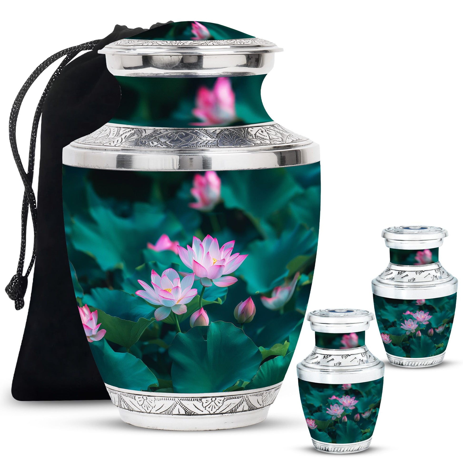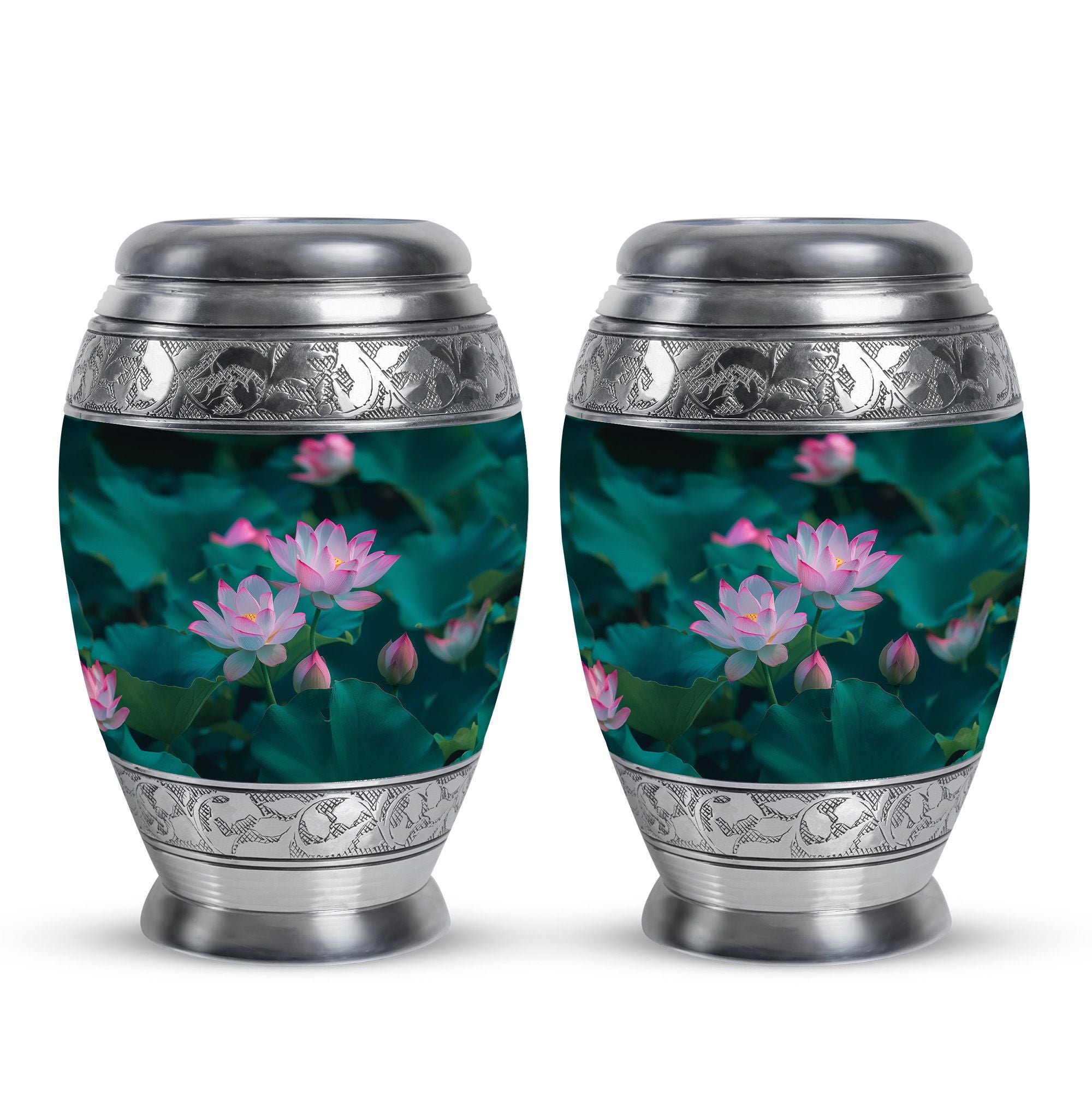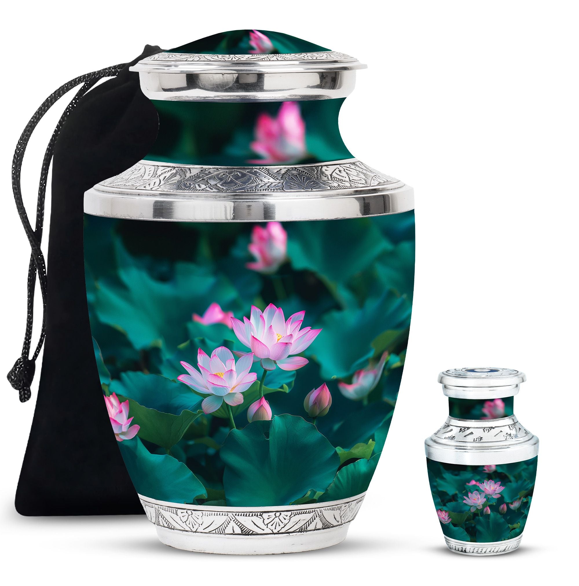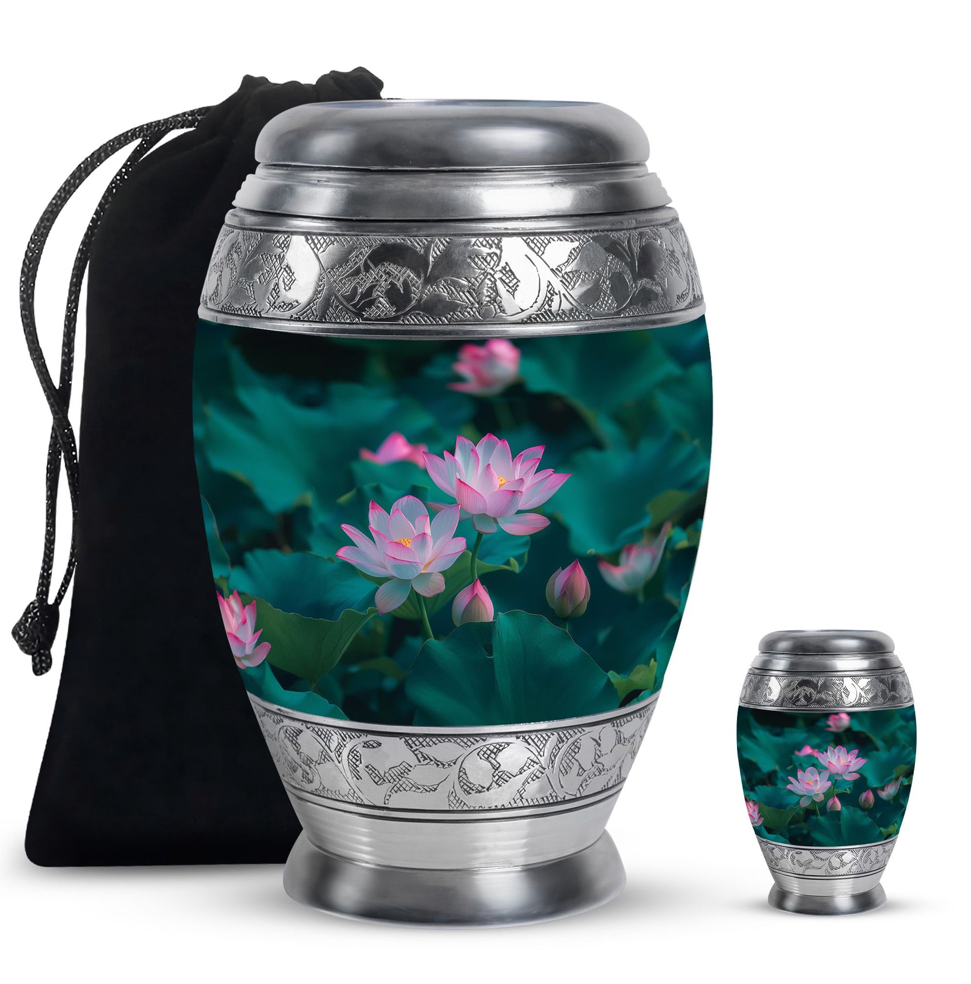 Expertly handcrafted from durable aluminum, this urn features a polished finish and an elegant lotus motif, symbolizing purity and renewal. Its secure screw-top lid ensures your loved one’s remains are protected with care. Designed as a funeral urn – memorial urn, it is suitable for both display and services. Families may also select cremation urns large & small combo to share ashes in keepsake sets, creating a lasting connection among loved ones.