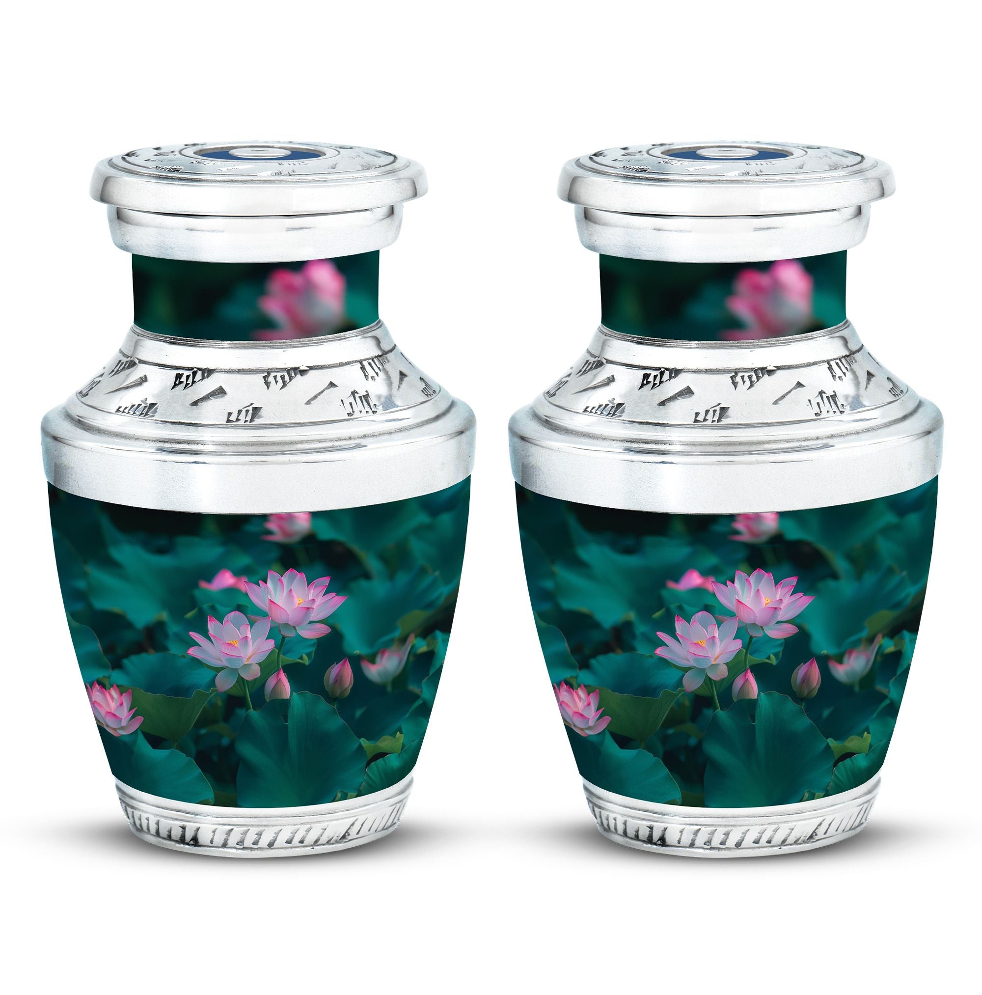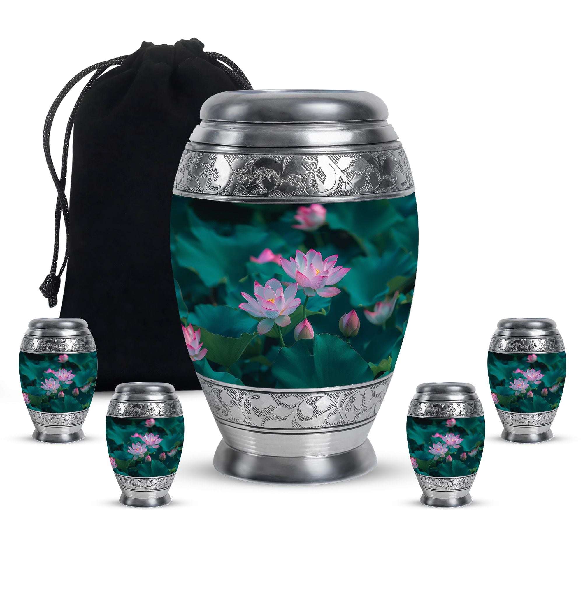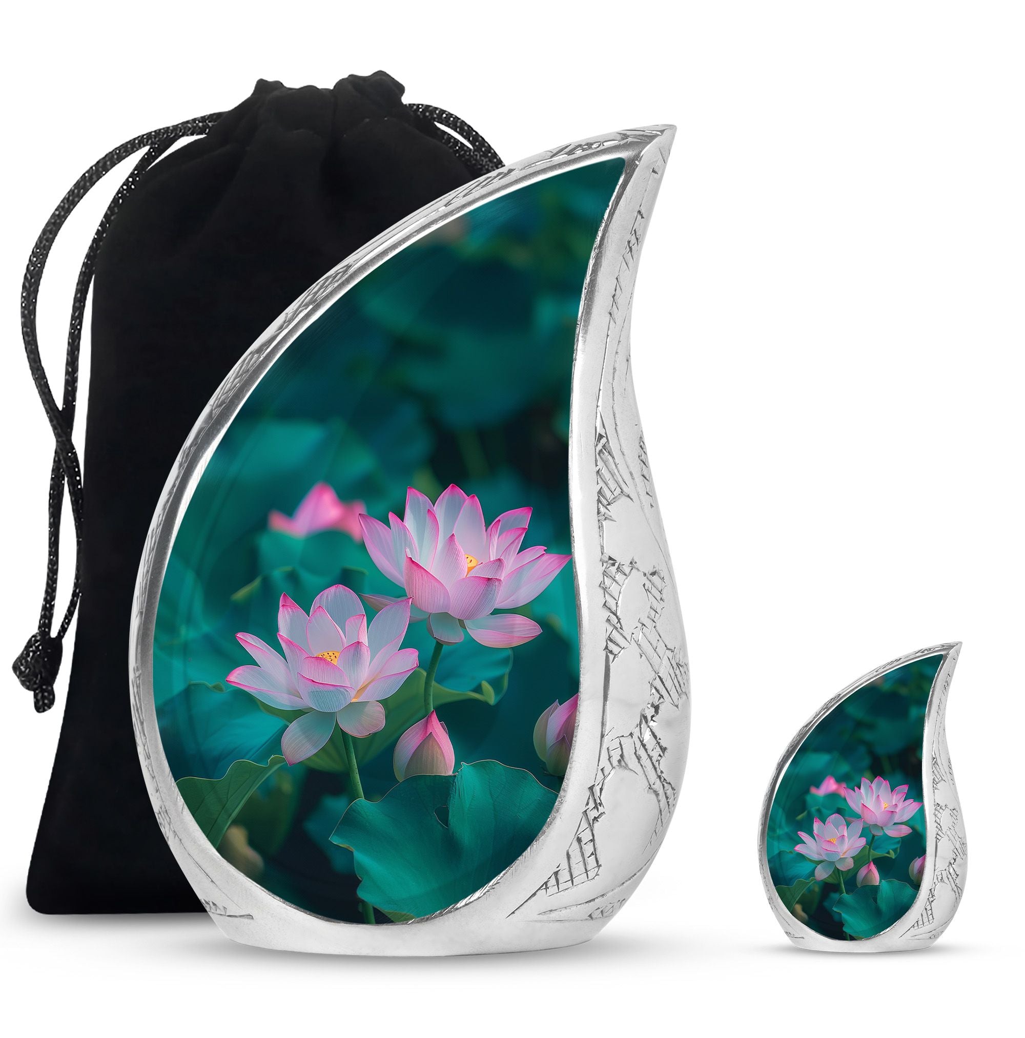 Expertly handcrafted from durable aluminum, this urn features a polished finish and an elegant lotus motif, symbolizing purity and renewal. Its secure screw-top lid ensures your loved one’s remains are protected with care. Designed as a funeral urn – memorial urn, it is suitable for both display and services. Families may also select cremation urns large & small combo to share ashes in keepsake sets, creating a lasting connection among loved ones.
