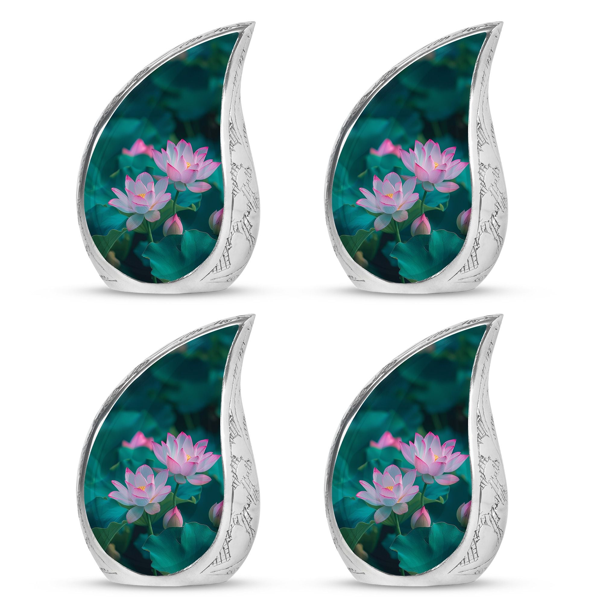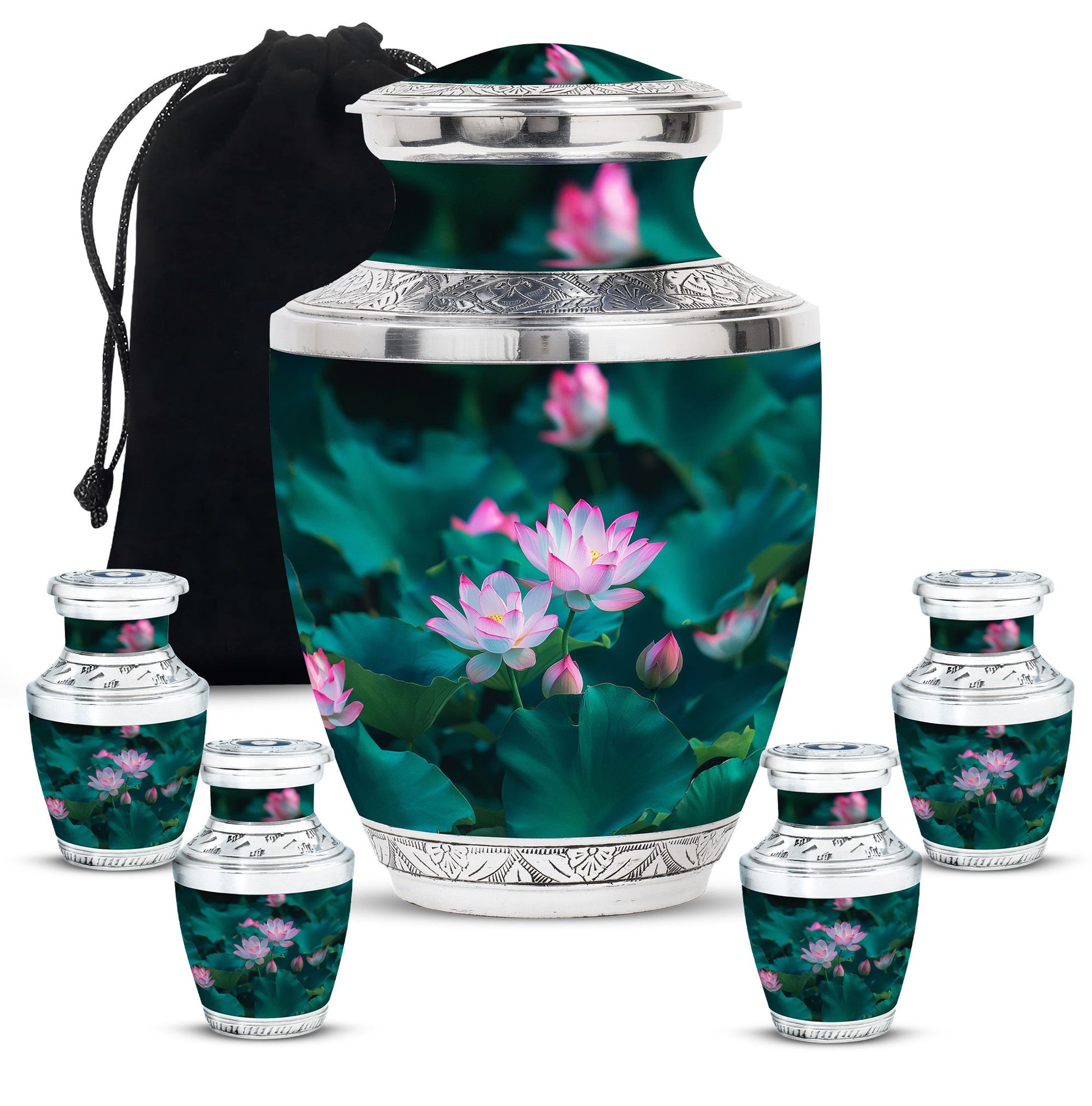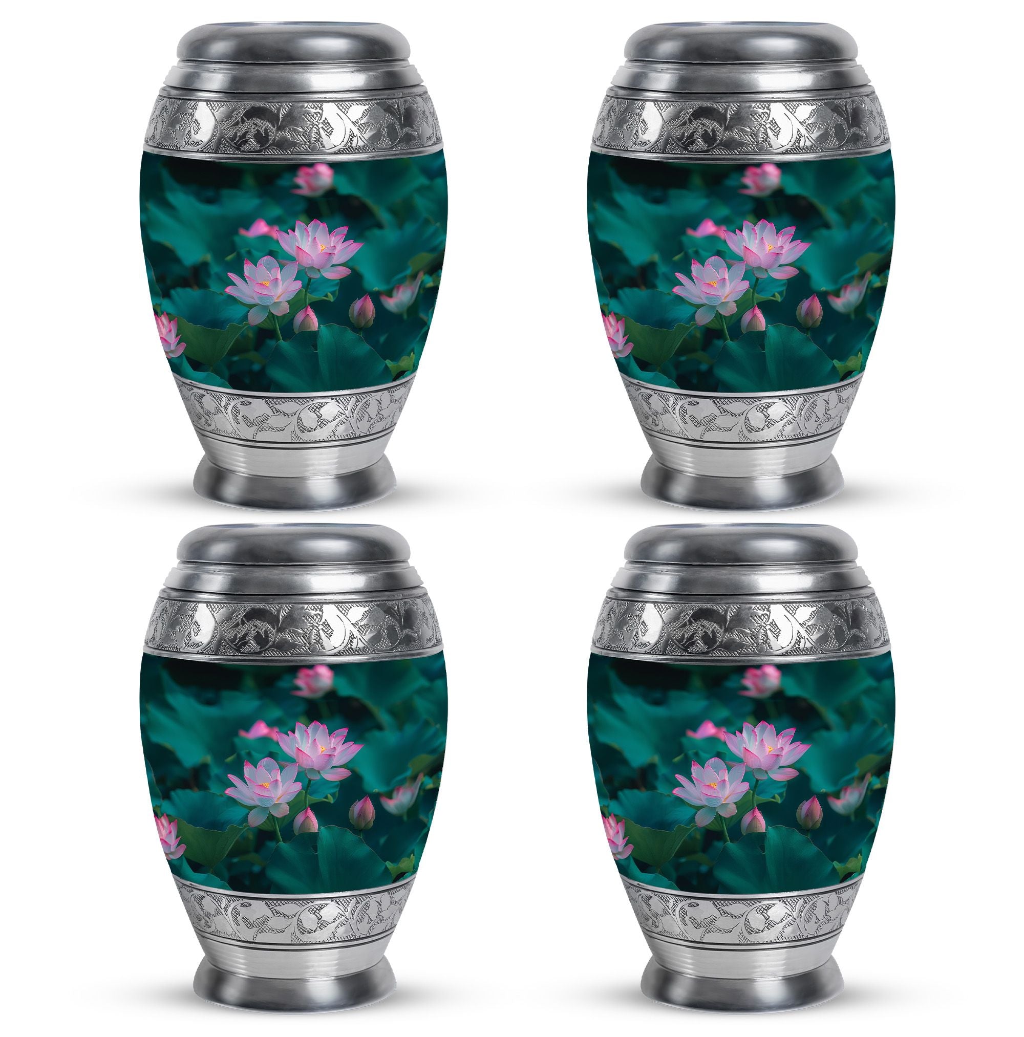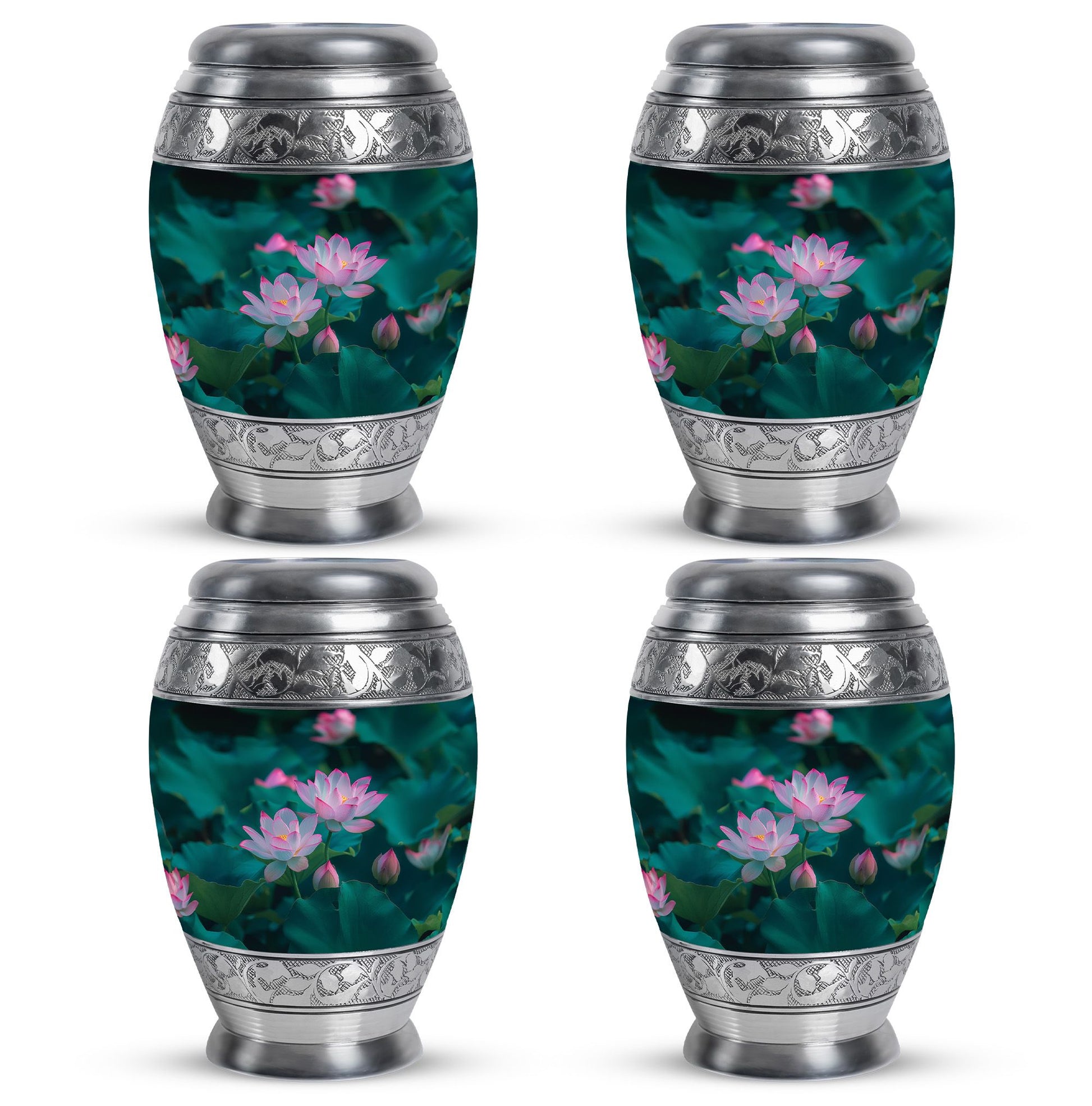 Expertly handcrafted from durable aluminum, this urn features a polished finish and an elegant lotus motif, symbolizing purity and renewal. Its secure screw-top lid ensures your loved one’s remains are protected with care. Designed as a funeral urn – memorial urn, it is suitable for both display and services. Families may also select cremation urns large & small combo to share ashes in keepsake sets, creating a lasting connection among loved ones.