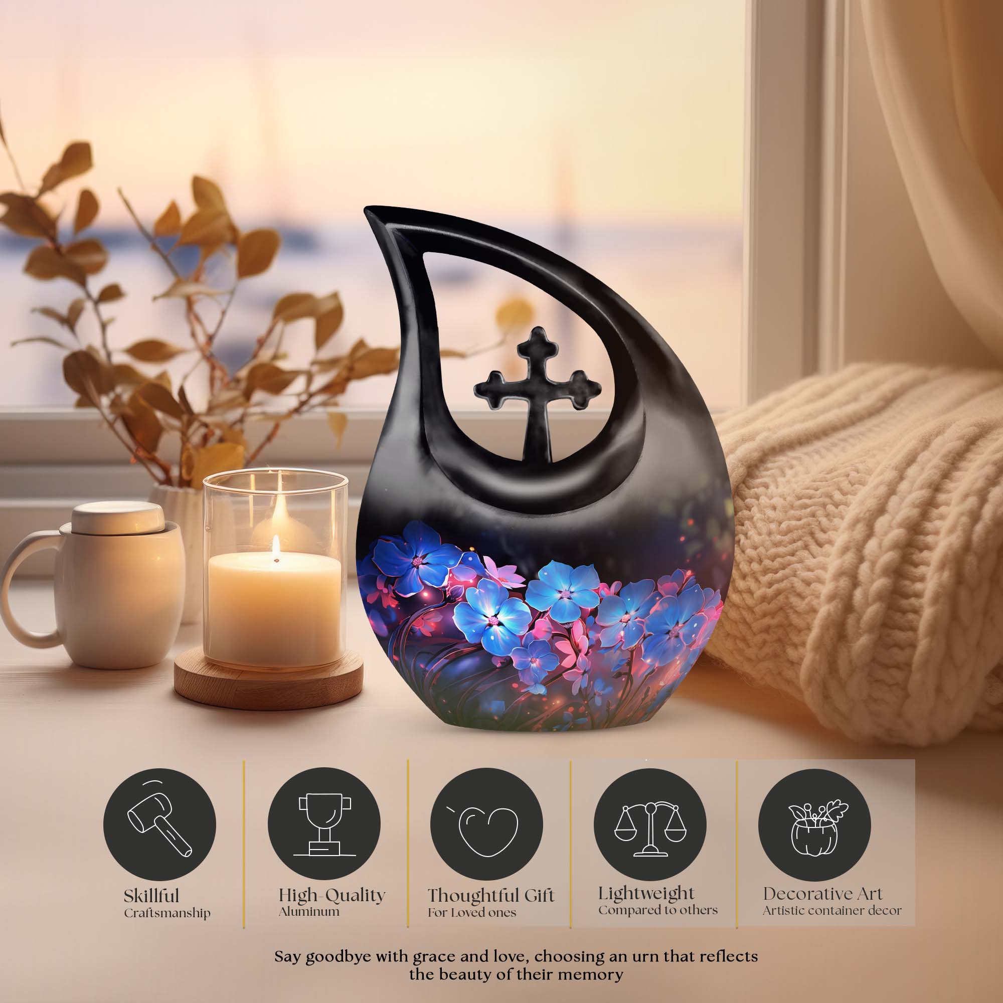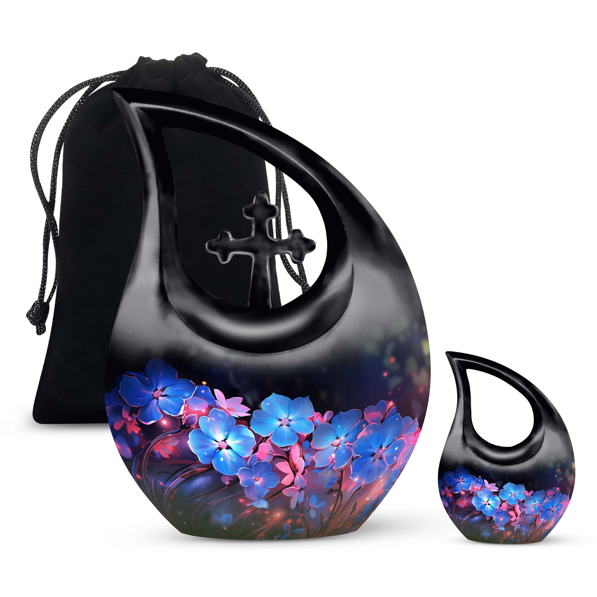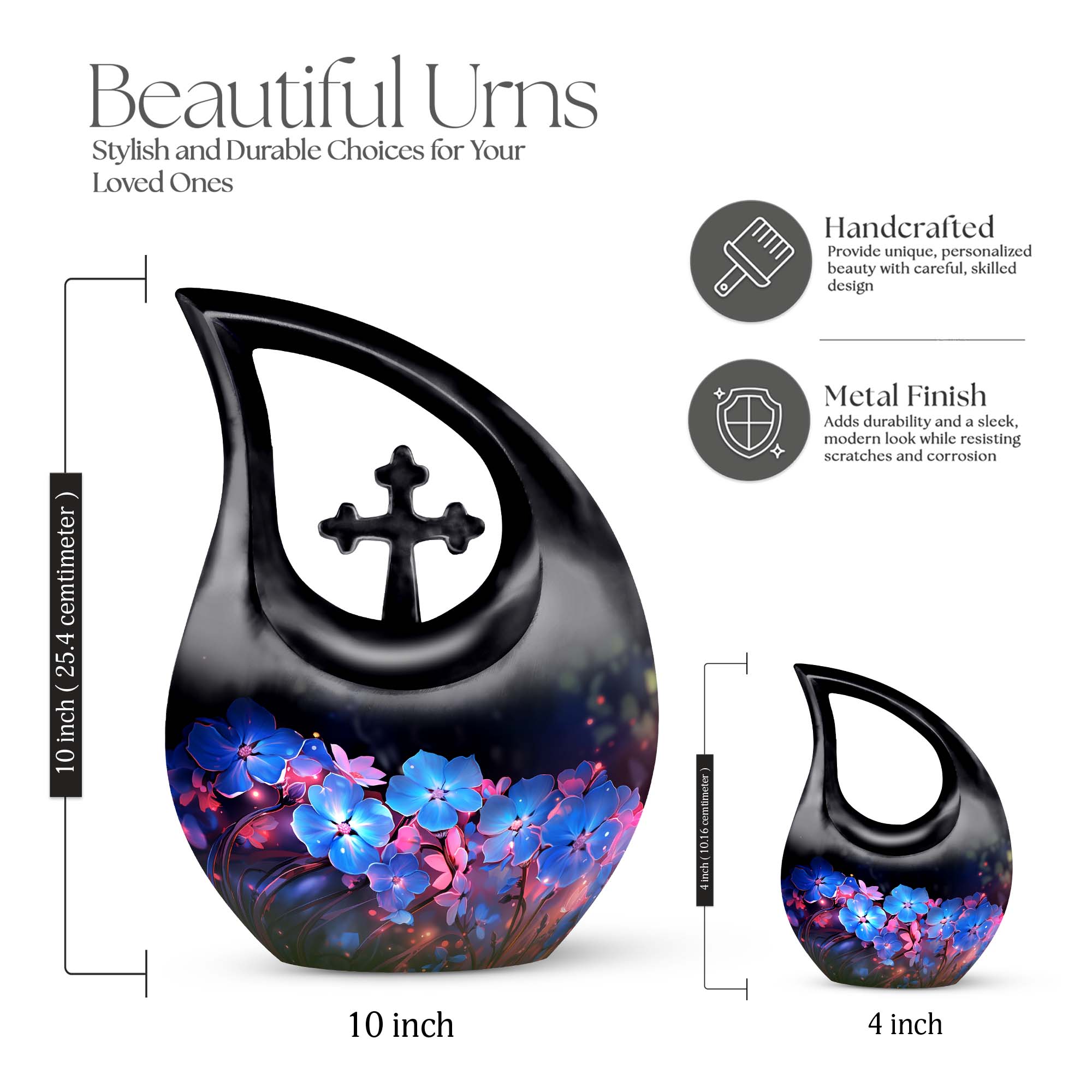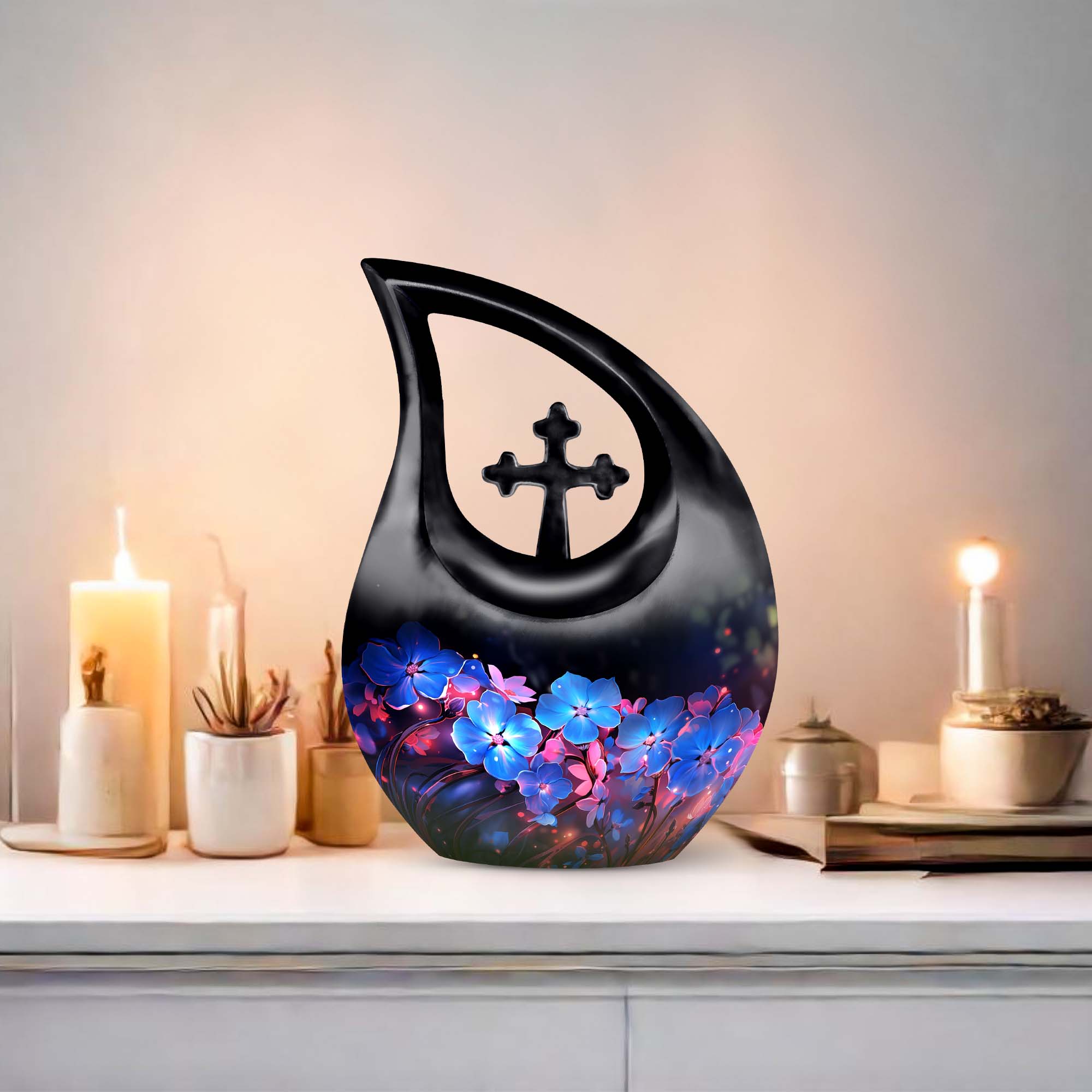 Crafted from durable aluminum, this blue flowers memorial urn for ashes combines artistry and strength, designed to last for generations. The hand-painted floral details and smooth polished surface make it one of the most meaningful large urns for female & male memorials. Perfect as a cremation urn adult male or urn adult female ashes, its timeless design suits any home, chapel, or memorial setting with quiet elegance.