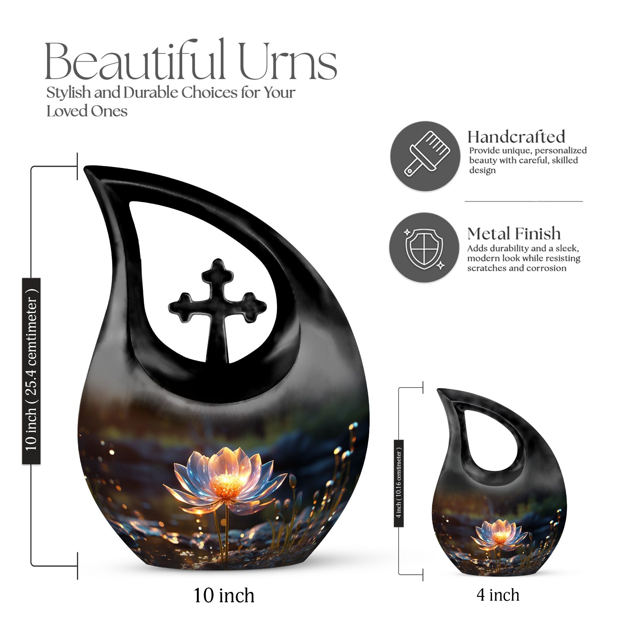 Expertly handcrafted from high-quality aluminum, this cremation urn large is both durable and visually stunning. Its deep black finish contrasts beautifully with the intricately engraved lotus flower, a timeless emblem of eternal life. The sleek shape and refined craftsmanship make it a standout piece among large cremation urns for human ashes. Suitable for display at home or in a memorial setting, this large cremation urn ensures your loved one’s ashes are kept safe while radiating serenity and beauty.