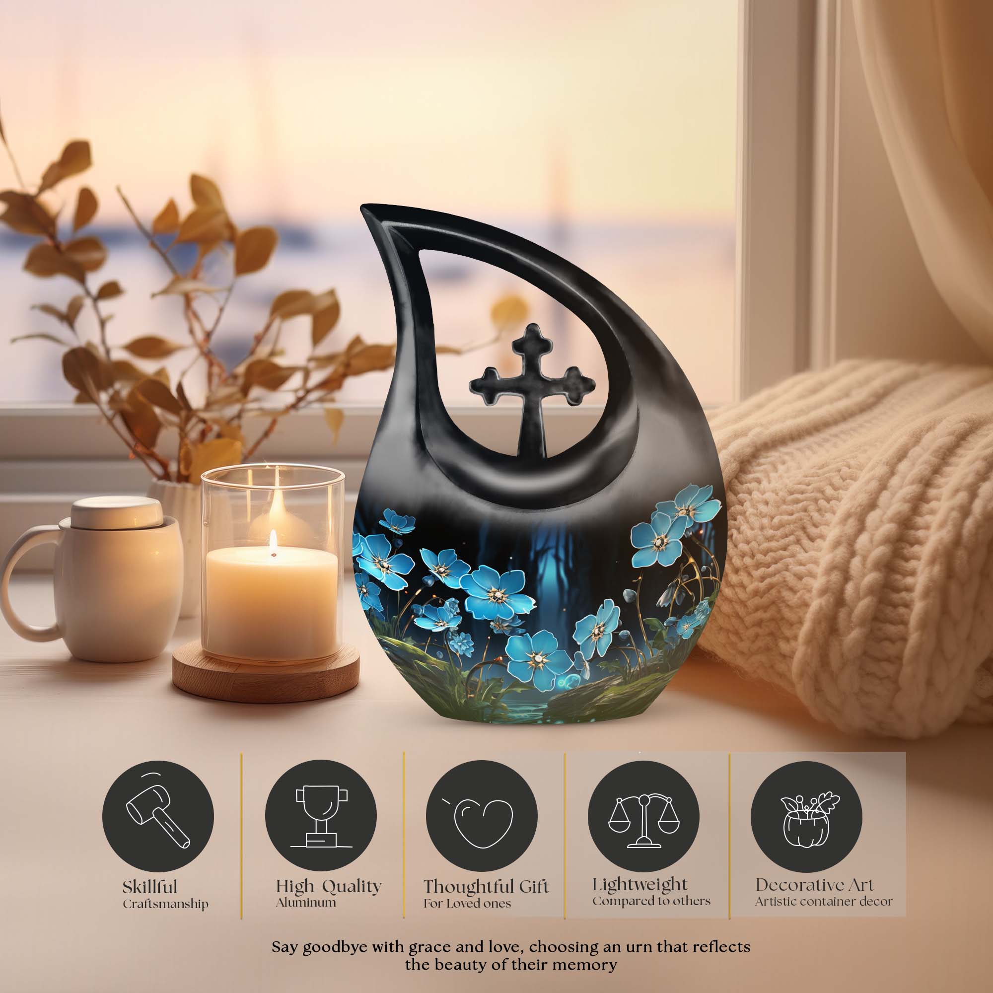 Meticulously handcrafted from high-quality aluminum, this urn showcases a delicate blue floral pattern that radiates calm and serenity. Designed with precision and care, it is perfect as a small urn for ashes for women or a durable cremation urn for men. The craftsmanship reflects timeless artistry—ensuring that each urn stands as a lasting memorial. Ideal as a keepsake urn for women or adult urn for human ashes men, it offers both beauty and strength for long-term preservation.