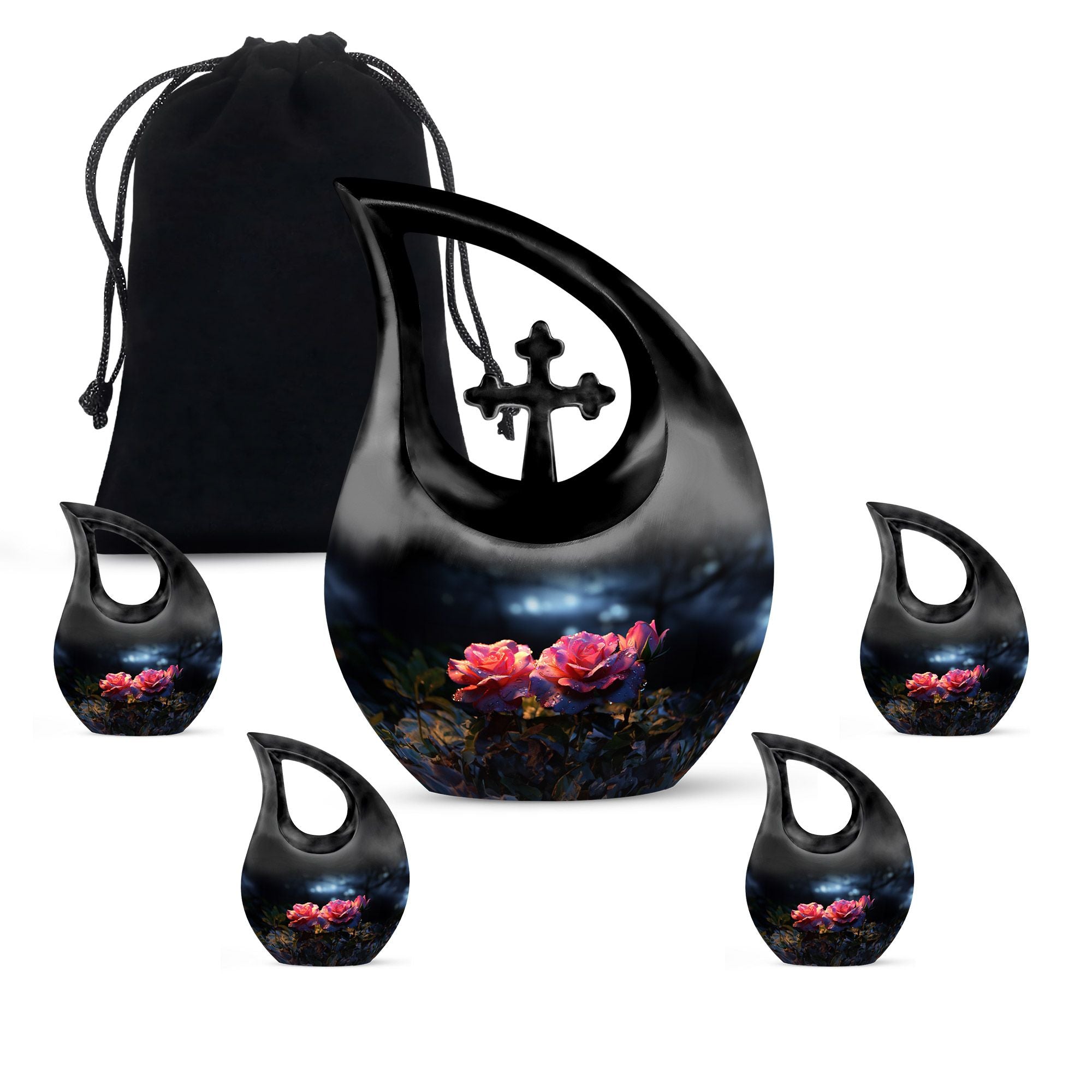 Celebrate a life filled with faith and love with our Black Cremation Urn for Human Ashes featuring a dual rose and cross design. This elegant piece serves as a timeless tribute for both men and women, symbolizing devotion, beauty, and eternal rest. Whether chosen as a cremation urn women cherish or as a burial urn men find dignified, it offers a heartfelt way to preserve precious memories.