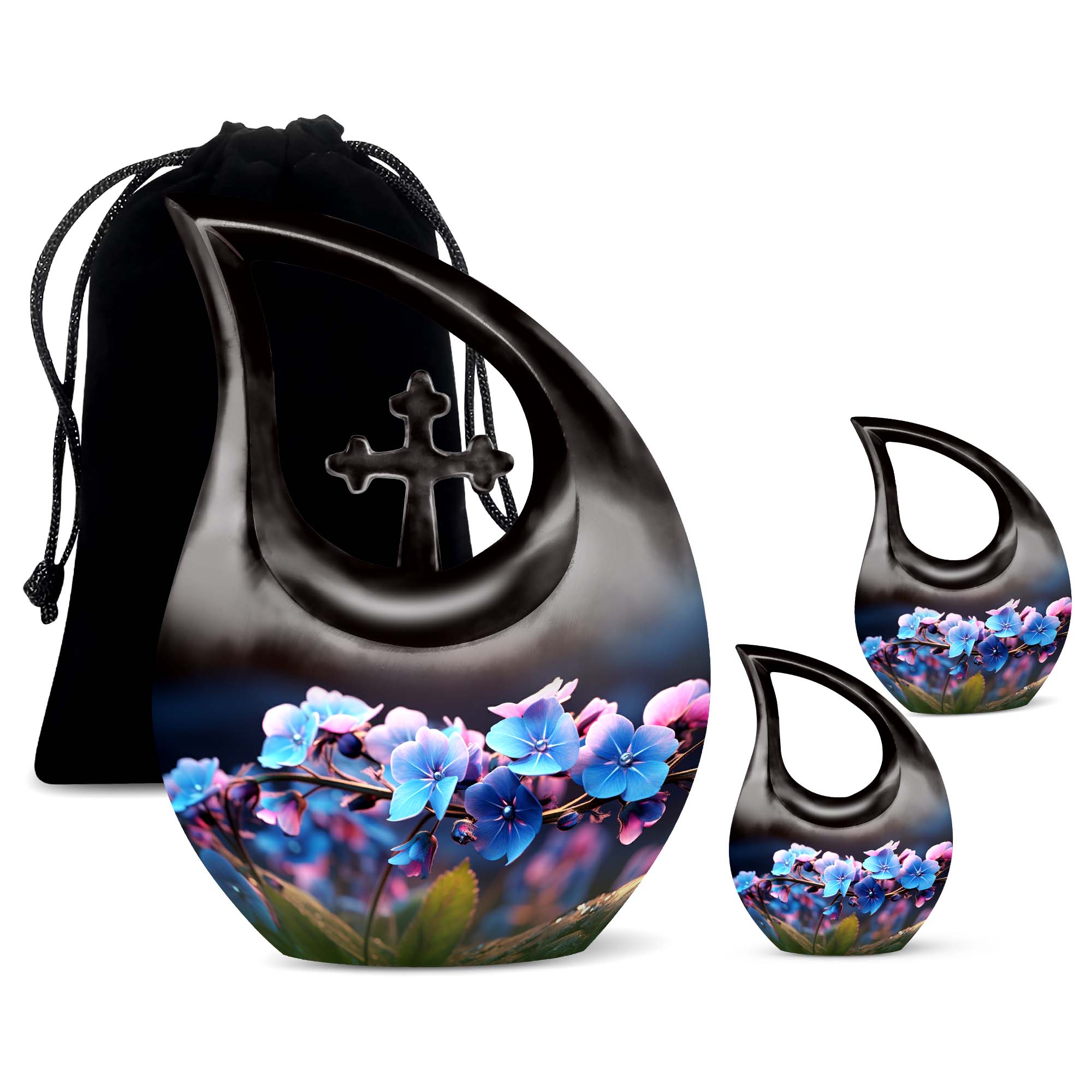 Expertly handcrafted from durable aluminum, this urn combines exquisite design with strength. Its glossy blue finish with hand-painted flowers makes it one of the most stunning cremation urns for human ashes adult male and urns cremation ashes female choices for display or burial. The urn is available in both large and small keepsake sizes, allowing families to share memories in unity.