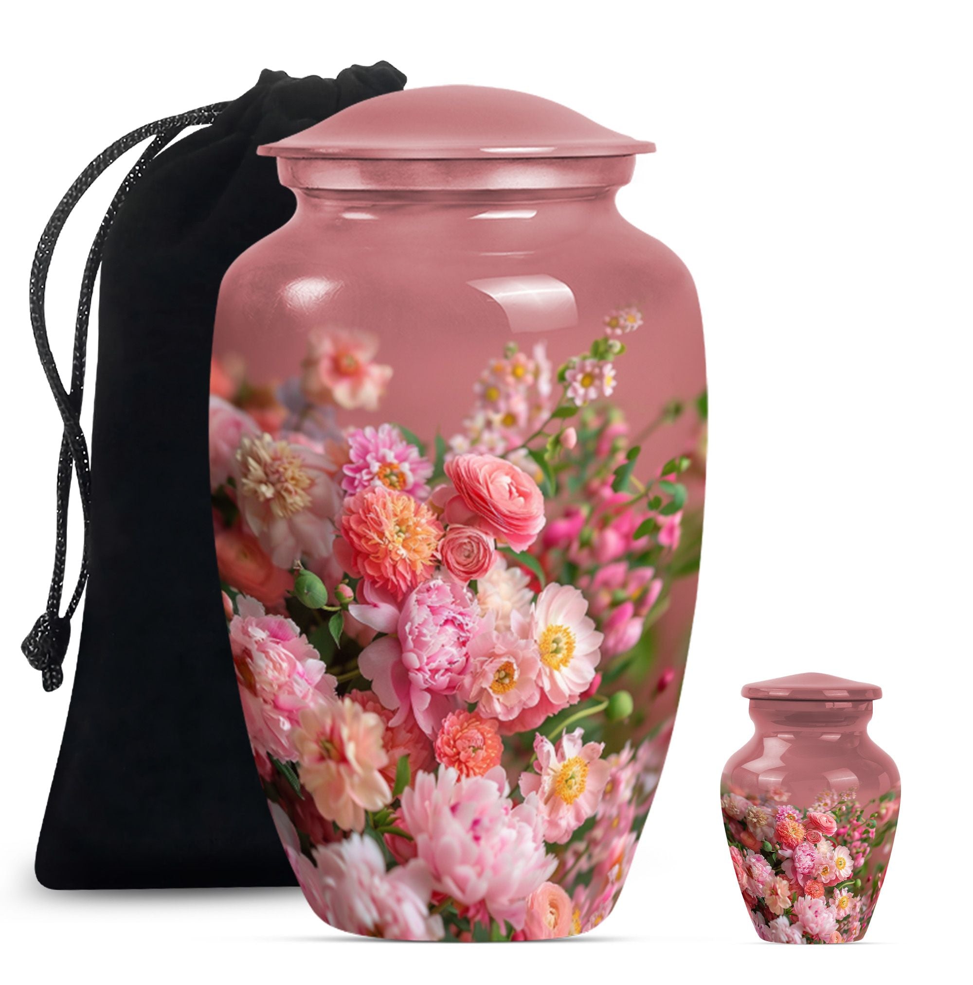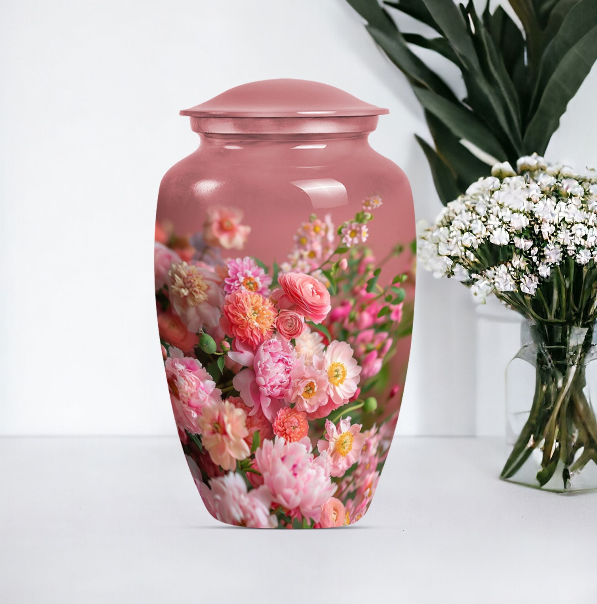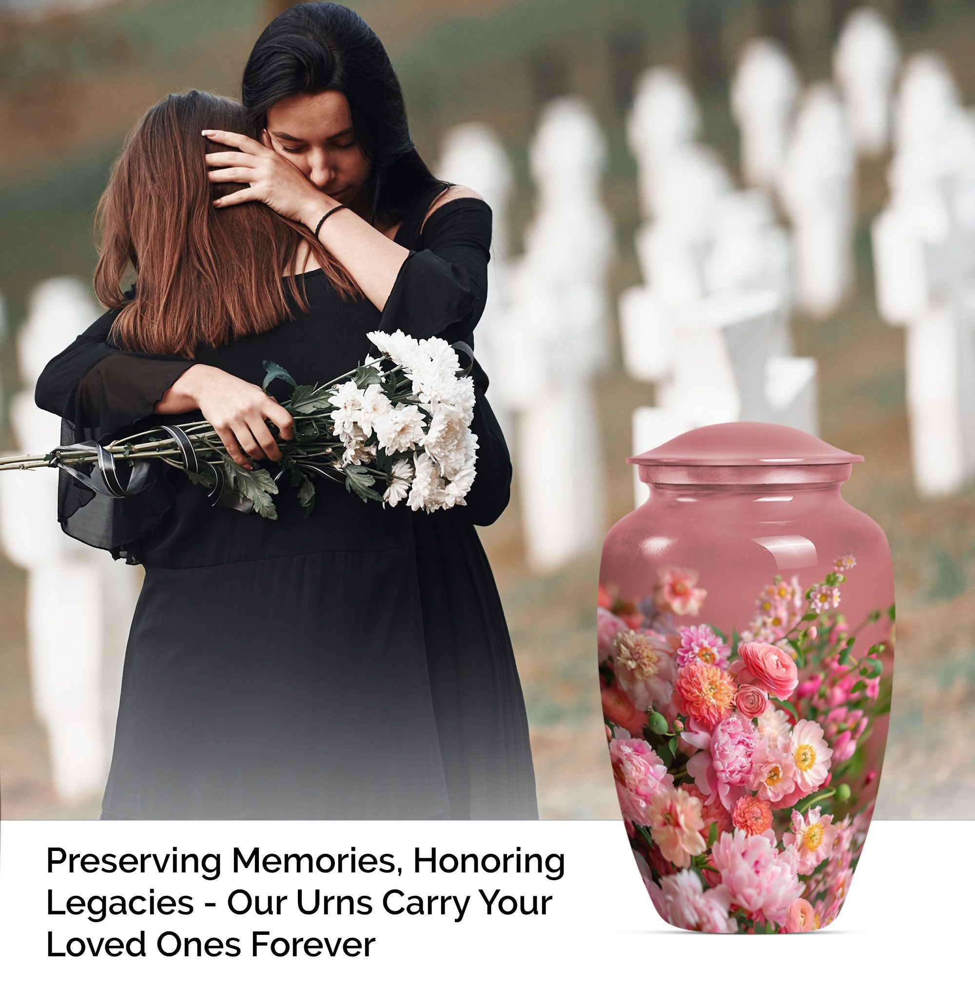 With respect for your cherished memories, we present this majestic and thoughtfully designed cremation urn for ashes. Perfect for an adult's remains, this 10-inch, 'Purple Meadow' themed large urn, complemented with a classic aluminum construction, offers a dignified memory of your loved one. A handcrafted object of finesse, this urn weighs only 3.3 pounds and possesses an impressive capacity of 200 cubic inches. Our flower urn allows you to keep your beloved close even after their final journey and ensures their spirit pervades in your surroundings always. We've also included a plush velvet pouch for careful containment of ashes, providing a gentle touch of class. In addition to the urn's striking elegance, it affords a chance of personalization. Embroider your loved one's name and create an enduring homage to their life. Whether looking for human ash adult urns or burial urns for cremation ashes, our offering encapsulates a sanctity that transcends mundane realities.