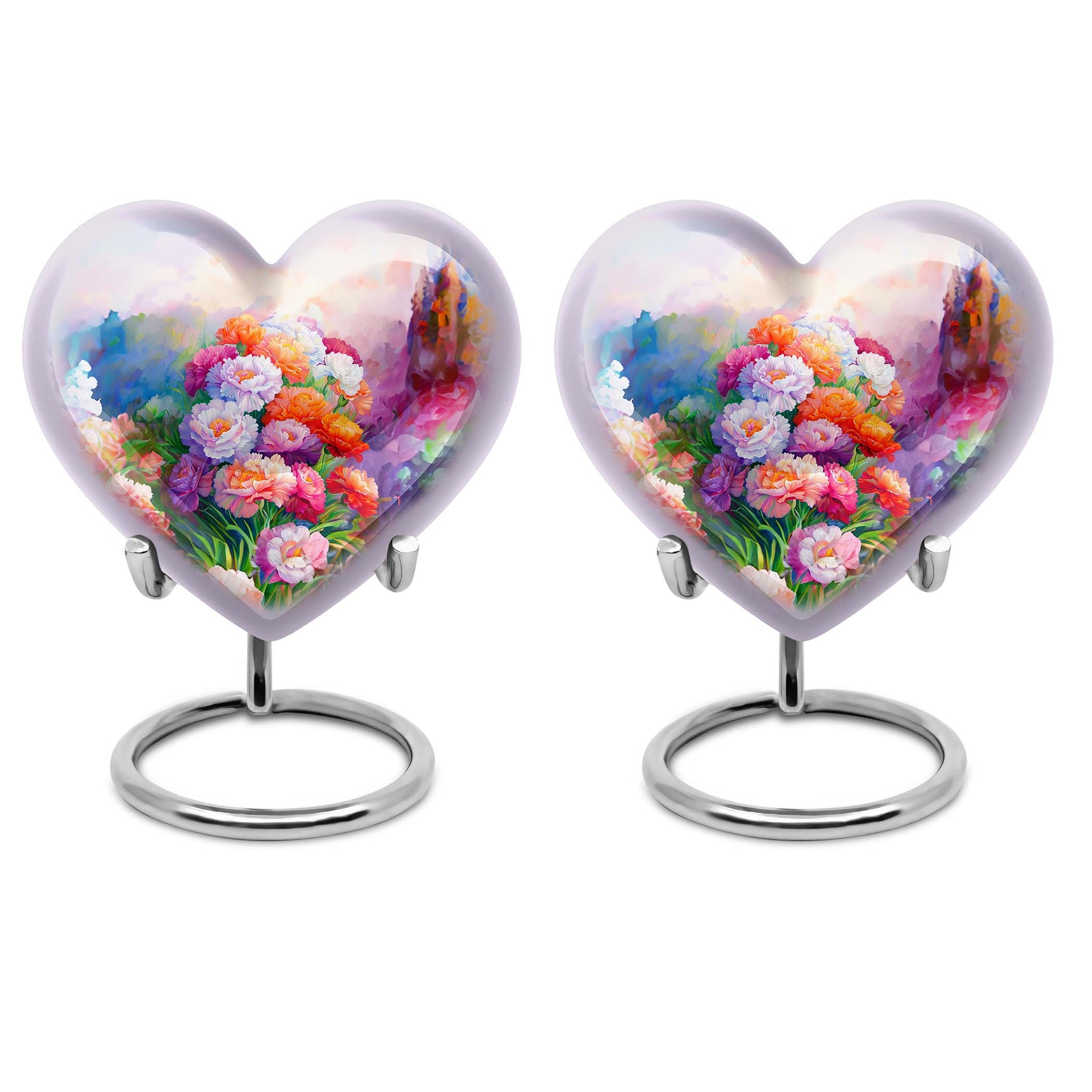Discover a beautiful and heartfelt way to commemorate your beloved with our 'Purple Meadow Heart Urn'. Fashioned from high-grade aluminum, this flower urn boasts a solid weight of 3.3 pounds and proportions of 10 inches in height. This grand piece falls into the category of large urns, equipped with the capacity to hold up to 200 cubic inches of ashes. Astoundingly detailed, our funeral urn is a sublime tribute to your loved one, themed with a tranquil purple meadow design. Each cremation urn comes complete with a velvet pouch for secure containment of your precious keepsake. Our customization feature allows for the personal touch of engraved names, creating a unique memorial adult urn. Notably excluding the design aspect from this description, we hold a high value placed on originality and uniqueness, transcending the commonplace urns for human ashes and redefining custom cremation urns in our tribute to the circle of life.