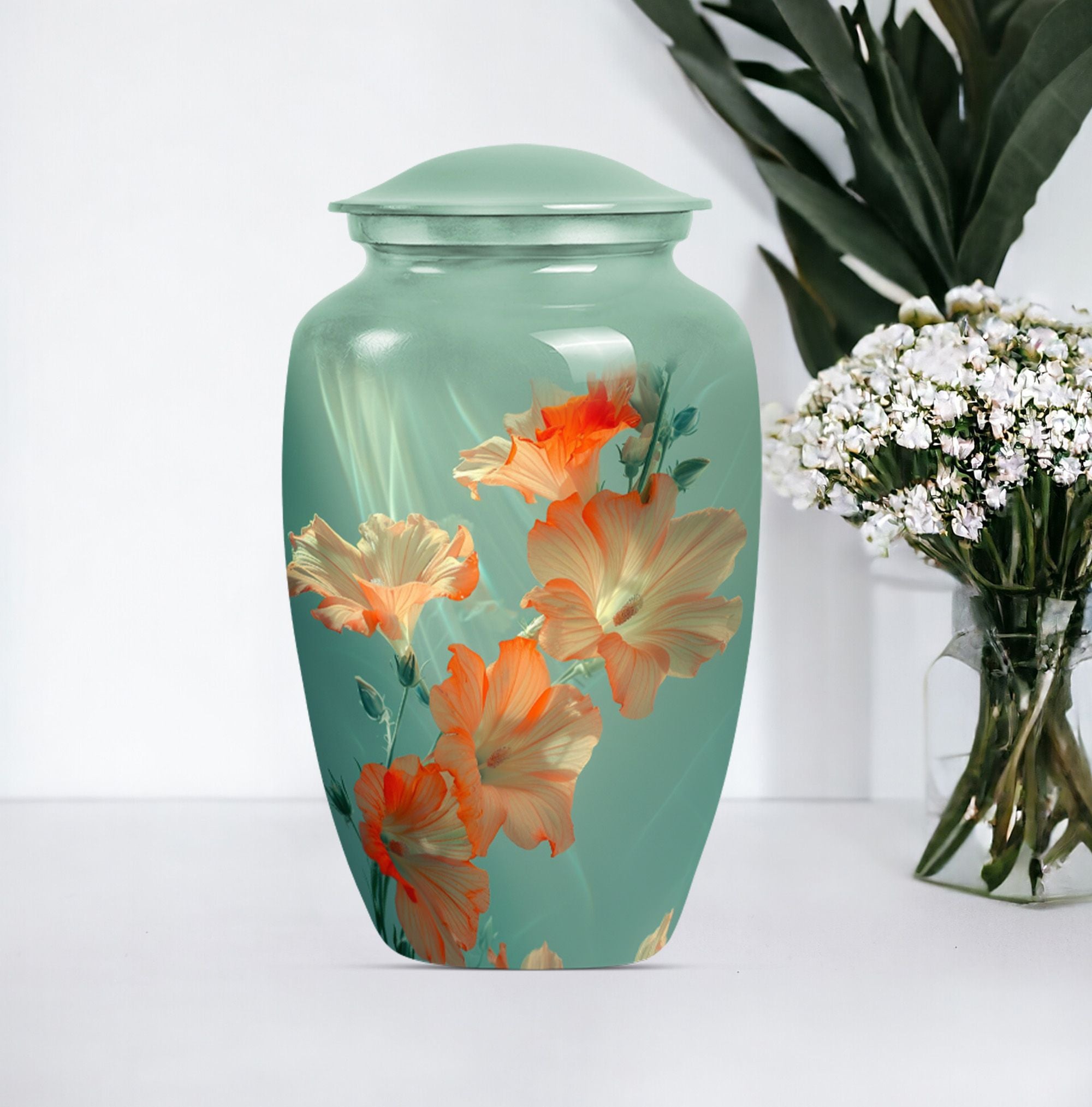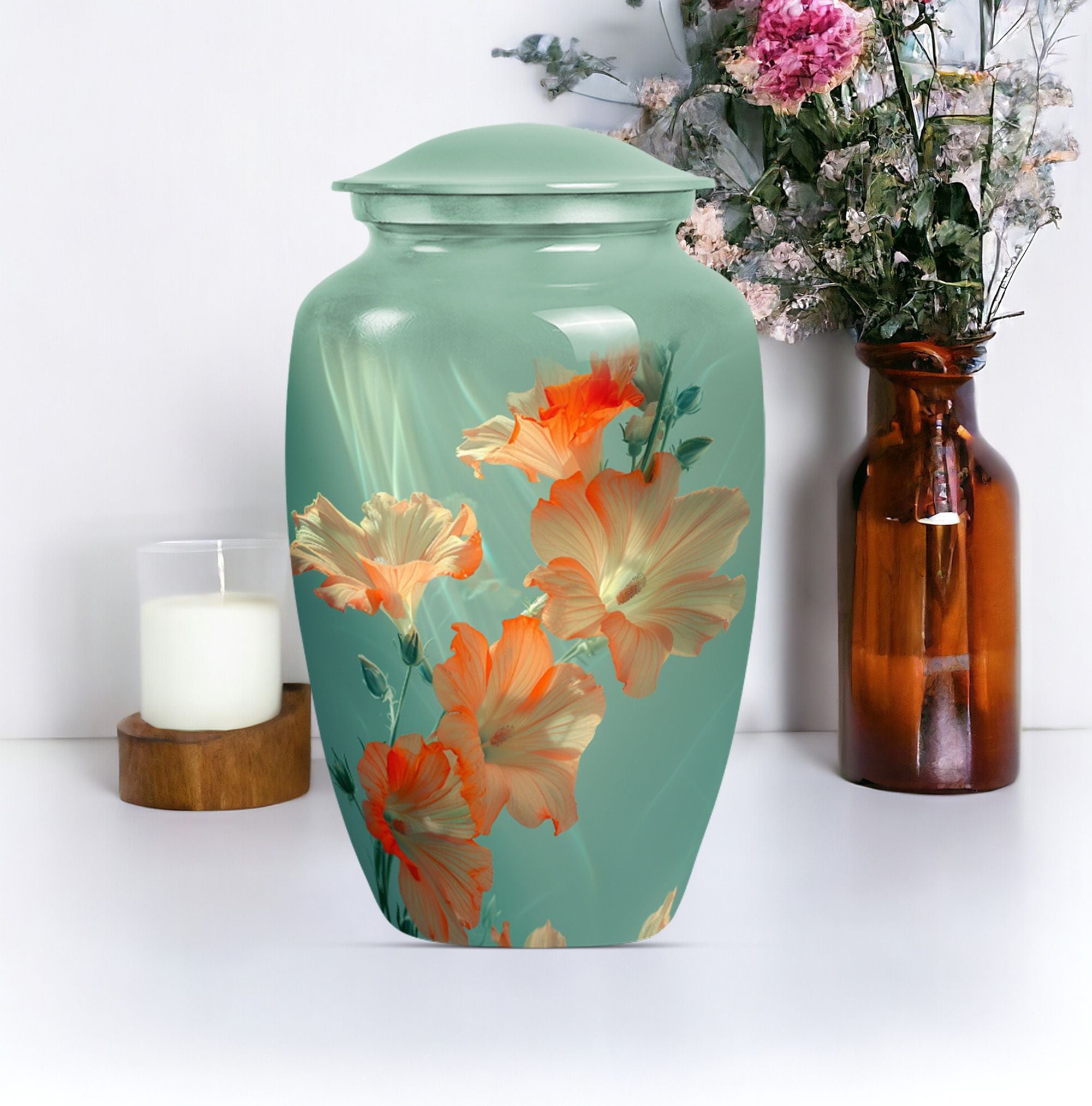 Cherish your loved one's memory with our Purple Meadow Large Urn, a radiant tribute to honor and remember. Skillfully crafted from superior aluminium material, this 3.3 pounds urn stands proudly at a height of 10 inches, and can securely hold up to 200 cubic inches of ashes, making it an ideal memorial adult urn for human ashes for women or men. The stunning Purple Meadow theme encapsulates a vibrant symbol of an everlasting bond, whilst its size and weight ensure stability and profundity. Our package also includes a soft, velvet pouch, ideal for safeguarding precious contents. Add a personal touch to this timeless piece by engraving names for an intimate reminder. Our flower Urn is more than a keepsake; it's a heartfelt way to keep your dearly departed close. Ditch the ubiquity of Classic urn designs; instead, opt for our unique, large urns that are as distinct as the soul they hold. Perfect for those searching for cremation urns for women or funeral large urns for human ashes adult male, and extends to a broad assortment of adult urns for cremation ashes.