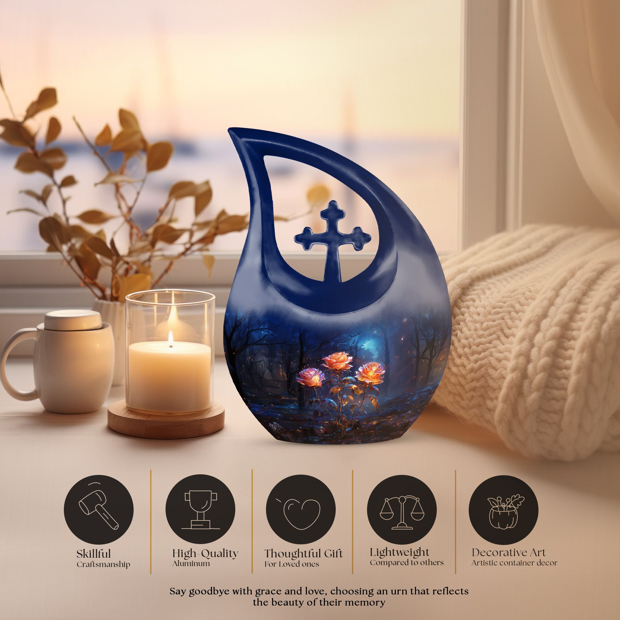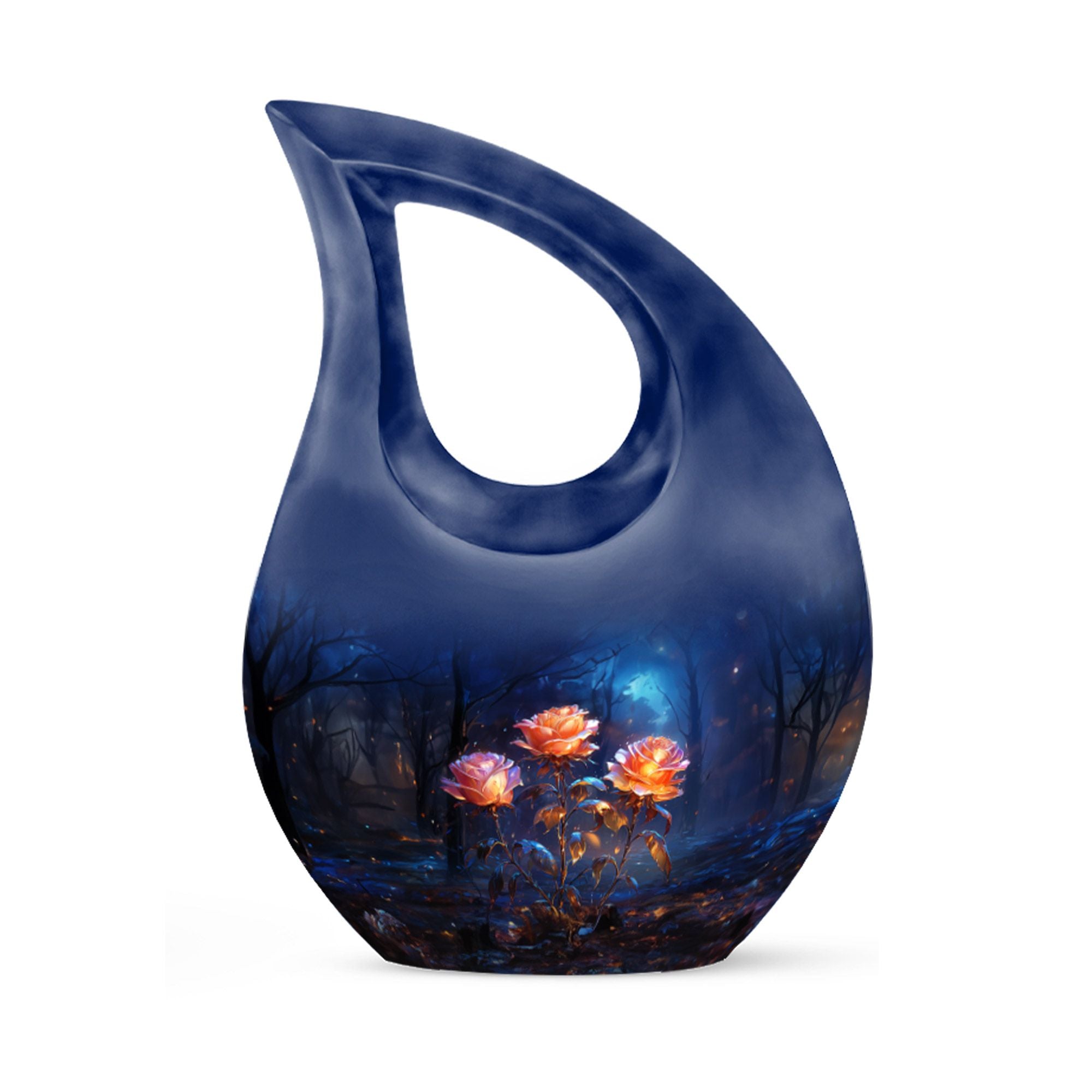 Expertly handcrafted from premium aluminum, this large cremation urn features a rich dark blue teardrop shape adorned with radiant glowing roses — a design that signifies eternal love and remembrance. Whether you’re honoring an urn large adult male or selecting a large urn for adult ashes, its combination of artistry and durability ensures it remains a lasting keepsake. This piece stands among the most refined adult urns for human ashes large, blending elegance with heartfelt symbolism.