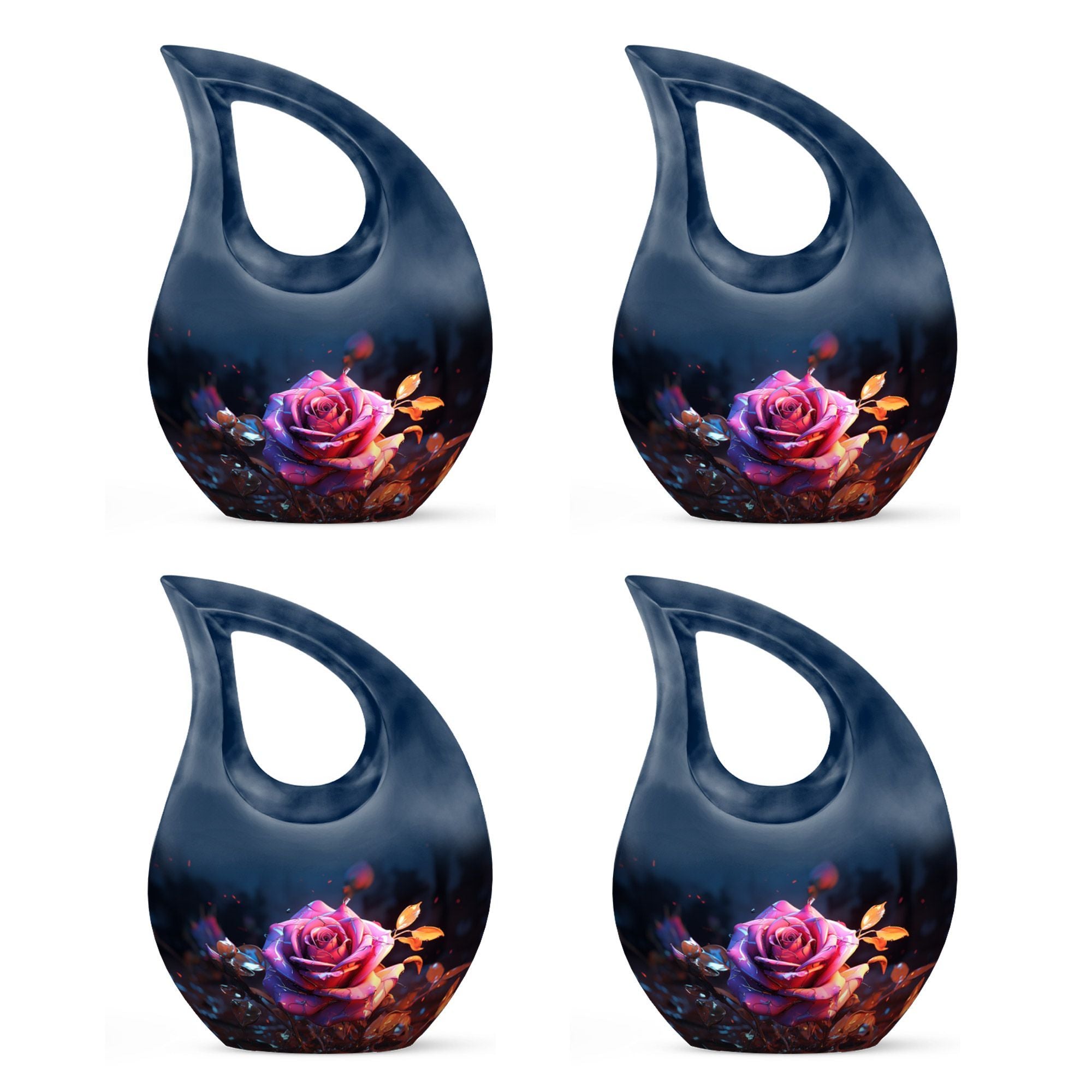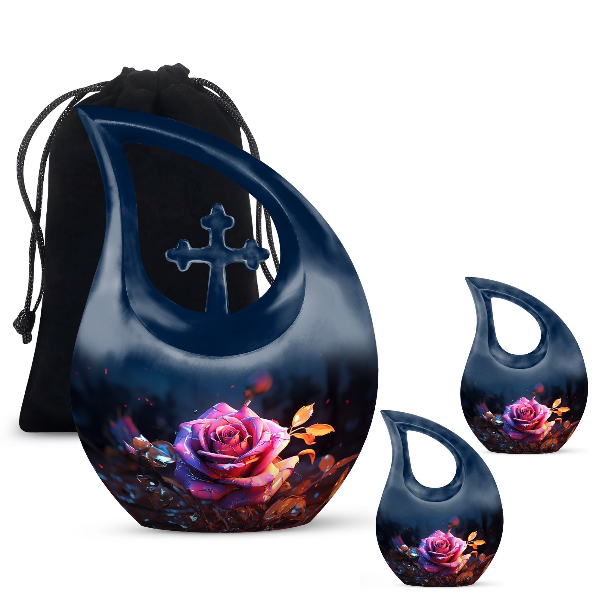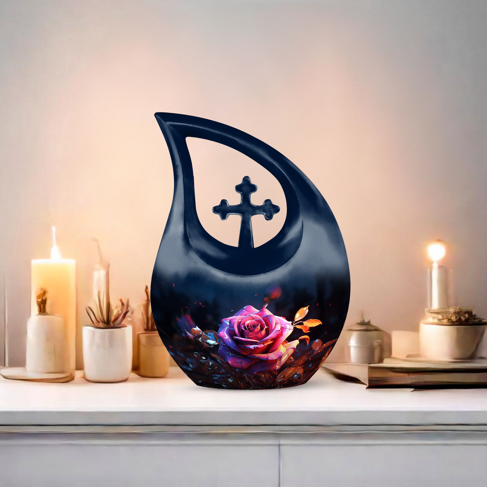 Celebrate the eternal bond of love and faith with our Blue Teardrop Burial Urn for Human Ashes. Designed with a radiant single neon rose and cross motif, this elegant cremation urn for ashes serves as a beautiful tribute to a life cherished and remembered. Its teardrop silhouette represents both sorrow and everlasting love — a touching symbol of remembrance for families seeking comfort and grace.