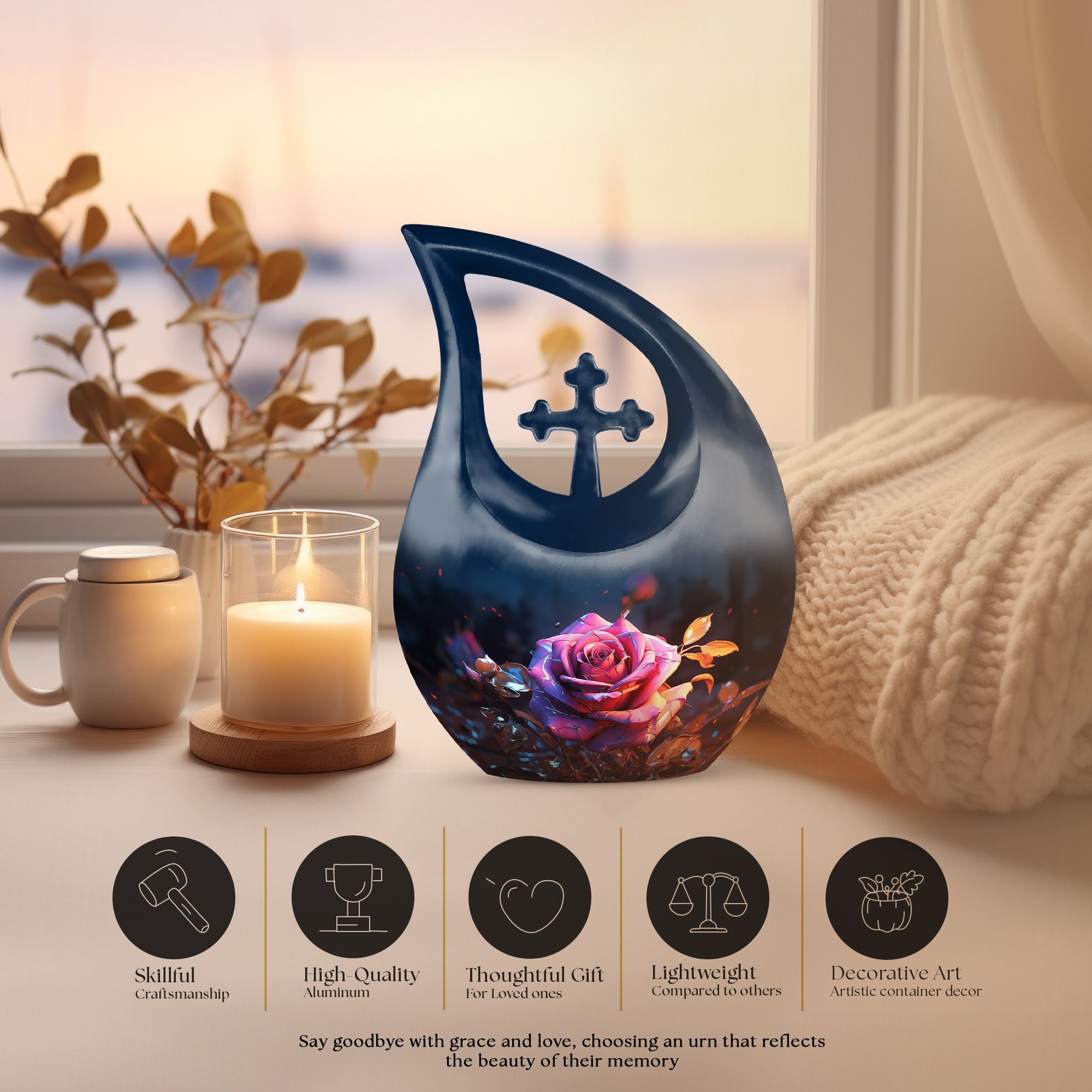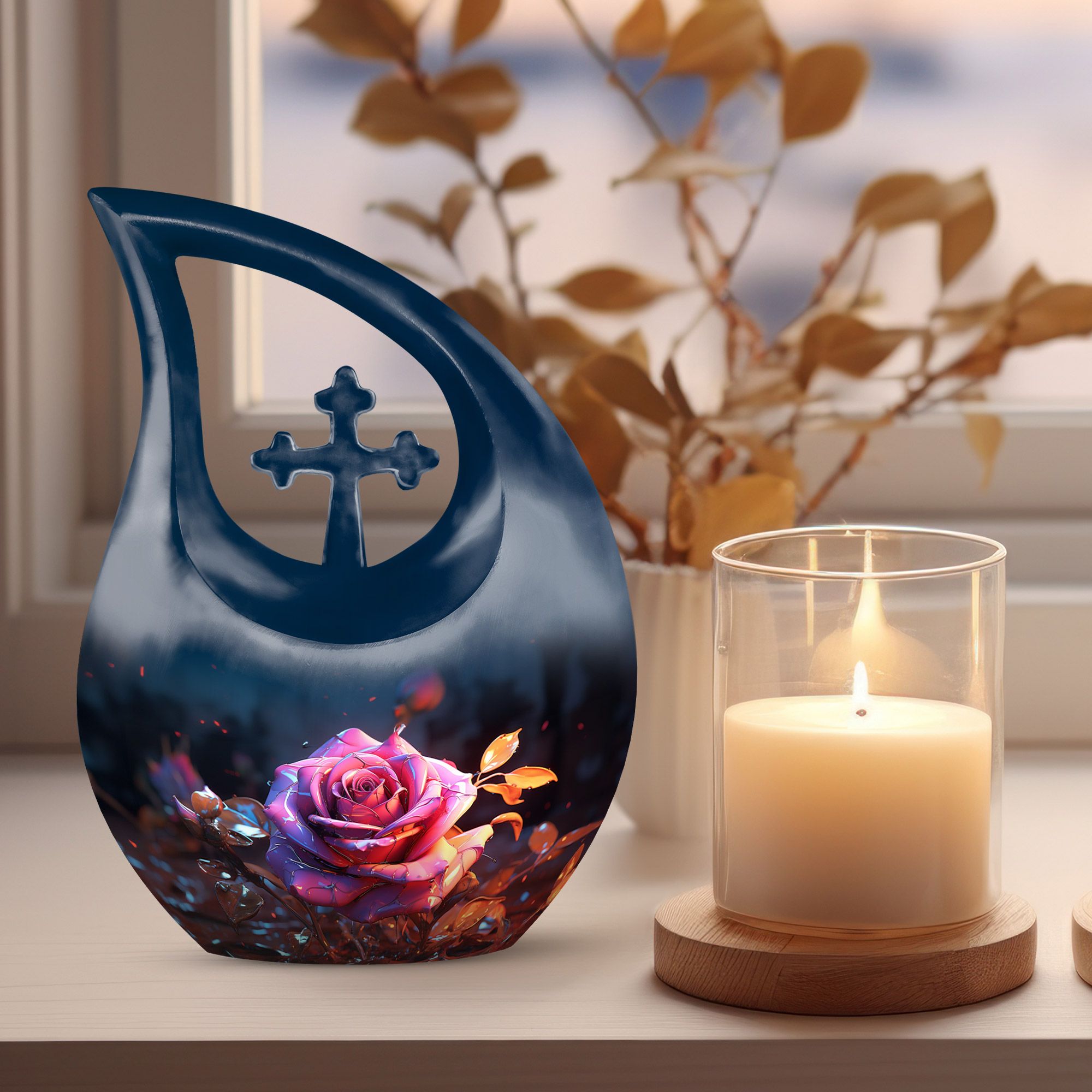 Expertly handcrafted from durable aluminum, this urn blends artistic detail with modern elegance. The deep blue finish is complemented by the glowing neon rose and cross engraving, creating a serene and uplifting aesthetic. Suitable as a small cremation urn or part of a cremation keepsakes for ashes collection, it provides a secure and dignified resting place. The threaded screw-top lid ensures the ashes are safely preserved, offering families peace of mind and lasting remembrance.