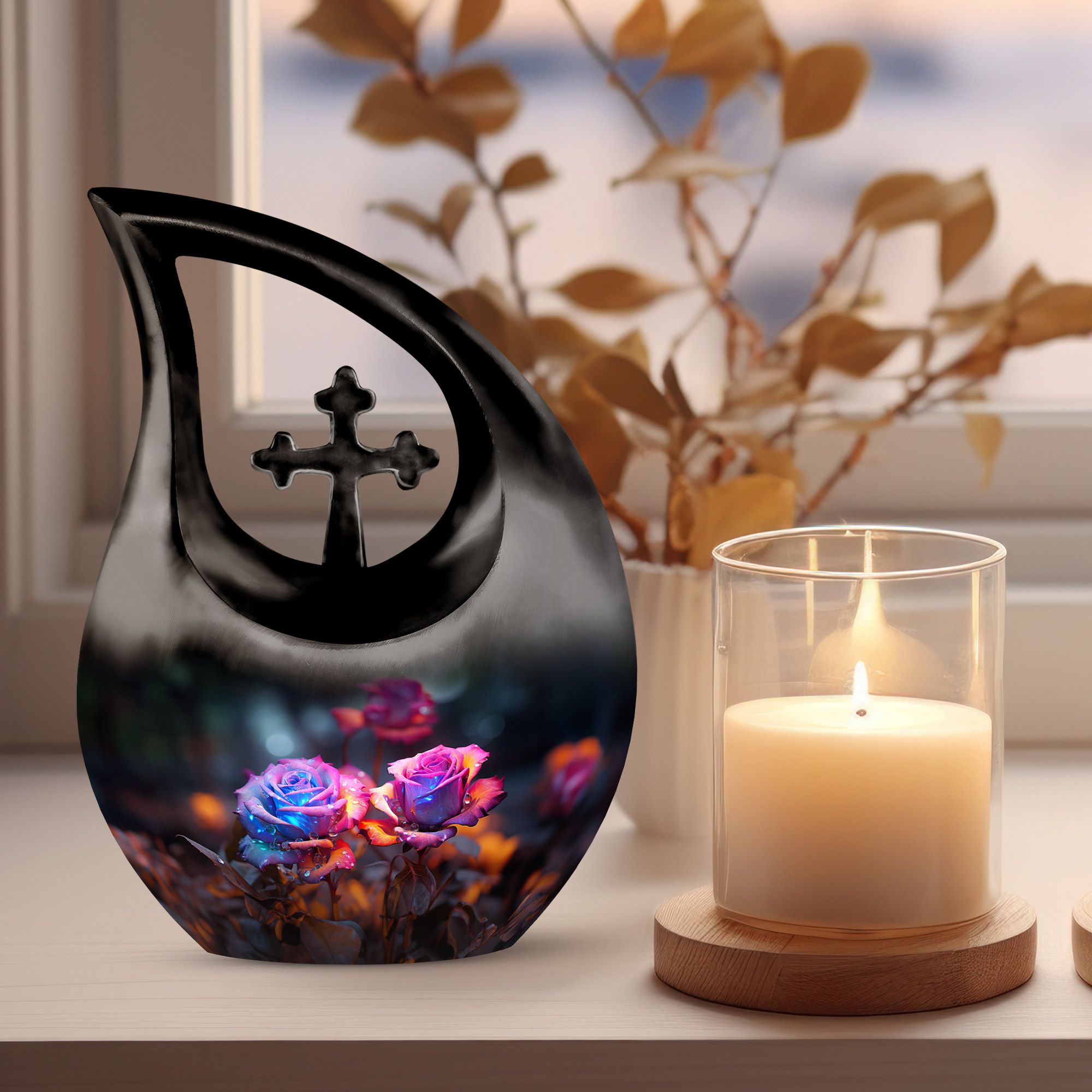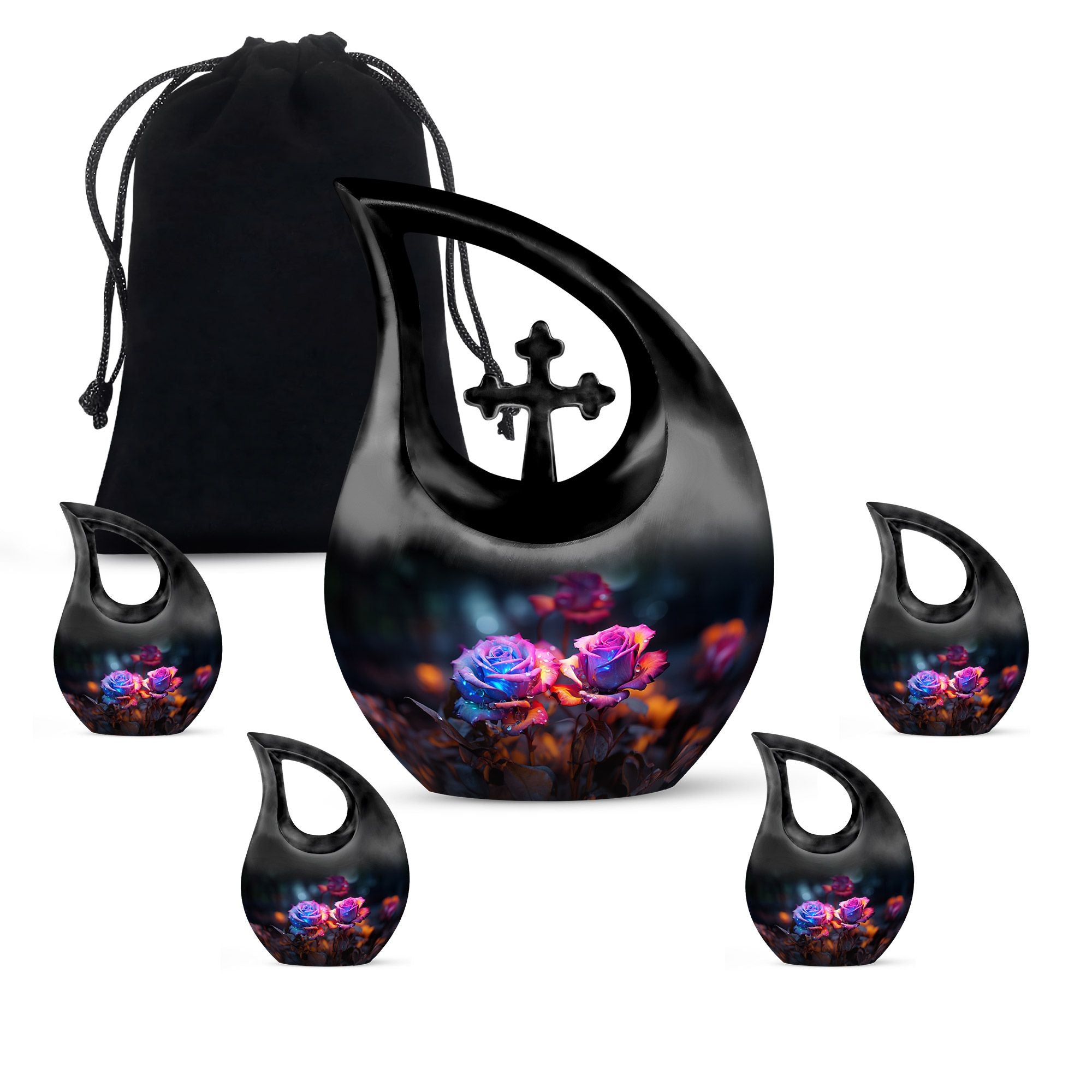 Crafted from high-quality aluminum, this funeral urn combines durability and artistry in one timeless piece. The sleek black finish is adorned with a striking neon pink and blue rose motif — symbolizing beauty, strength, and everlasting connection. Designed for both large and small needs, this urn can be part of cremation urns large & small combo sets or used individually as a funeral urn ashes keepsake. The secure screw-top lid ensures ashes remain safely sealed, providing peace of mind and dignity in remembrance.