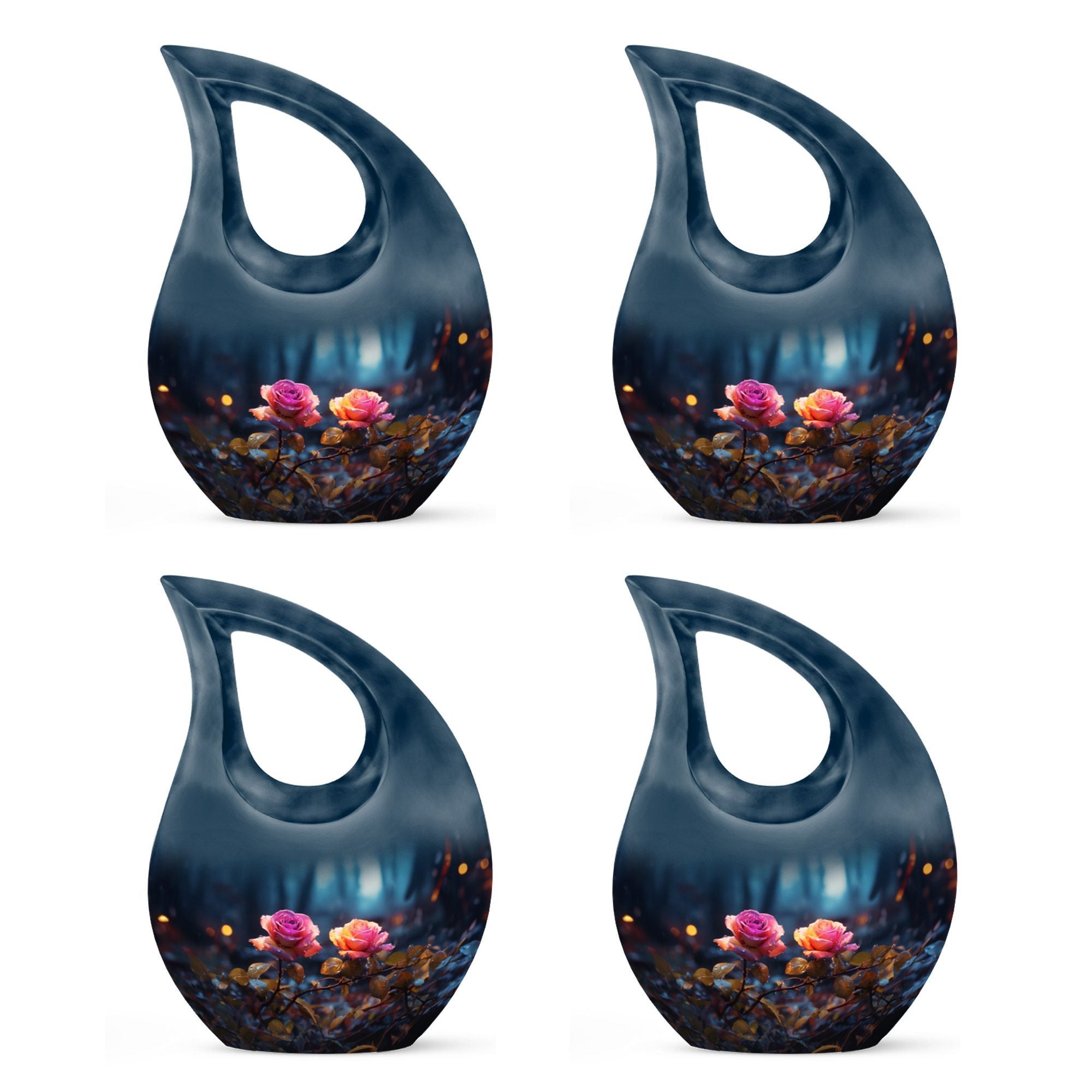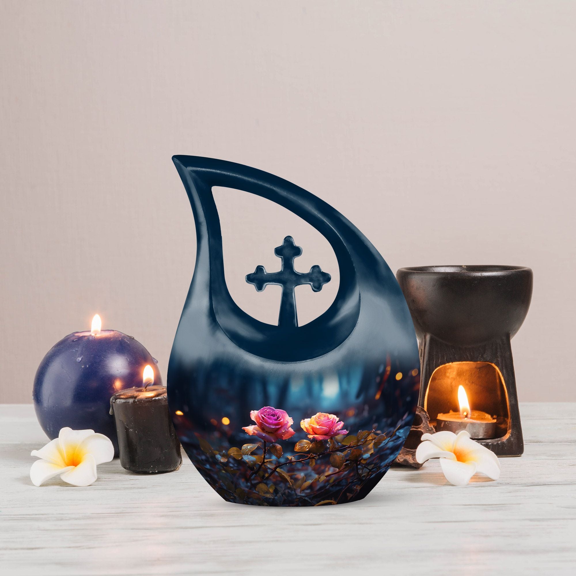 Expertly handcrafted from premium aluminum, this urn showcases a radiant blue finish accented by a delicately engraved dual rose and cross motif — representing purity, eternal rest, and devotion. Its compact yet spacious design makes it ideal for those seeking urns for ashes adult male or small urns for human ashes adult female. The secure screw-top lid ensures ashes remain safely sealed, while the luminous sheen adds beauty and grace to any memorial display or resting place.