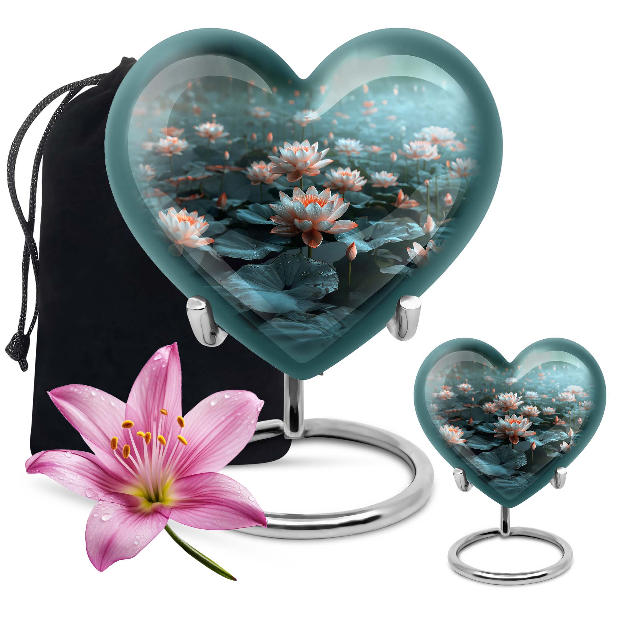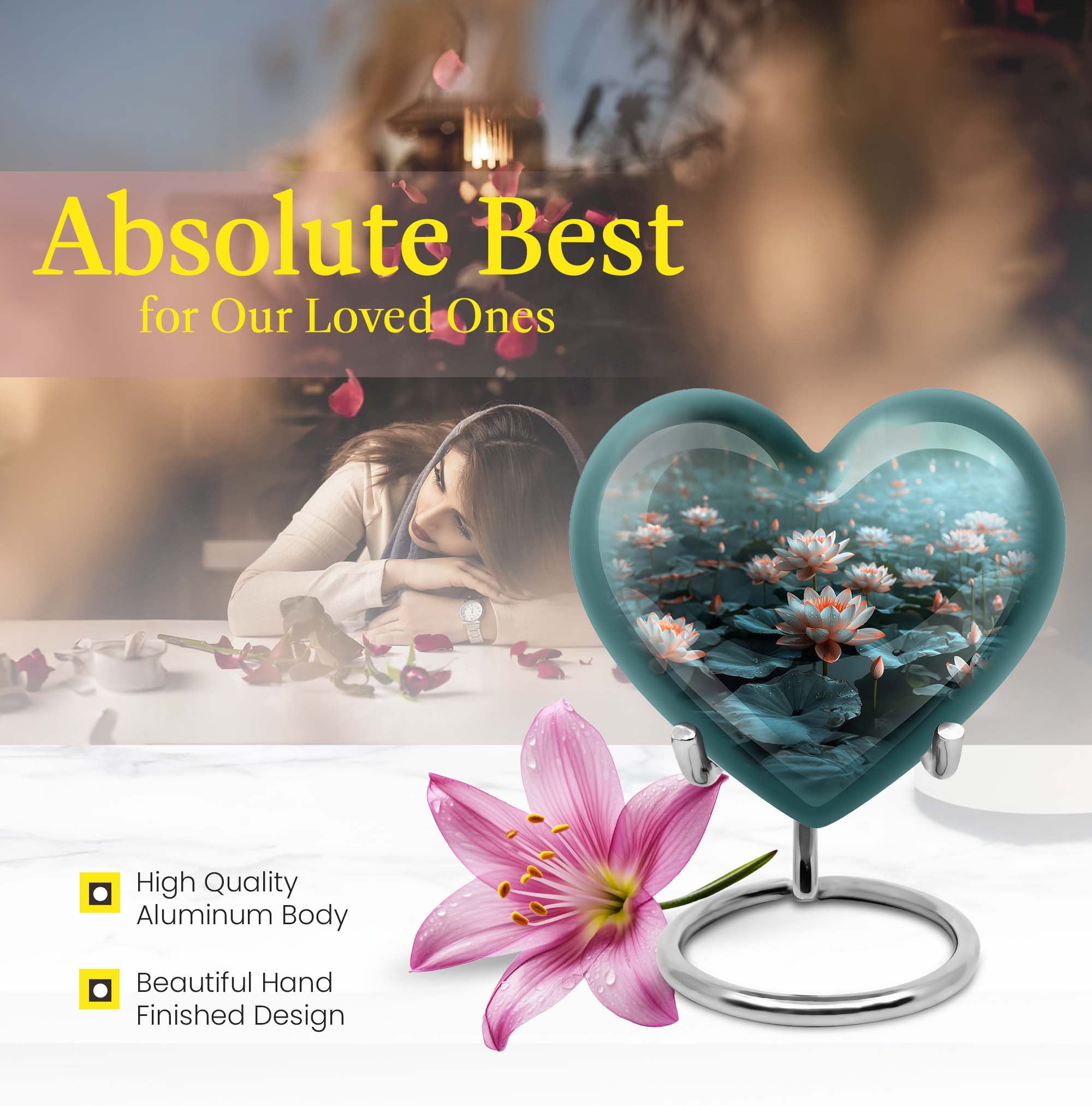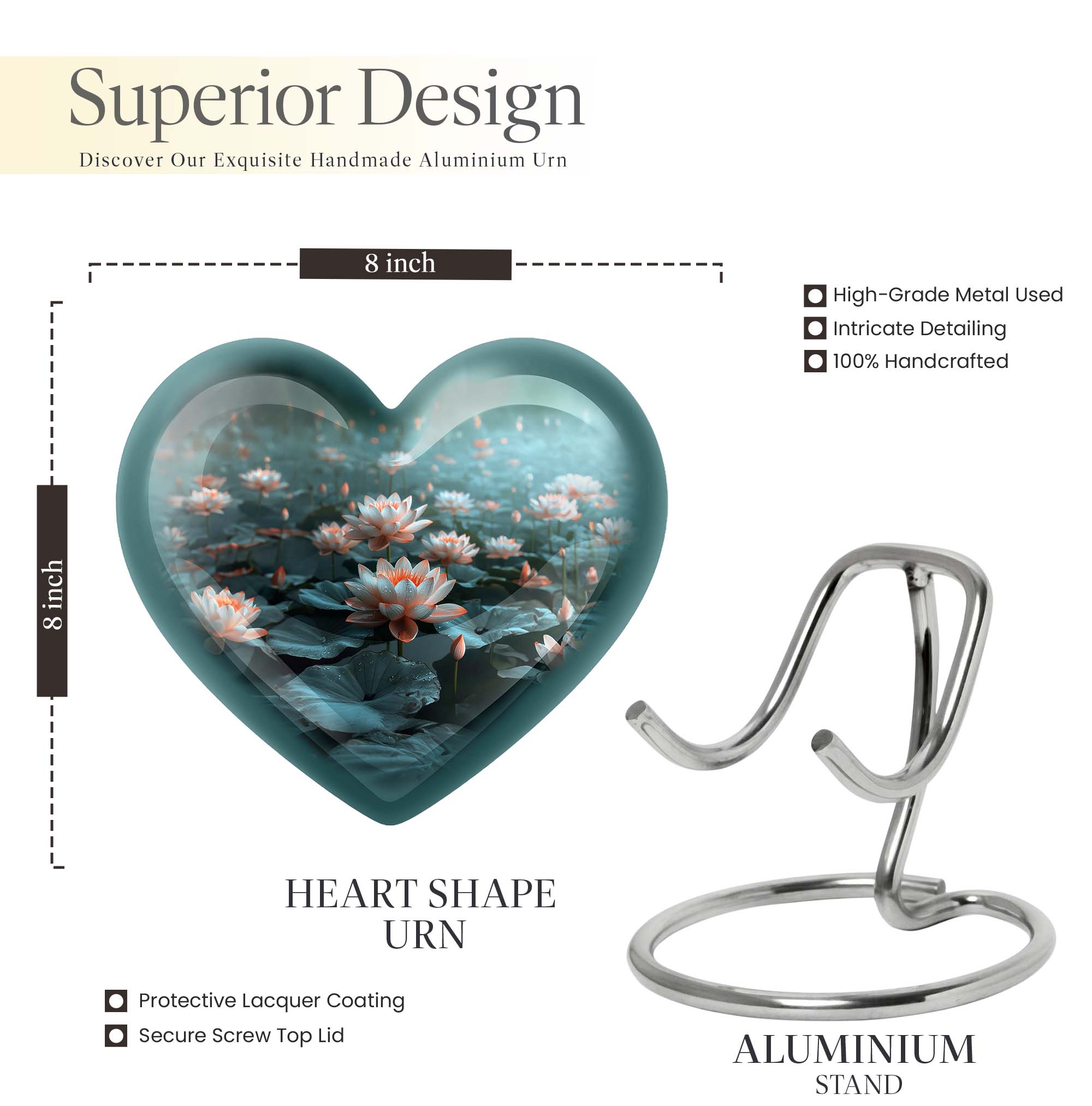 Mesmerizing in it's simplicity and elegance, this large 10-inch Lotus Urn serves as a dignified receptacle for your loved one’s cremation ashes. Tailored from robust aluminium and finished in an abstract theme, this burial urn does not just safeguard the remains, but also serves as a tangible remembrance of the departed. Weighing at a solid 3.3 pounds, it has a substantial capacity of 200 cubic inches, formidable enough to hold adult male ashes. This kind of large urn is ideal for urban homes bringing in a blend of solemnity and style. We offer a personal touch with the option to engrave names, giving it that unique sentimental value. This package comes complete with a velvet pouch, an esteemed and secure containment for the treasured ashes. This memorial urn is more than just a vessel; it is a symbol of love, honouring lives that will forever be missed. Its distinct heart design adds a touch of emotional warmth, making it a fitting tribute for your dearly departed mother. Bring this serene Lotus Urn into your home, and keep their spirit alive.