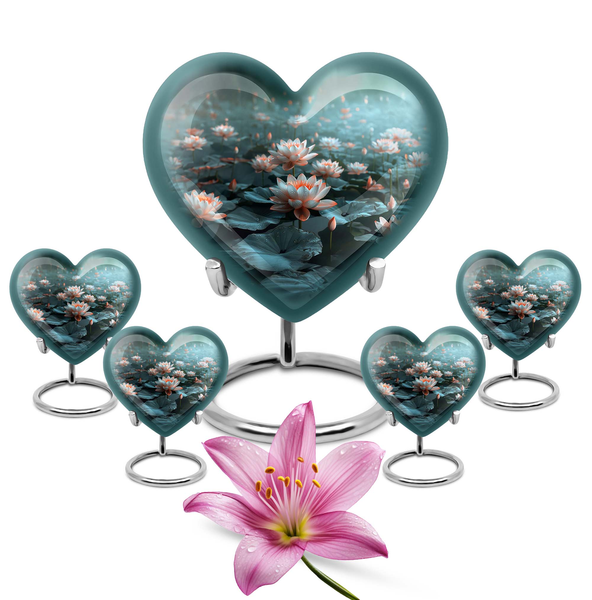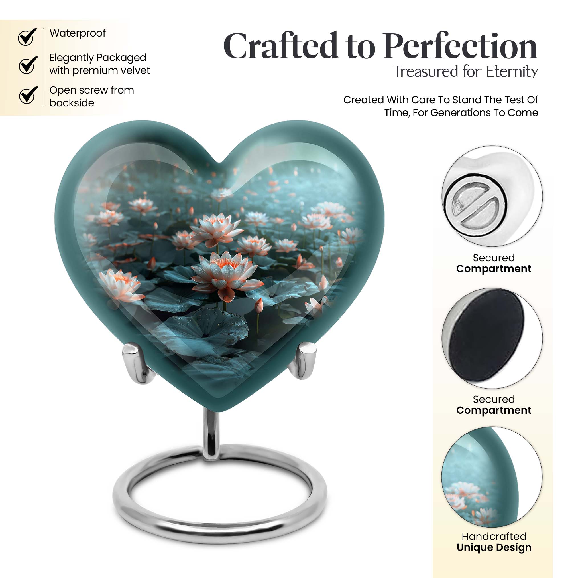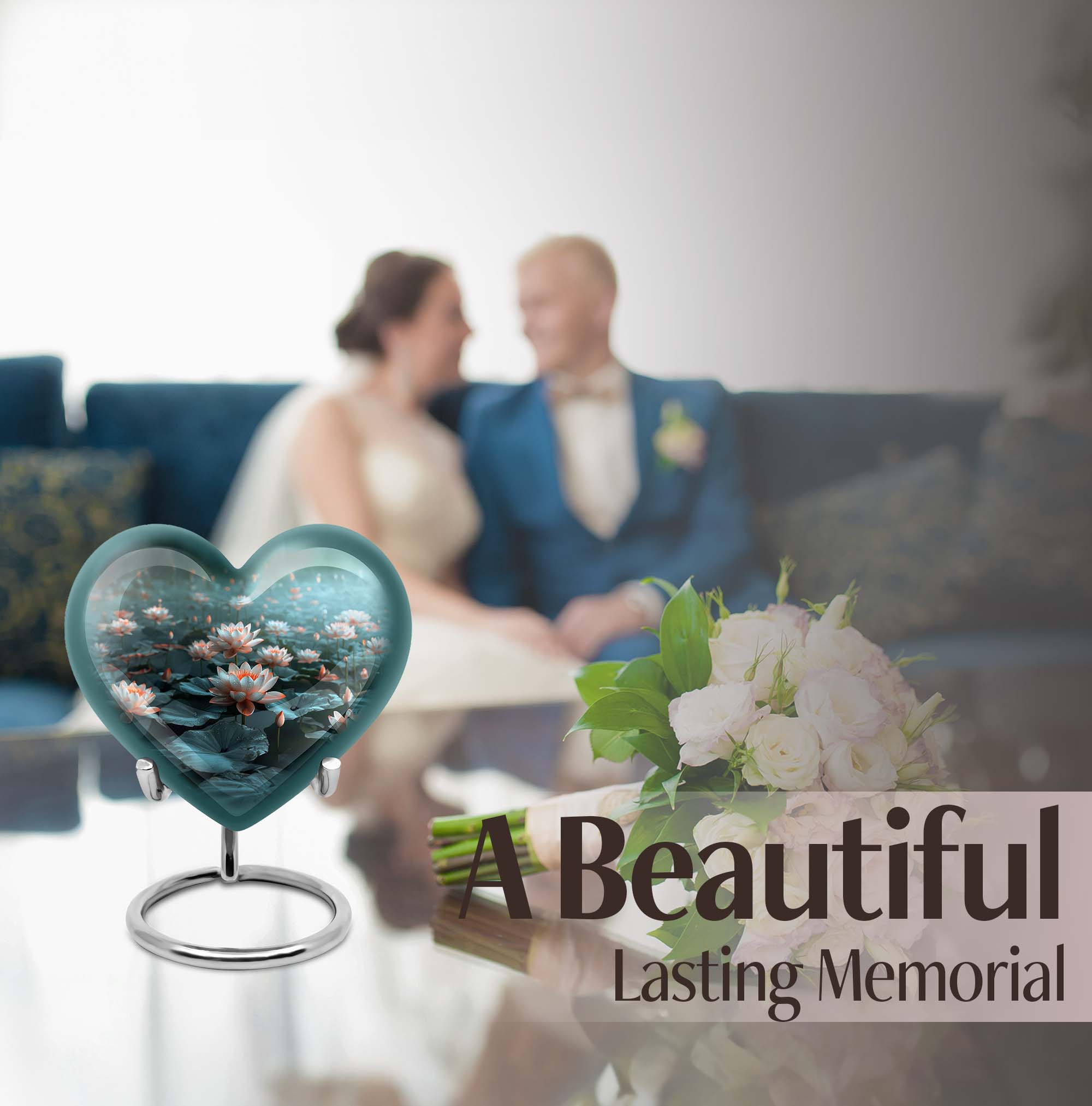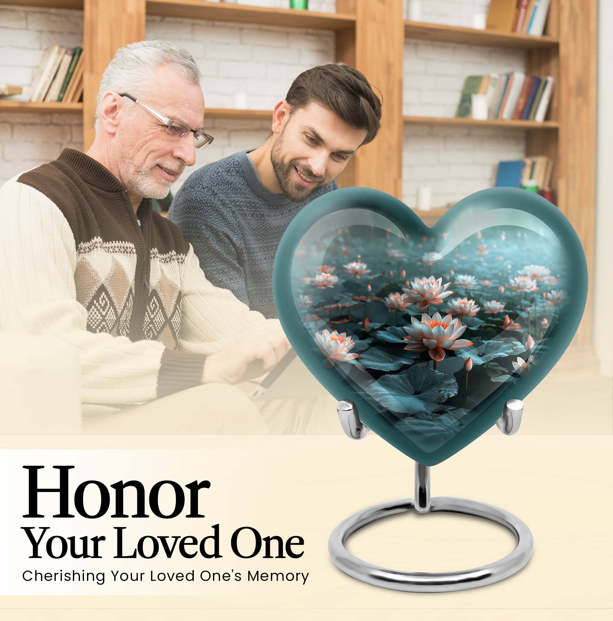 Mesmerizing in it's simplicity and elegance, this large 10-inch Lotus Urn serves as a dignified receptacle for your loved one’s cremation ashes. Tailored from robust aluminium and finished in an abstract theme, this burial urn does not just safeguard the remains, but also serves as a tangible remembrance of the departed. Weighing at a solid 3.3 pounds, it has a substantial capacity of 200 cubic inches, formidable enough to hold adult male ashes. This kind of large urn is ideal for urban homes bringing in a blend of solemnity and style. We offer a personal touch with the option to engrave names, giving it that unique sentimental value. This package comes complete with a velvet pouch, an esteemed and secure containment for the treasured ashes. This memorial urn is more than just a vessel; it is a symbol of love, honouring lives that will forever be missed. Its distinct heart design adds a touch of emotional warmth, making it a fitting tribute for your dearly departed mother. Bring this serene Lotus Urn into your home, and keep their spirit alive.