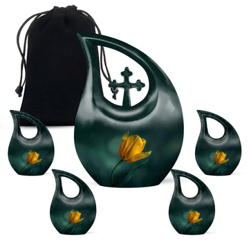 Beautifully handcrafted from premium aluminum, this cremation urn for men and women features a rich dark green background that highlights the delicate yellow tulip design. Its smooth finish and secure screw-top lid ensure your loved one’s ashes remain safely preserved. Ideal as an urn for men & women, it serves as a dignified centerpiece for display, burial, or remembrance.