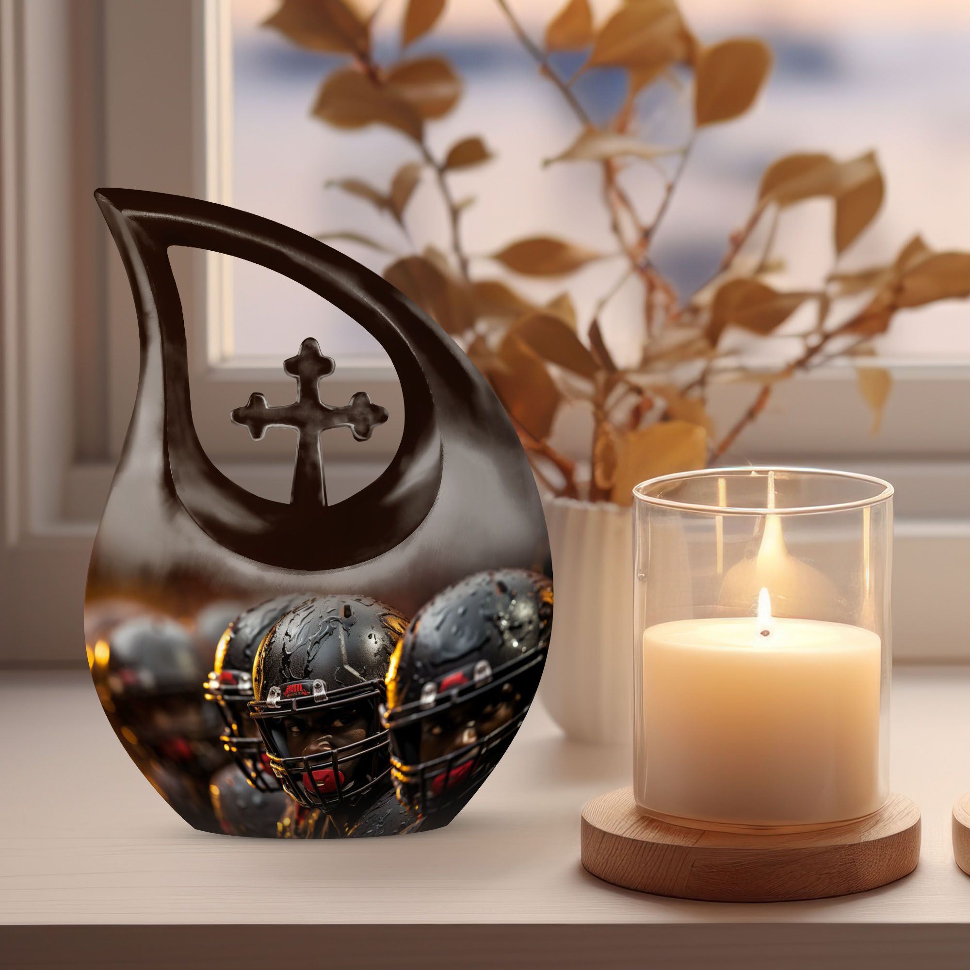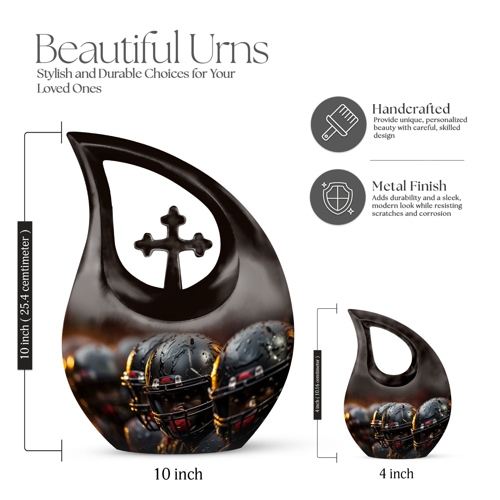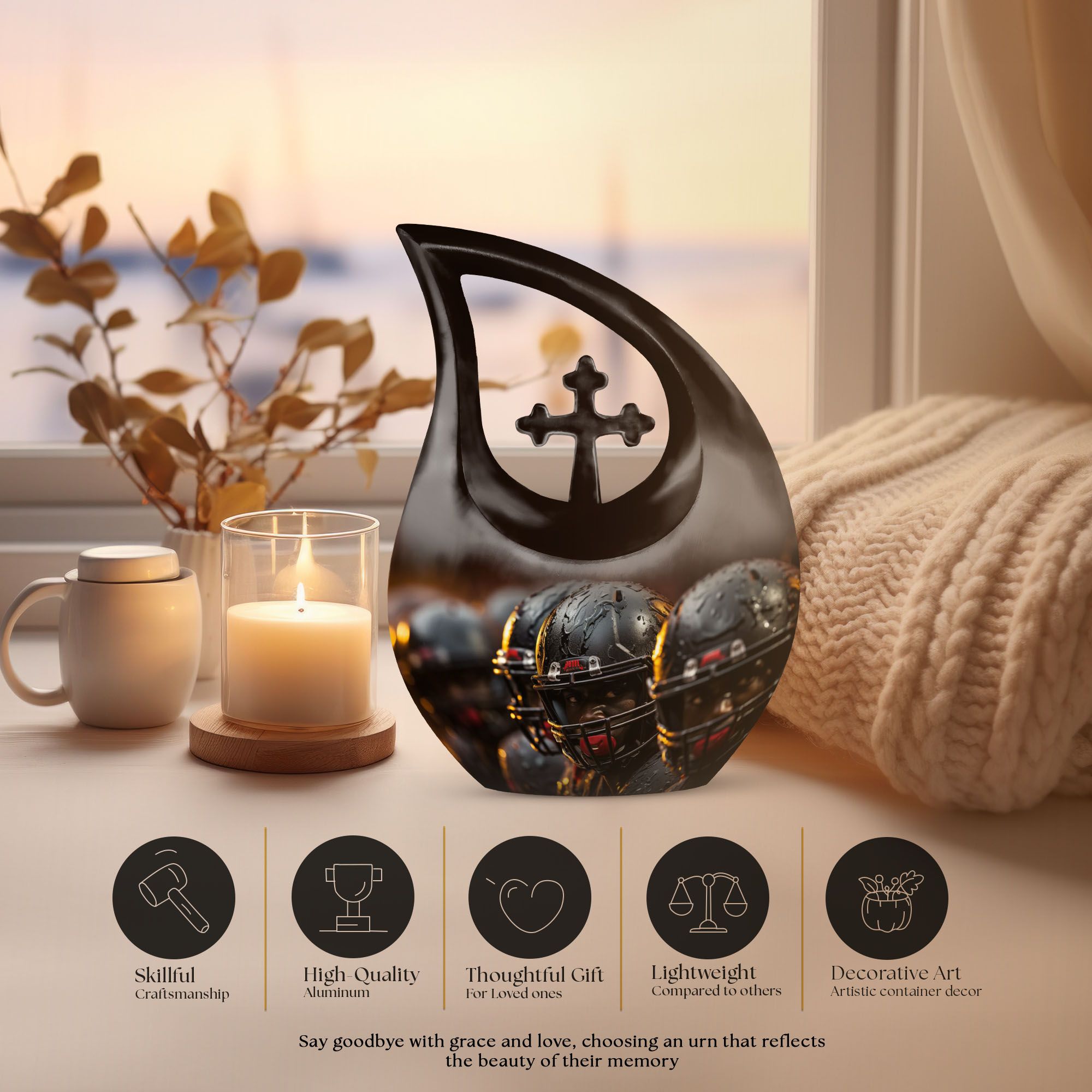 Reflect your love for the game with our meticulously crafted Football Urn, embracing the spirit of your departed one who held an unrivaled passion for football. This large cremation urn stands at a dignified 10 inches, enveloped in a Cross Drop theme that exudes solemnity and class. Crafted from durable aluminium, this robust urn weighs 3.3 pounds and boasts a generous capacity of 200 cubic inches, perfect for adults. To make this memory all the more personal, we offer customization options allowing you to engrave names on the urn, creating an everlasting epitaph. The package also includes a luxurious velvet pouch, assuring a dignified containment of the ashes. Opt for this tribute when searching for urns for ashes for adults or exploring cremation options for ashes. Great care has been taken to ensure this urn isn’t just a disposal option, but a commemoration of a life well lived, loved, and remembered.