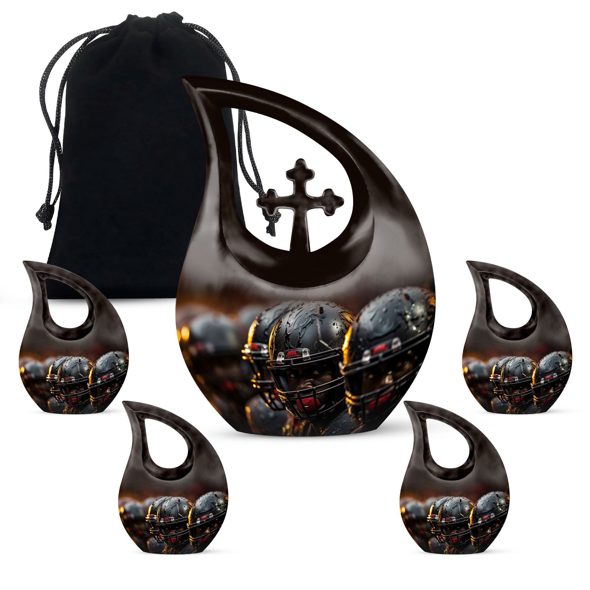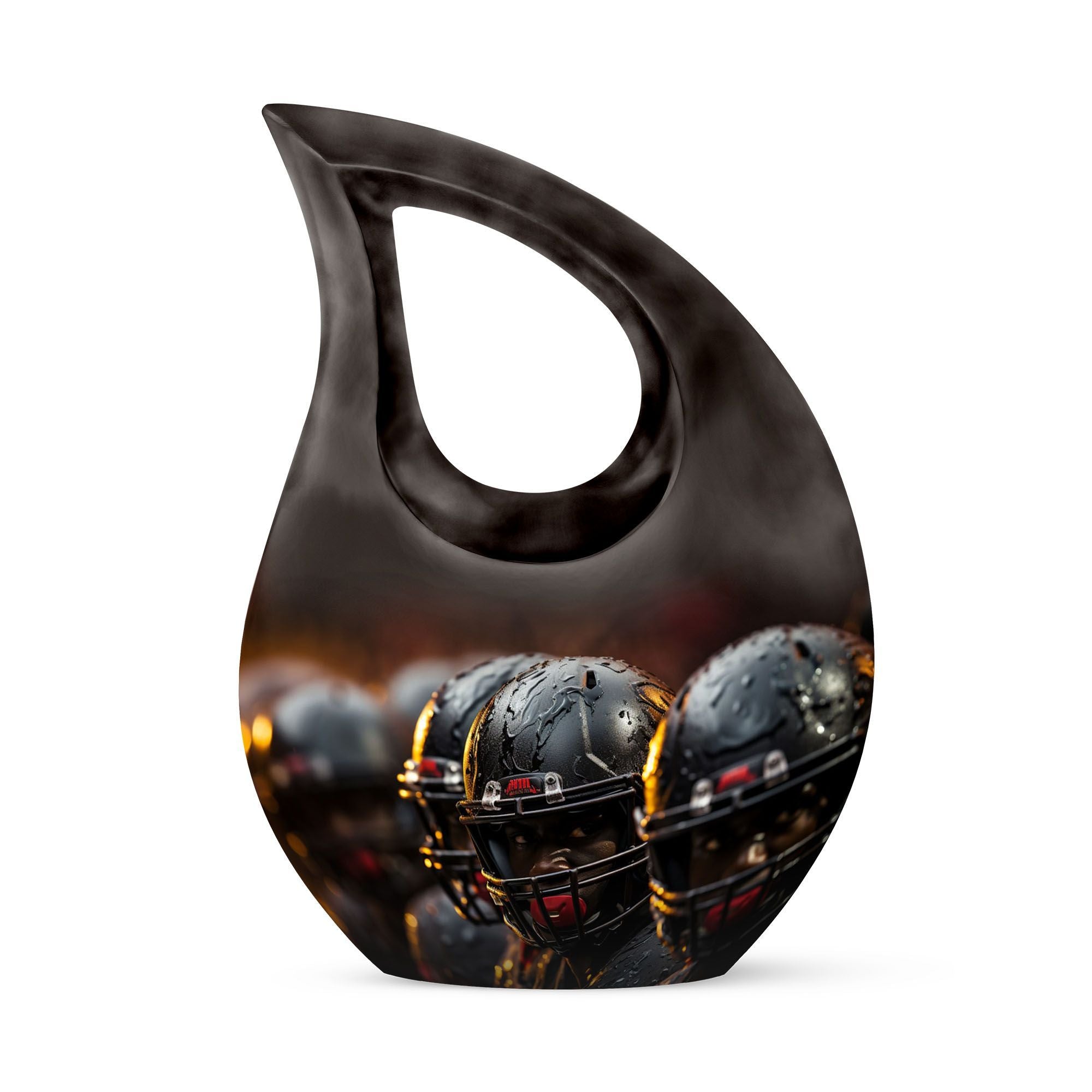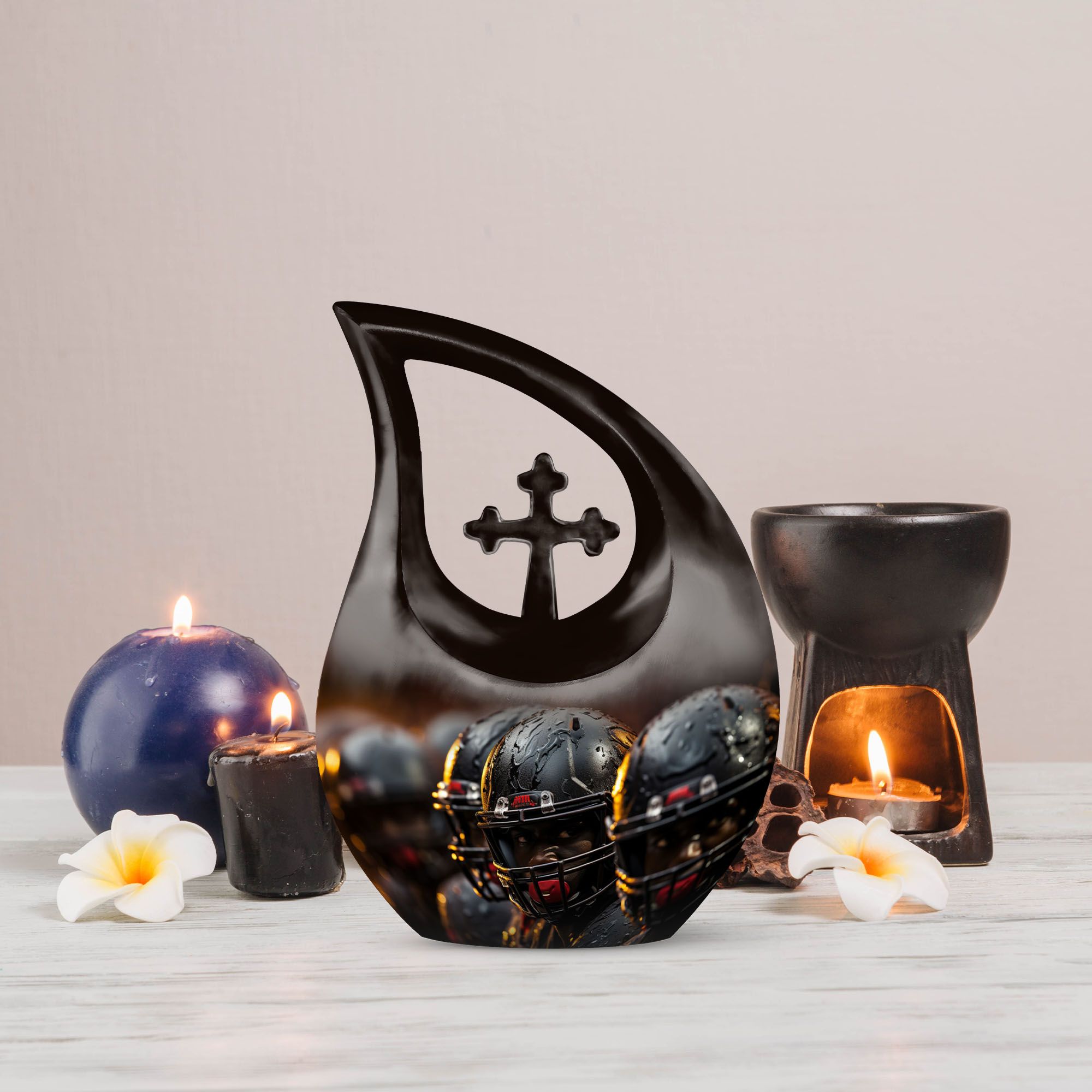 Reflect your love for the game with our meticulously crafted Football Urn, embracing the spirit of your departed one who held an unrivaled passion for football. This large cremation urn stands at a dignified 10 inches, enveloped in a Cross Drop theme that exudes solemnity and class. Crafted from durable aluminium, this robust urn weighs 3.3 pounds and boasts a generous capacity of 200 cubic inches, perfect for adults. To make this memory all the more personal, we offer customization options allowing you to engrave names on the urn, creating an everlasting epitaph. The package also includes a luxurious velvet pouch, assuring a dignified containment of the ashes. Opt for this tribute when searching for urns for ashes for adults or exploring cremation options for ashes. Great care has been taken to ensure this urn isn’t just a disposal option, but a commemoration of a life well lived, loved, and remembered.