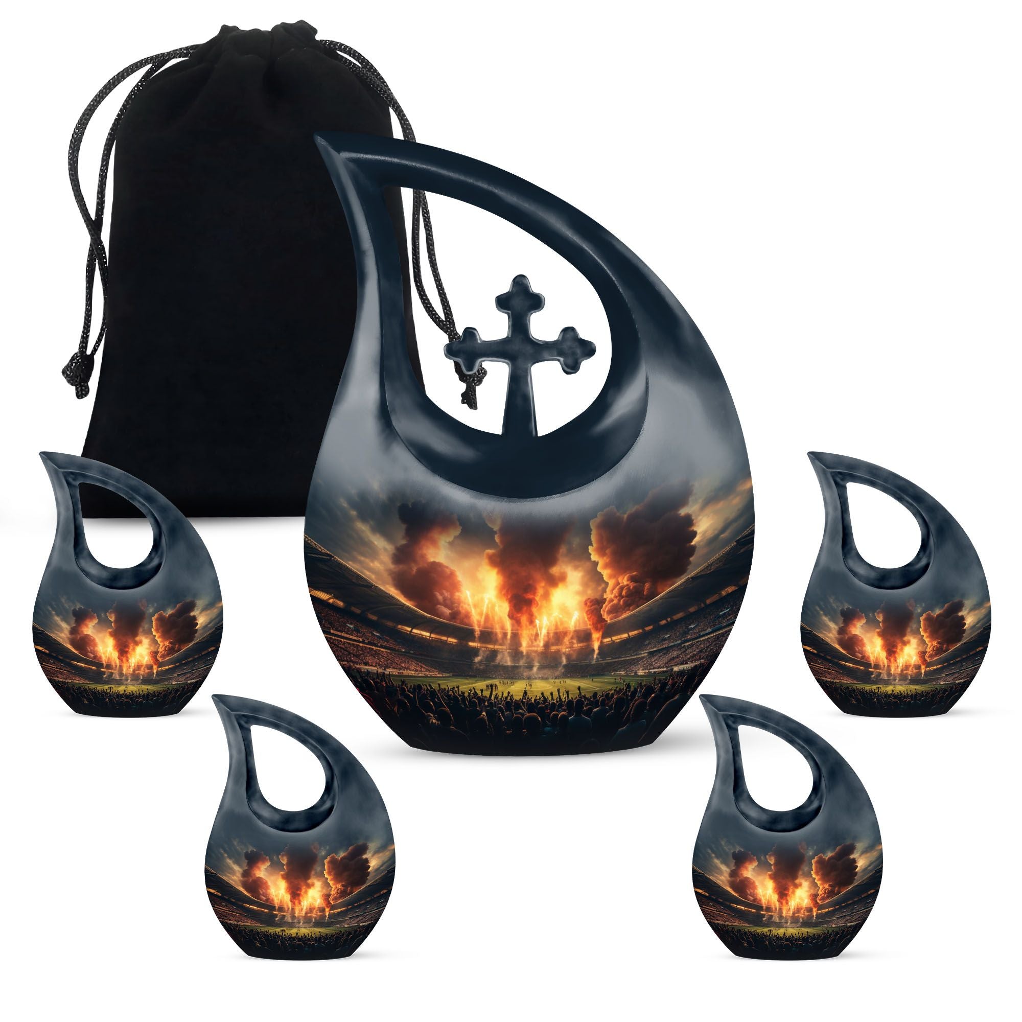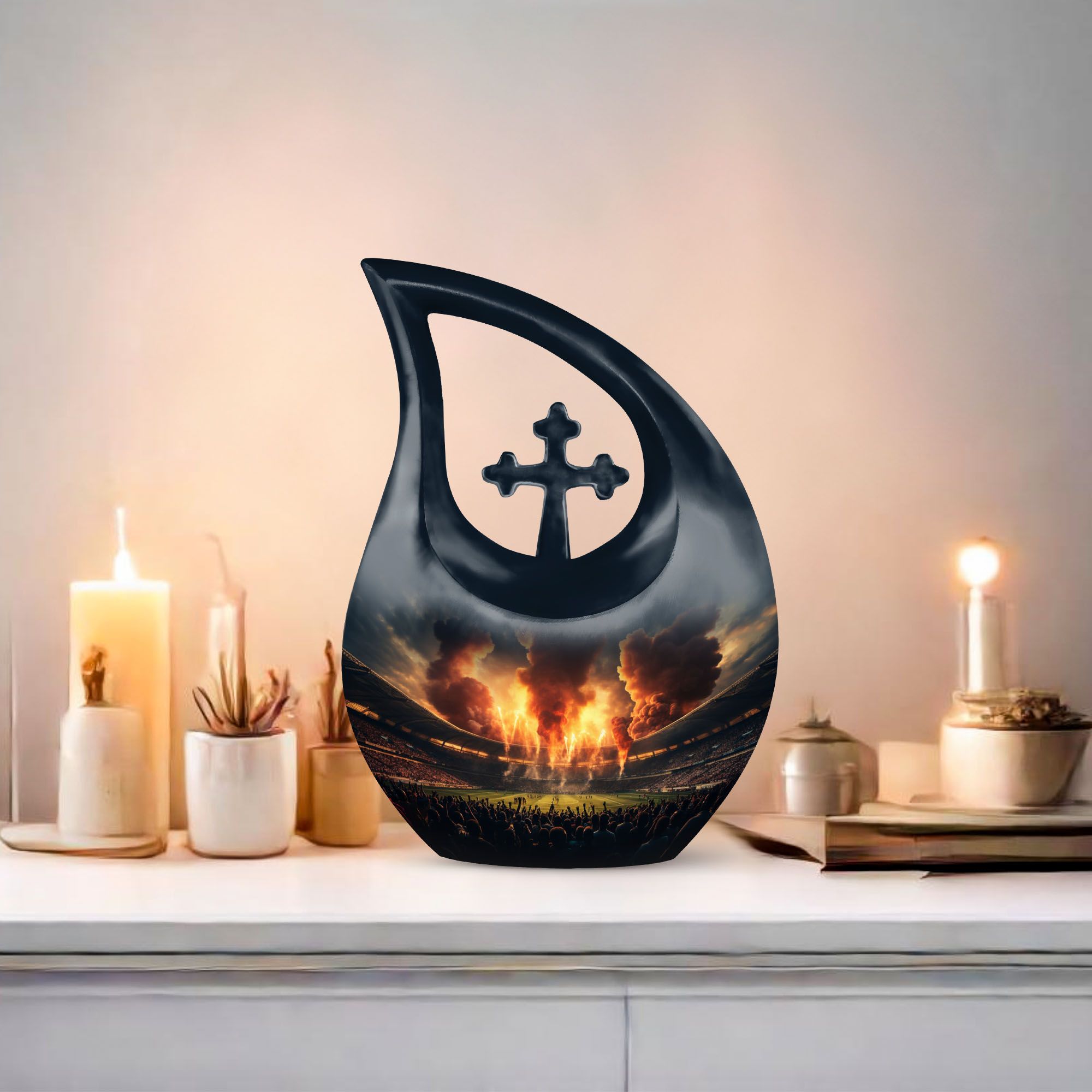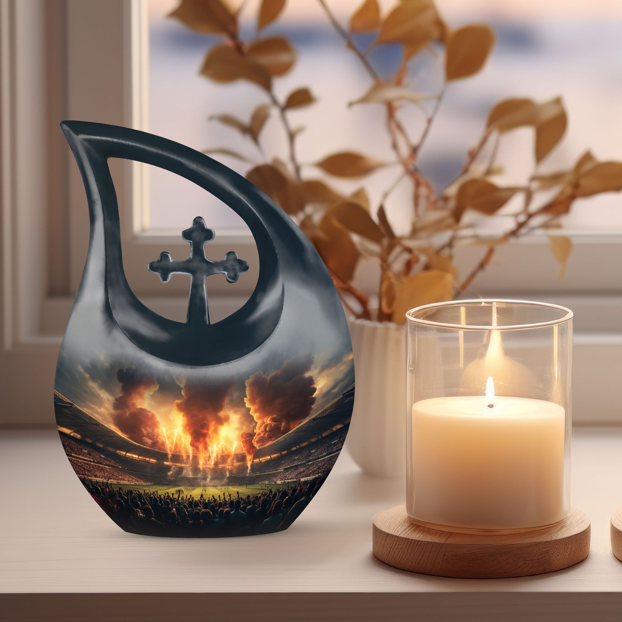 Expertly crafted from durable aluminum, this urn memorial for sale features a vivid stadium design illuminated by sunset tones, providing a meaningful resting place for your loved one's ashes. The 10-inch adult-size capacity makes it a dependable choice among cremation urn for adult, adult cremation urn, and human cremation urn options. It also pairs perfectly with companion pieces such as cremation mini urn, cremation ashes keepsake, or complete cremation urns for human ashes adult set collections. Families wishing to distribute ashes among relatives can also combine this piece with cremation urns set or cremation ashes urns combo selections.