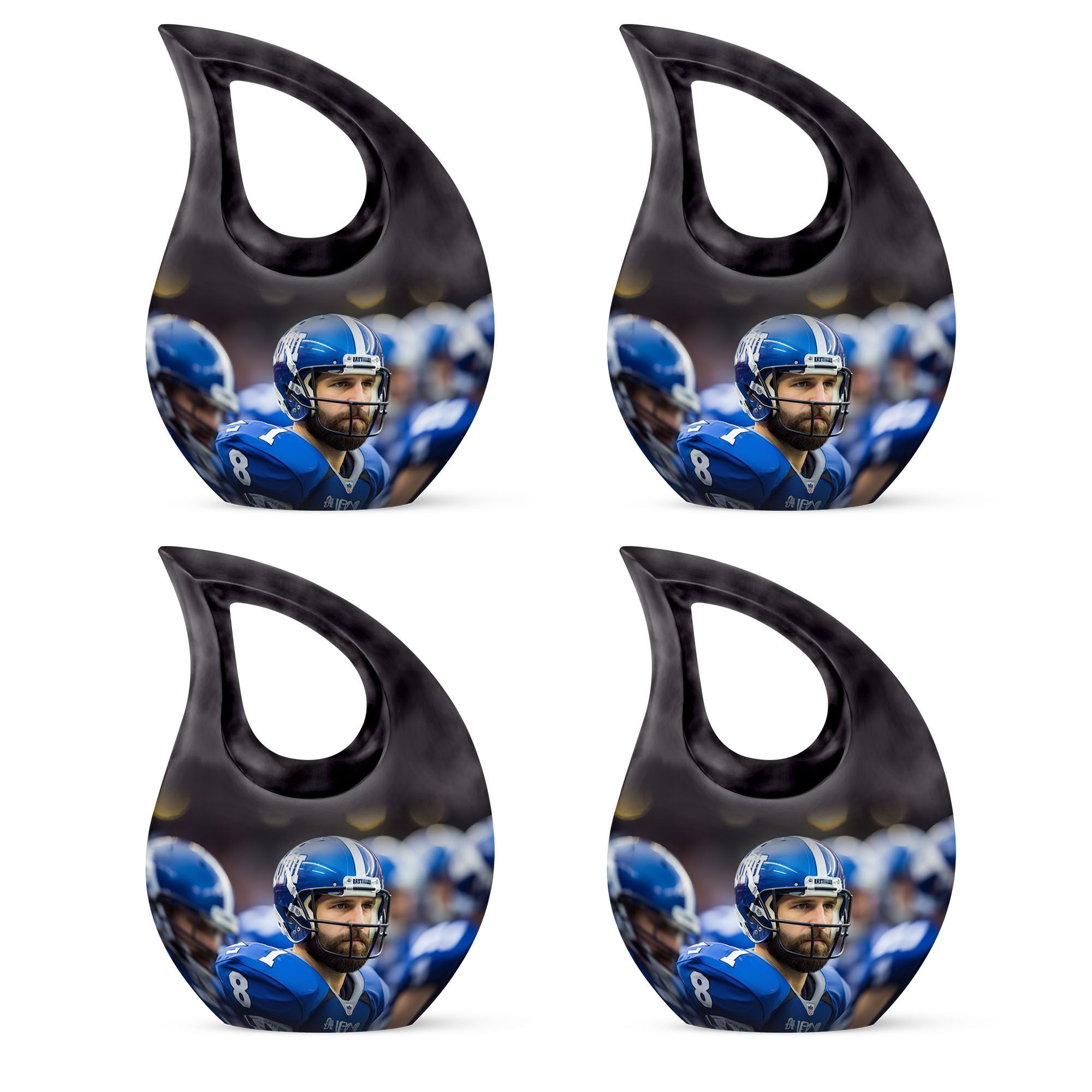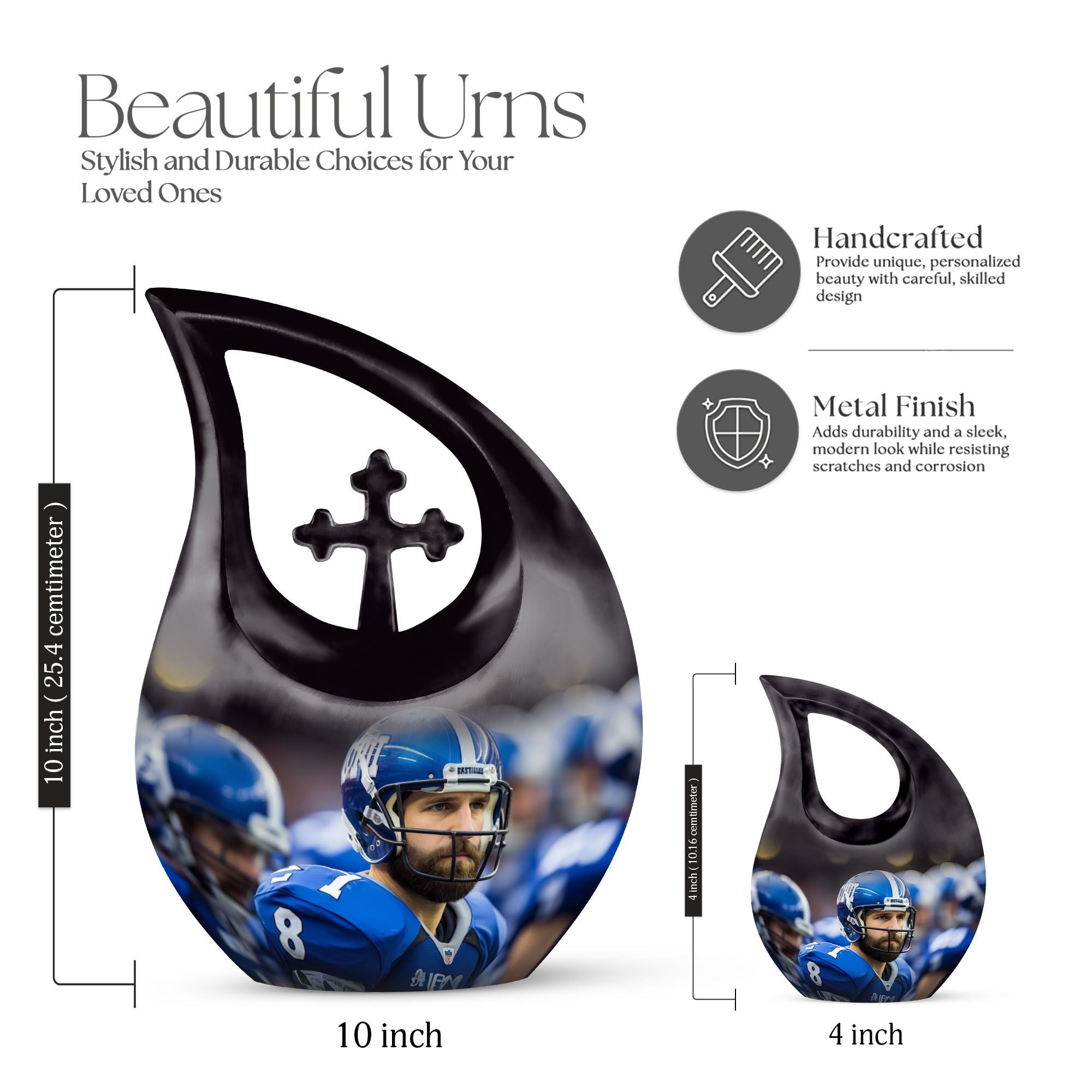 Presenting a uniquely representative collection of large aluminium 'Football Urn', a poignant piece of memorial ceremony supplies that balance aesthetics and emotions beautifully. This 10-inch human cremation urn has an appealing 'Cross Drop' design that speaks of subtlety and grace. The urn weighs a stable 3.3 pounds and can encapsulate a capacity of 200 cubic inches, making it a fitting tribute to your loved ones. Included in the package is a soft velvet pouch to secure the precious ashes. We offer the option to personalize this life-emblem with engraved names, adding that exclusive touch. Much more than just a cremation box for human ashes, this item is a testament of shared memories and deep-rooted affections. Our urn broadens the choice for companion cremation urns, gives a tasteful option for personal urns, and adds to the pool of respectful urns to put ashes in. Mark your love, remember deeply, and let this Football Urn be a symbol of the times your heart has cheered for life.