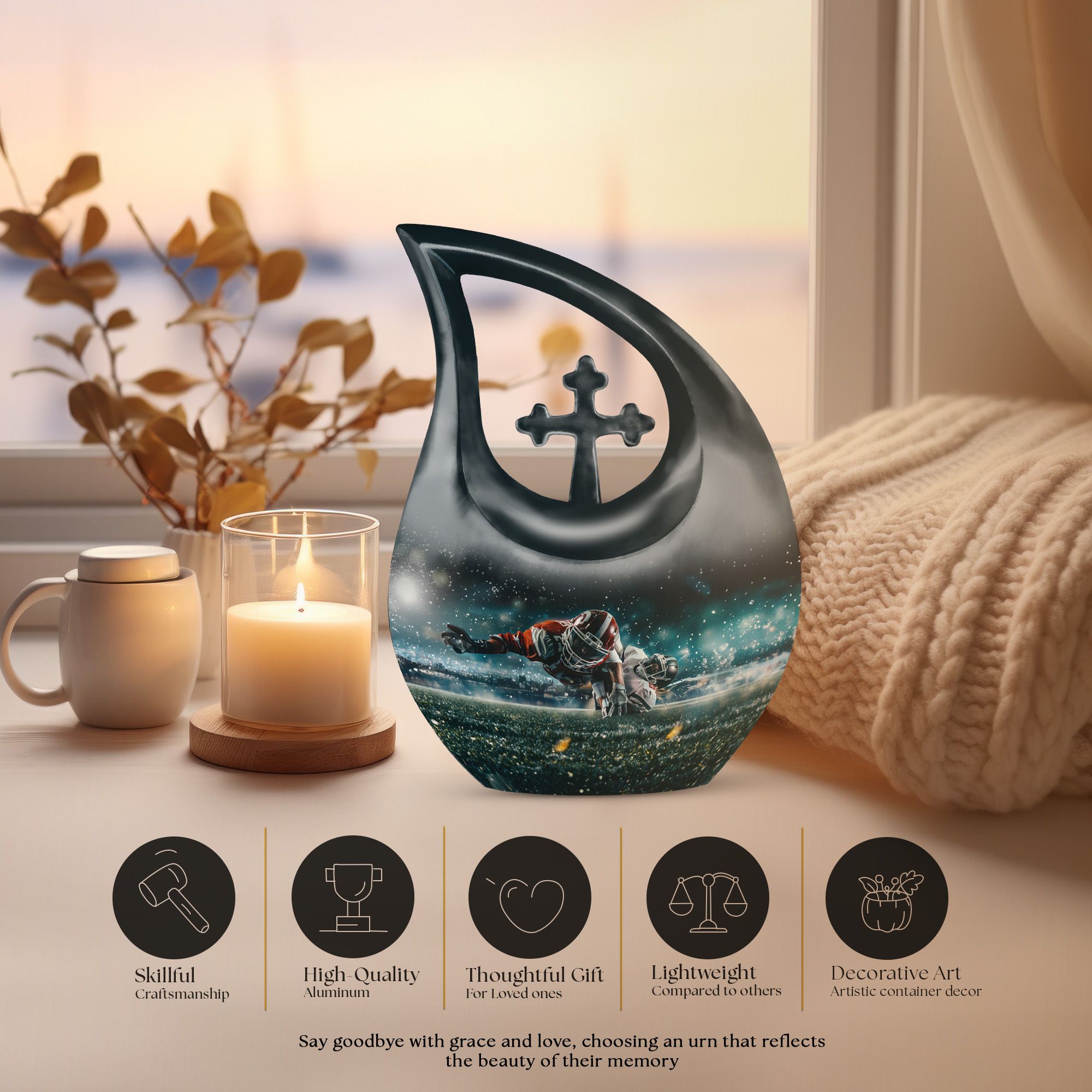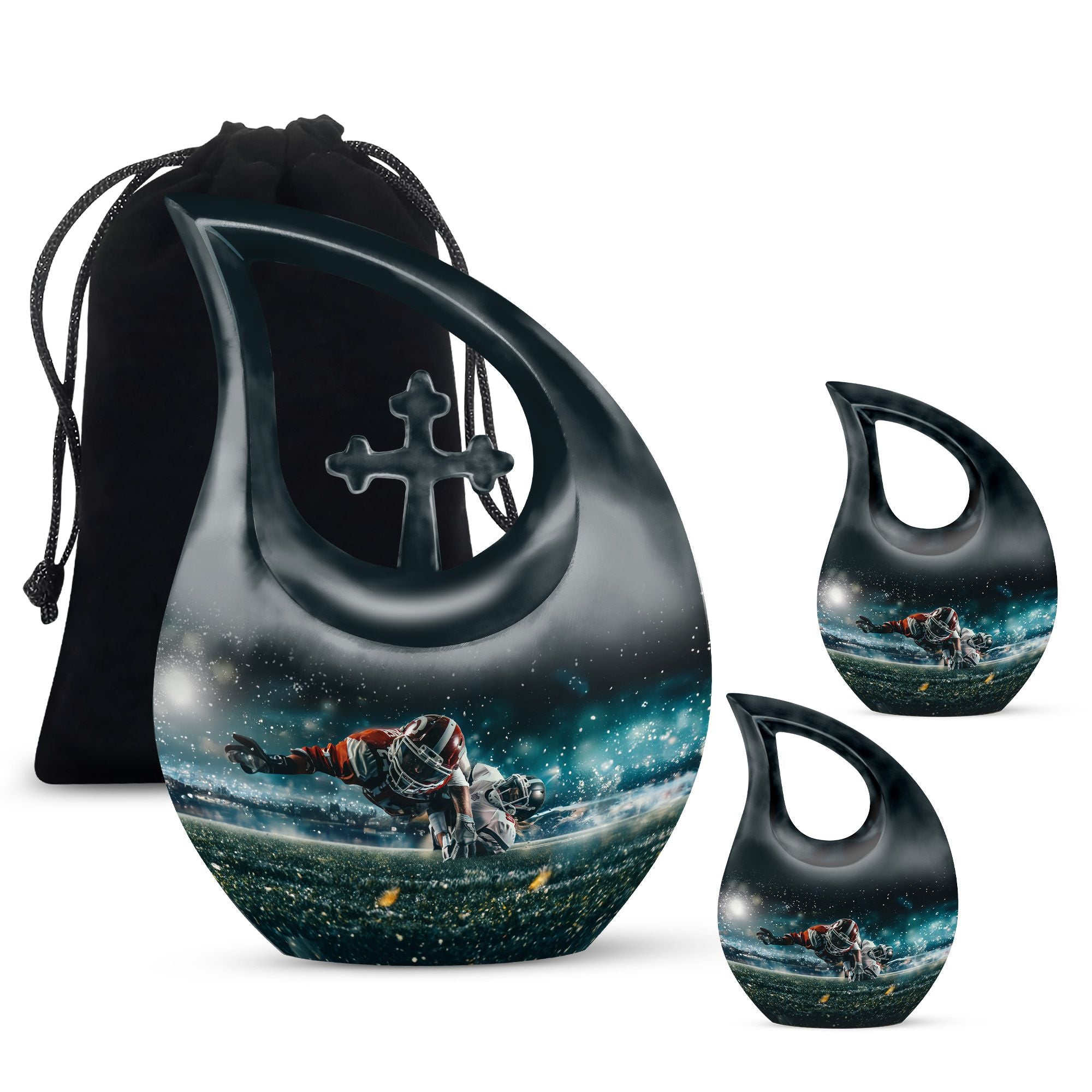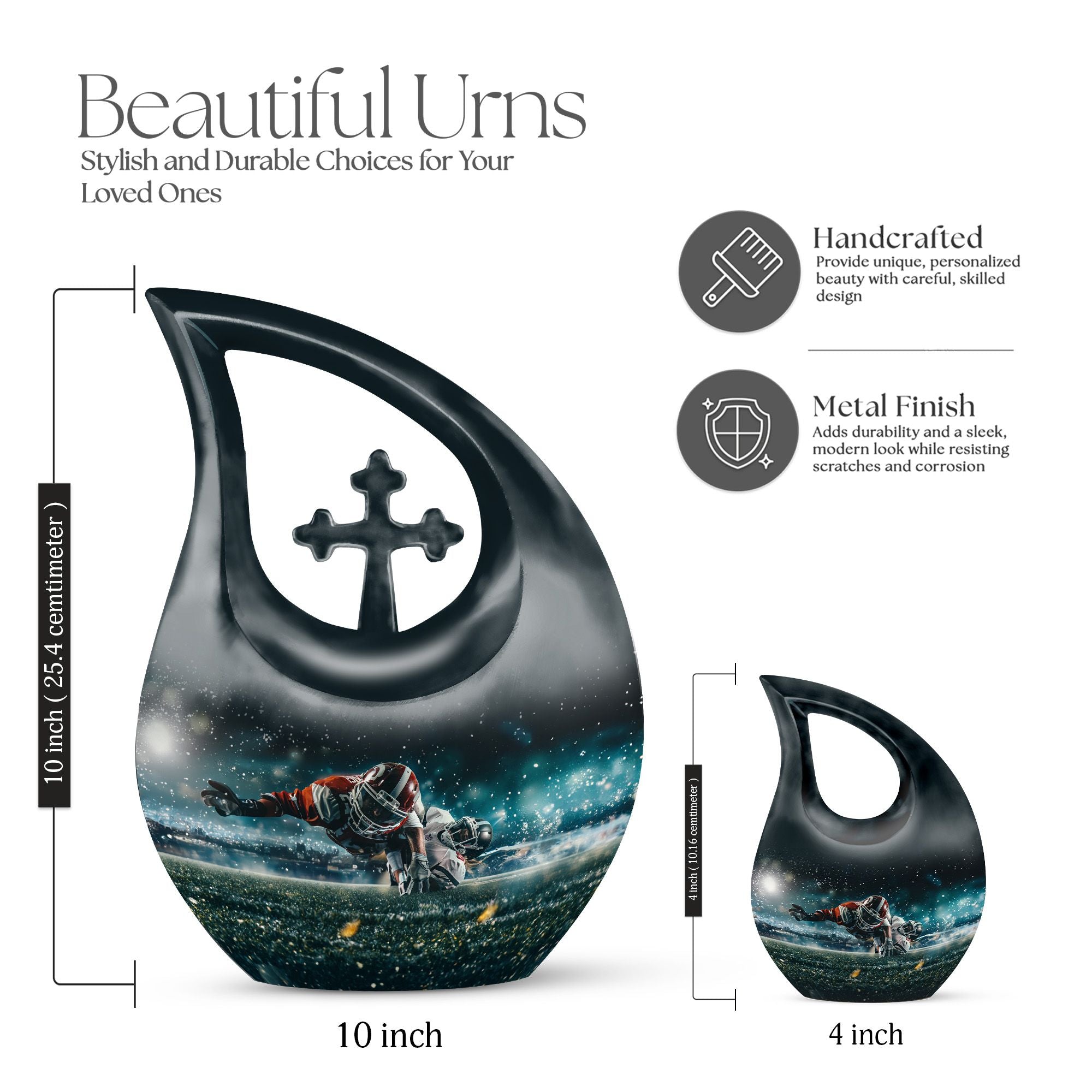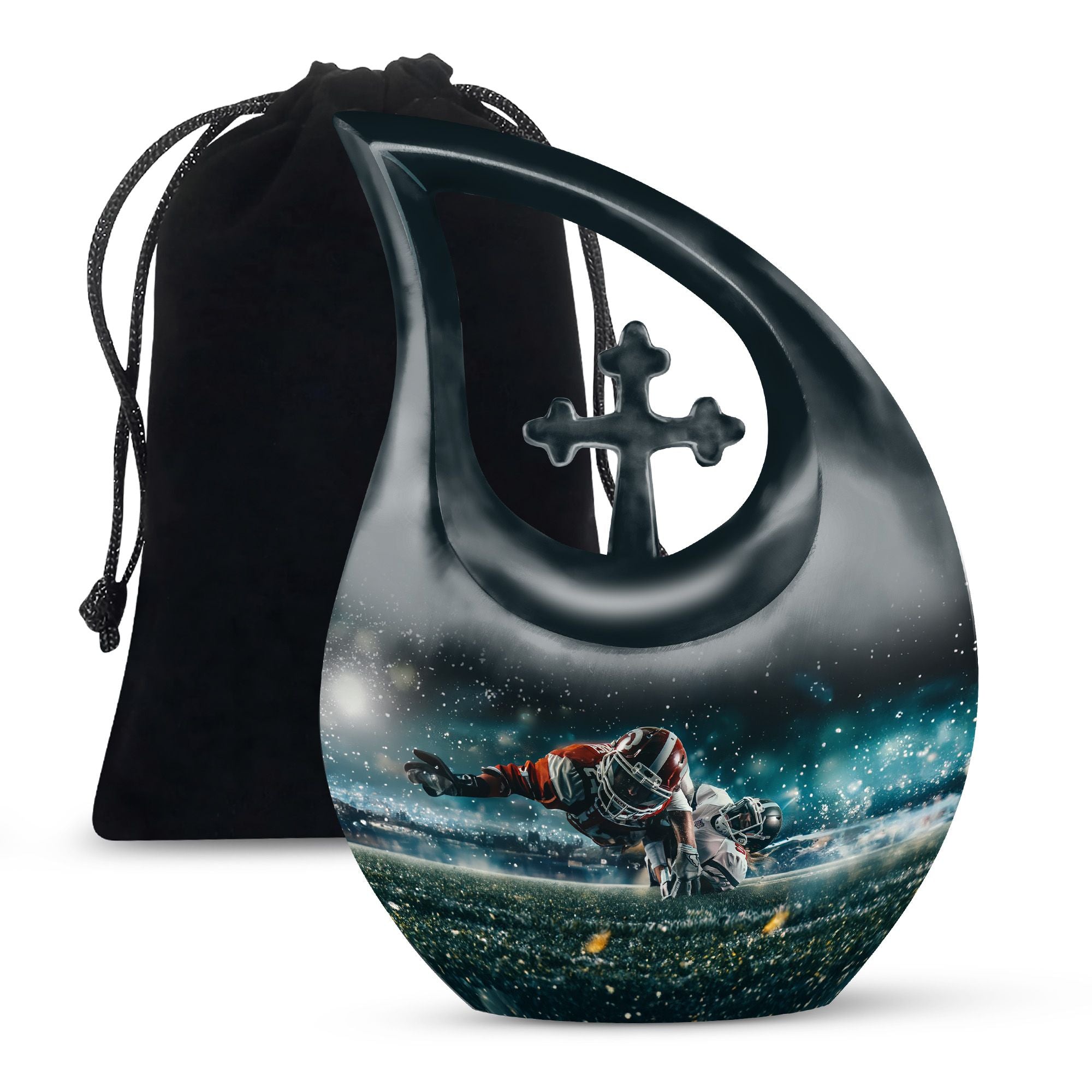 Evoke the sweet memories of your loved ones with our 10-inch Custom Mom Urn. Crafted with eloquence and authenticity, its aluminium build ensures durability and longevity, offering a permanent tribute to the one who means the world to you. It's a Footboll themed urn, featuring an ethereal Cross Drop URN design, speaking volumes of elegance and style in one sweeping glance. The urn weighs a sturdy 3.3 pounds, and stands at an impressive 10 inches in height. It boasts a capacity of 200 cubic inches, adequate to hold the ashes securely. As an added touch of respect, we provide a velvet pouch for the containment of ashes. There is also an option to personalize your tribute with engraved names, making this urn an essential pick for Memorial Ceremony Supplies. The keywords - Footboll Urn, Custom Mom Urn, Remembrance Urns For Ashes, Urns For Angels, Modern Urns For Ashes highlight its uniqueness and purpose, ensuring easy accessibility in your search.